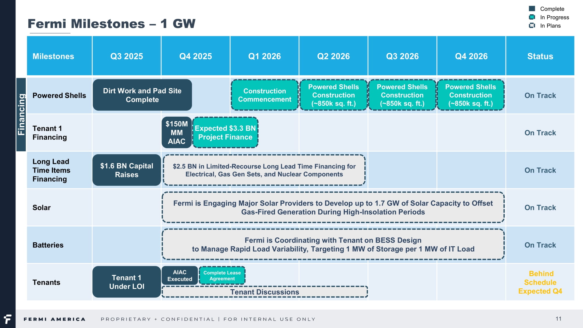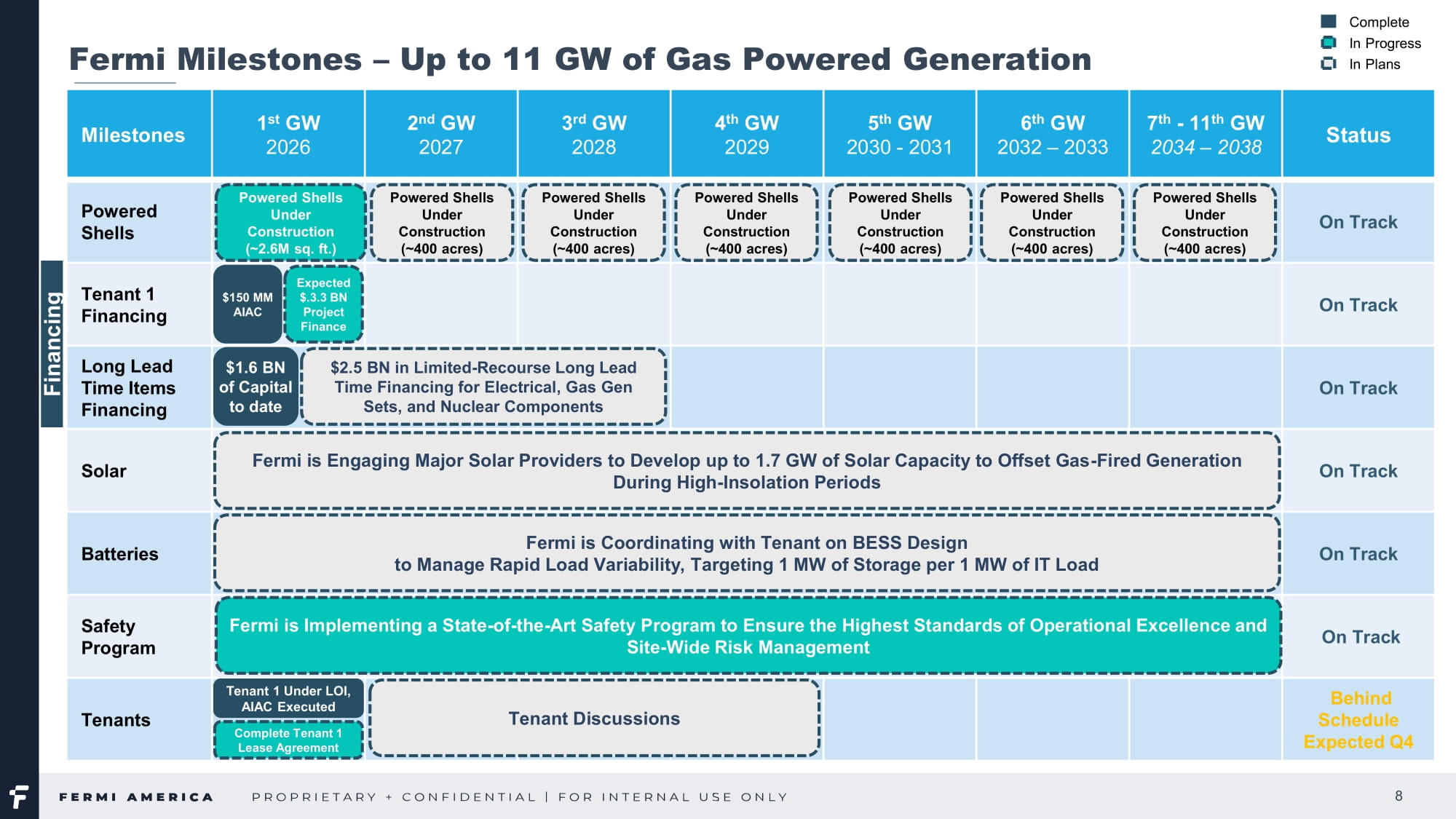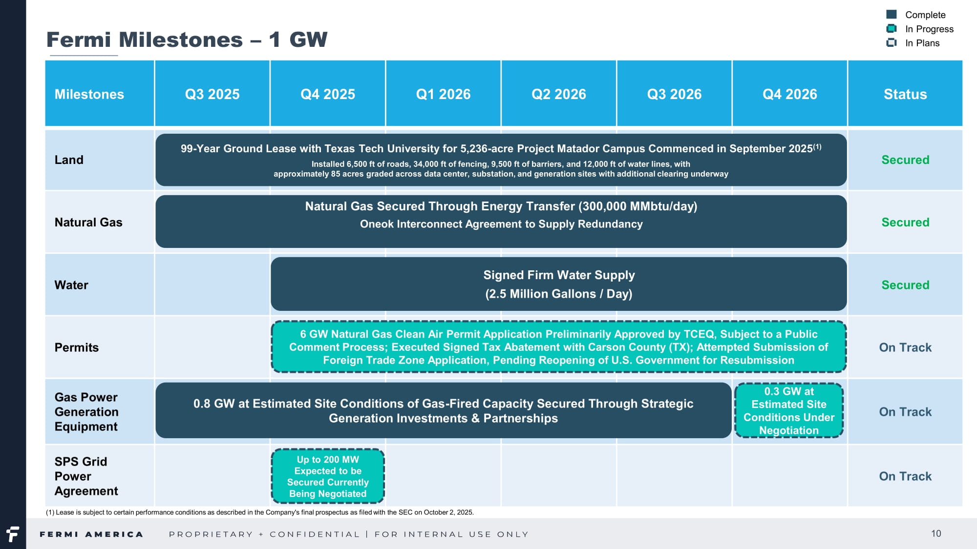 Taylor St., Suite 301 Amarillo, TX|FermiAmerica.com4、アメリカのエネルギーとAIインフラにおける新たな勢力として公共市場に参入するための位置づけ: 土地 - キャンパスのリース開始 第3四半期中、テキサス工科大学システムとのプロジェクト・マタドール・キャンパスのリースが正式に開始された。このマイルストーンにより、99年間のリースが正式に開始され、当社はパンハンドルの敷地を長期的に管理することになる。プロジェクト・マタドール・キャンパスでは、約5,200エーカーの敷地で物理的な開発を開始するため、敷地内での地質調査を開始した。初期整地面積は約400万平方フィート(約85エーカー相当)で、土壌調査、締固め試験、その他の初期建設準備が順調に進んでいる。現在までに、6,500フィートの道路、34,000フィートのフェンス、9,500フィートのバリア、12,000フィートの水道管を設置した。データセンター、変電所、発電所の各敷地では約85エーカーの整地が完了し、現在さらに整地が進行中である。これらの活動により、2026年末までに最初の電力を供給するという目標に向かって順調に進んでいる。 発電設備 - リードタイムの長いもの リードタイムの長い設備や資材を確保するため、フェルミ・アメリカは重要な発電資産を固定し、建設スケジュールのリスクを軽減する一連の重要な取引を実行した。6月と7月には、合計580MWを超える容量の産業用ガスタービン9基(シーメンス製6基とGE製3基)を蒸気タービンやその他の発電所設備とともに2025年に納入するために取得した。さらに、サウスウエスタン・パブリック・サービス・カンパニー(SPS)は、2026年と2027年に約200MWの発電容量を納入することを約束した。当初は、同公社の電力供給ポートフォリオから86MWの偶発的な固定電力と、SPSが契約している移動式発電ベンダーネットワークとの関係を通じて供給される114MWの発電容量から構成される。また、操業初期の柔軟性をさらに高めるため、135MWのTM2500ユニットのリース契約を締結し、プロジェクト・マタドール・キャンパスの規模が拡大するにつれて、迅速なバックアップ電力を供給するため、さらに270MWをレンタルまたは購入する予定である。また9月には、シーメンス・エナジー社との間で、2026年の納入と2027年の初期運転に向け、合計1GWを超える複合火力発電容量となるFクラスSGT6-5000Fガスタービン3基の納入に関するLOIを締結した。SPSのコミットメント、シーメンス・エナジーの趣意書(LOI)、以前に買収したタービン資産、2025年第4四半期に確保した追加発電設備(最近の動きを参照)を合わせると、フェルミは現在、約2.2ギガワットのガス火力発電を確保またはLOI下に置いていることになる。この実績は、当初の目標であった2026年の1ギガワットを上回るもので、プロジェクト・マタドールが計画している総発電容量11ギガワットの約20%に相当する。620 S.