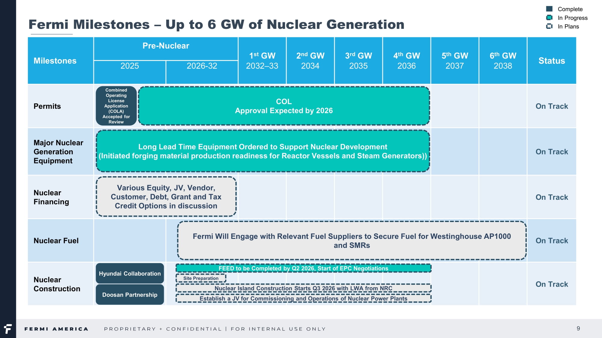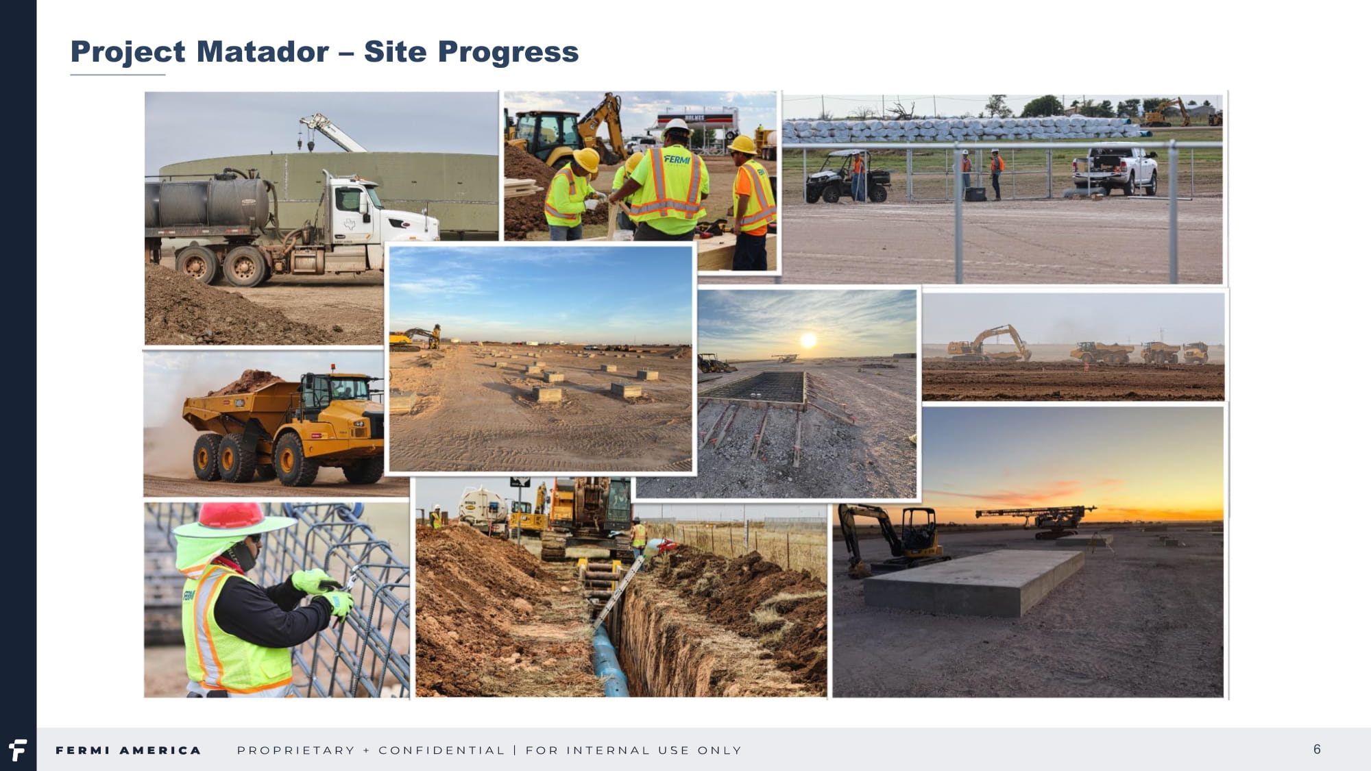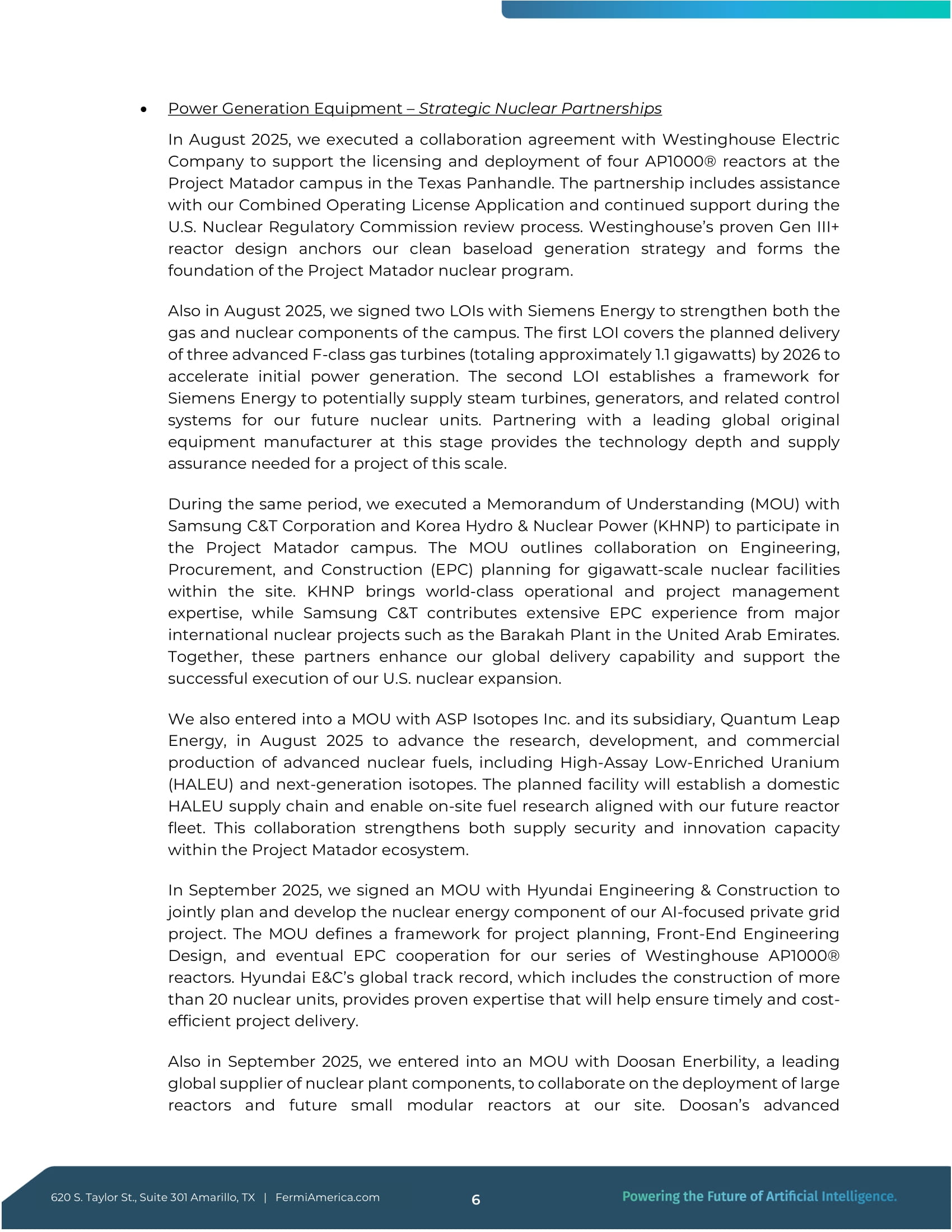 Taylor St., Suite 301 Amarillo, TX | FermiAmerica.com 5 発電設備 - 戦略的原子力パートナーシップ 2025年8月、当社はウェスチングハウス・エレクトリック社と、テキサス州パンハンドルのプロジェクト・マタドール・キャンパスにおける4基のAP 1000 ®原子炉の許認可取得と配備を支援するための協力協定を締結しました。このパートナーシップには、当社の複合運転許可申請に関する支援と、米国原子力規制委員会の審査過程における継続的な支援が含まれる。米国原子力規制委員会の審査過程における継続的な支援も含まれます。ウェスチングハウスの実績あるIII+世代原子炉の設計は、当社のクリーンなベースロード発電戦略を支えるものであり、プロジェクト・マタドール原子力プログラムの基盤を形成するものです。また2025年8月には、シーメンス・エナジー社と2つのLOIに調印し、ガスと原子力の両コンポーネントを強化しました。最初のLOIは、初期発電を加速するために、2026年までに3基の先進的なF級ガスタービン(合計約1.1ギガワット)を納入する計画です。2つ目のLOIは、シーメンス・エナジーが当社の将来の原子力ユニットに蒸気タービン、発電機、関連制御システムを供給する可能性のある枠組みを確立するものである。この段階で世界有数の相手先商標製品メーカーと提携することで、この規模のプロジェクトに必要な技術の深さと供給保証を提供する。同期間中、当社はサムスンC&Tおよび韓国水力原子力発電(KHNP)と、プロジェクト・マタドール・キャンパスに参加するための覚書(MOU)を締結した。このMOUは、敷地内のギガワット規模の原子力施設の設計・調達・建設(EPC)計画に関する協力の概要を示すものである。KHNPは、世界クラスの運営およびプロジェクト管理の専門知識をもたらし、サムスンC&Tは、アラブ首長国連邦のバラカ・プラントなどの主要な国際原子力プロジェクトでの豊富なEPC経験を提供します。これらのパートナーは共に、当社のグローバルな供給能力を強化し、米国の原子力発電所拡張の成功をサポートします。また当社は2025年8月、ASPアイソトープス社およびその子会社であるクオンタム・リープ・エナジー社と、高純度低濃縮ウラン(HALEU)や次世代アイソトープを含む先進核燃料の研究・開発・商業生産を推進するための覚書を締結した。計画中の施設は、国内のHALEU供給チェーンを確立し、将来の原子炉群に沿ったオンサイト燃料研究を可能にする。この協力により、プロジェクト・マタドールのエコシステムにおける供給セキュリティとイノベーション能力の両方が強化される。当社は2025年9月、AIに焦点を当てたプライベート・グリッド・プロジェクトの原子力コンポーネントを共同で計画・開発するため、現代建設とMOUを締結した。このMOUは、ウェスチングハウスのAP 1000 ®原子炉シリーズのプロジェクト計画、フロントエンドエンジニアリング設計、最終的なEPC協力の枠組みを定義するものです。ヒュンダイE&Cは、20基以上の原子力発電所の建設を含む世界的な実績があり、タイムリーでコスト効率の高いプロジェクト遂行に役立つ専門知識を提供している。また2025年9月には、世界有数の原子力プラント部品サプライヤーである斗山エナビリティと、大型原子炉と将来の小型モジュール式原子炉の当社サイトへの配備に関する協力覚書を締結した。斗山の先進的な620S.