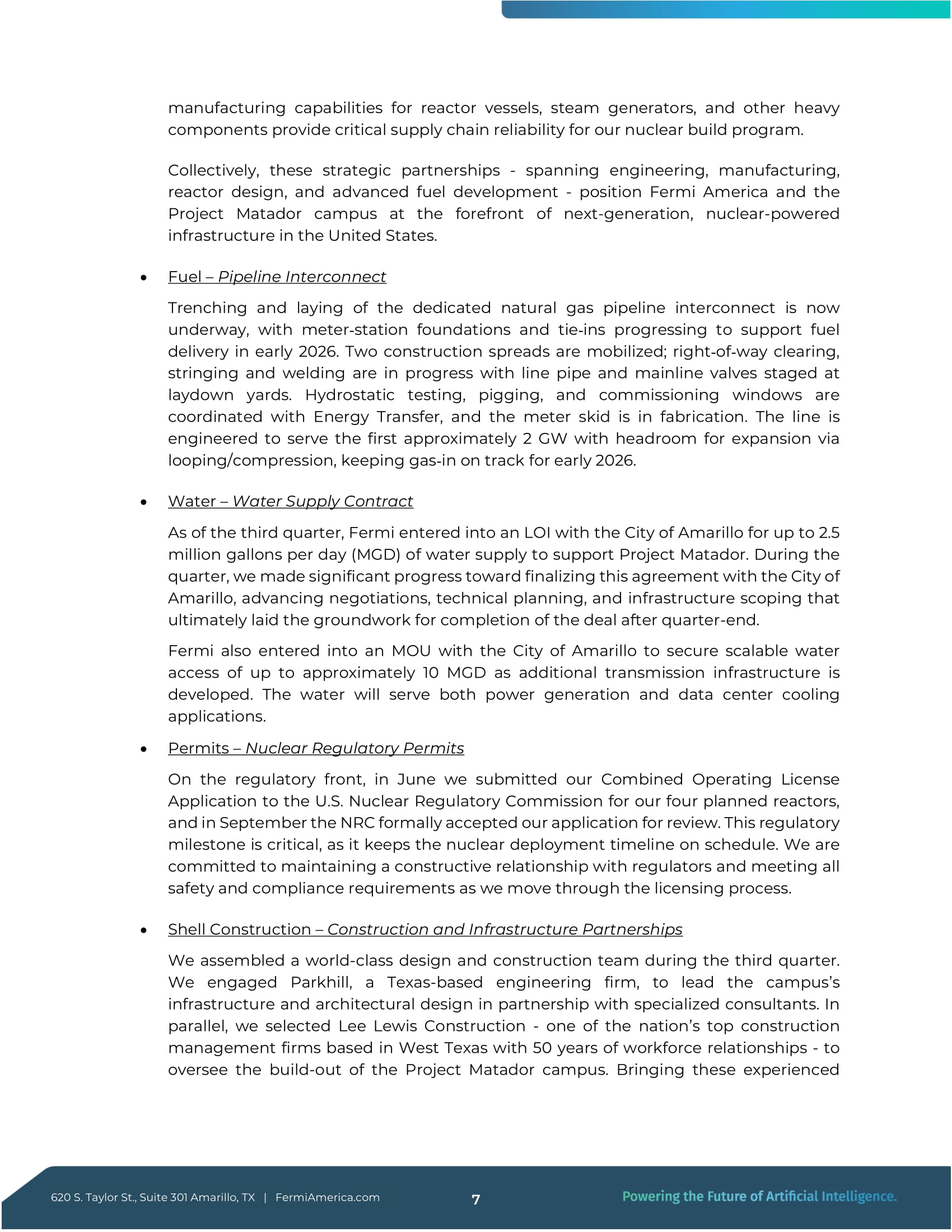 Taylor St., Suite 301 Amarillo, TX|FermiAmerica.com原子炉容器、蒸気発生器、およびその他の重いコンポーネントのための6つの製造能力は、私たちの原子力建設プログラムに重要なサプライチェーンの信頼性を提供します。エンジニアリング、製造、原子炉設計、および新型燃料開発にまたがるこれらの戦略的パートナーシップを総合すると、フェルミ・アメリカとプロジェクト・マタドール・キャンパスは、米国の次世代原子力インフラストラクチャーの最前線に位置することになります。 燃料-パイプライン相互接続専用天然ガスパイプラインのトレンチ掘削と敷設が現在進行中で、メーターステーションの基礎工事と2026年初頭の燃料供給をサポートするための接続工事が進行中である。2つの建設用スプレッドが動員され、路側帯の整地、ストリンギング、溶接が進行中で、ラインパイプとメインラインバルブはレイダウンヤードでステージングされている。静水圧試験、ピギング、試運転はエナジートランスファー社と調整中で、メータースキッドは製作中である。ラインは、ループ/圧縮を介して拡張するためのヘッドルームを持つ最初の約2 GWにサービスを提供するために設計されており、ガス - 2026年初頭の軌道を維持する。 水供給契約 第3四半期時点で、フェルミ社はアマリロ市と日量250万ガロン(MG)までのLOIを締結した。プロジェクト・マタドールを支援するため、日量500万ガロン(MGD)の給水契約を締結した。当四半期中、当社はアマリロ市とのこの契約の最終化に向けて大きく前進し、交渉、技術計画、インフラ・スコーピングを進め、最終的に当四半期終了後の契約完了に向けた基盤を築いた。フェルミはまた、アマリロ市とMOUを締結し、追加の送電インフラが開発されるにつれて、最大約10 MGDのスケーラブルな水利用を確保する。この水は発電とデータセンター冷却の両方に利用される。 許可 - 原子力規制当局の許可 規制面では、6月に米国原子力規制委員会(NRC)に、当社が計画している4基の発電所の複合運転許可申請を提出した。そして9月、NRCは当社の申請書を正式に受理した。この規制上のマイルストーンは、原子力発電所配備のスケジュールを維持する上で非常に重要である。私たちは、規制当局と建設的な関係を維持し、許認可プロセスを進める中で、すべての安全およびコンプライアンス要件を満たすことを約束します。 シェルの建設 - 建設およびインフラストラクチャー・パートナーシップ 当社は第3四半期中に世界クラスの設計・建設チームを結成した。テキサス州を拠点とするエンジニアリング会社パークヒル(Parkhill)に、専門コンサルタントと共同でキャンパスのインフラと建築設計を担当してもらうことにした。また、プロジェクト・マタドール・キャンパスの建設監督には、テキサス州西部を拠点とし、50年にわたる協力関係を持つ全米トップクラスの建設管理会社、リー・ルイス・コンストラクションを起用した。これらの経験豊富な620 S.