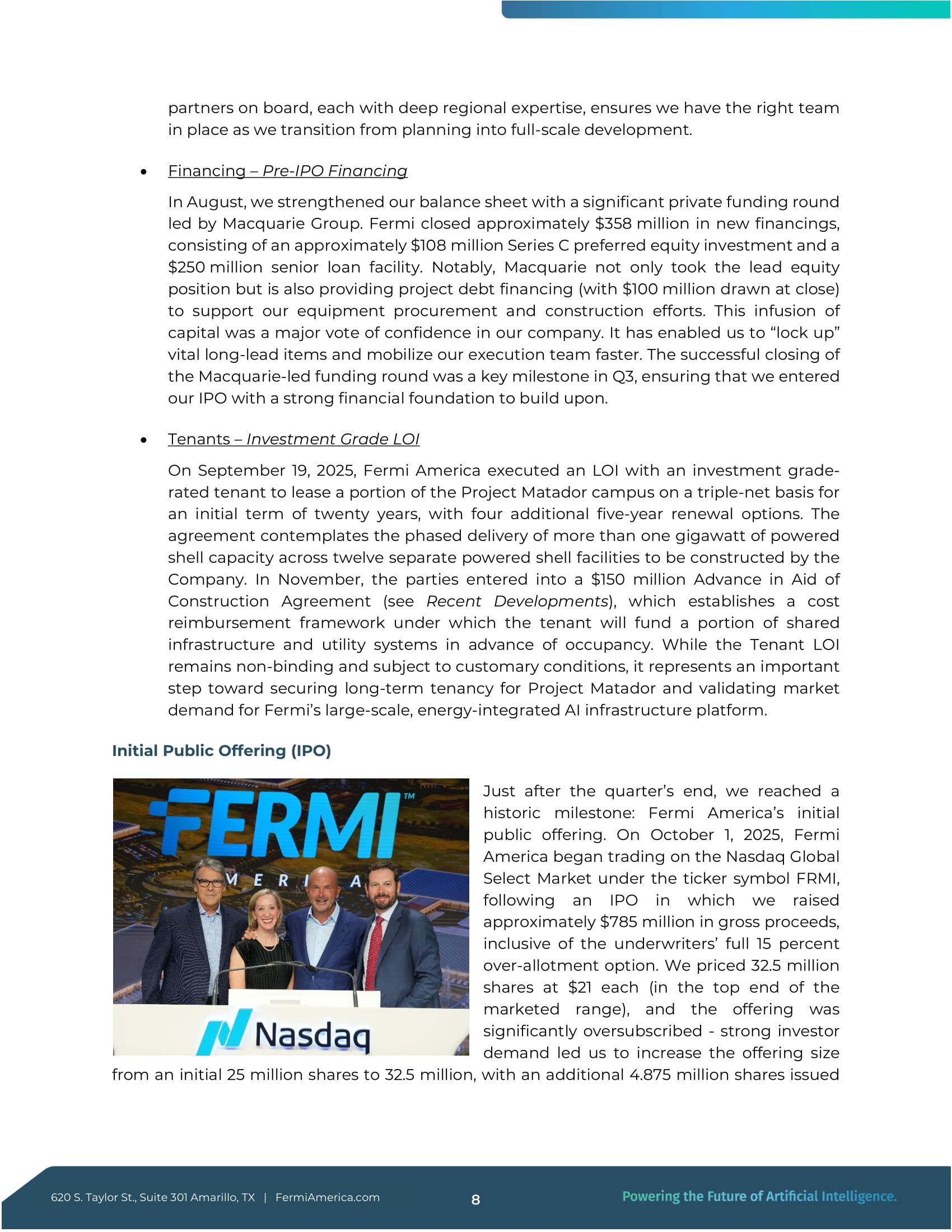 Taylor St., Suite 301 Amarillo, TX | FermiAmerica.com 各地域に深い専門知識を持つ7人のパートナーが参加することで、計画から本格的な開発へと移行する際に適切なチームを編成することができる。 資金調達 - IPO前の資金調達 8月、マッコーリーグループが主導する重要な民間資金調達ラウンドにより、バランスシートが強化された。フェルミは、約3億5800万ドルの新規資金調達を完了し、その内訳は、シリーズC優先株式投資(約1億800万ドル)とシニア・ローン・ファシリティ(約2億5000万ドル)であった。特筆すべきは、マッコーリーがリード・エクイティ・ポジションを取っただけでなく、設備調達と建設作業を支援するためのプロジェクト・デット・ファイナンス(クローズ時に1億ドルを融資)を提供したことである。この資本注入は、当社に対する大きな信任投票であった。この資金注入により、当社は重要な長期リードアイテムを「固定」し、実行チームを迅速に動員することができるようになった。マッコーリー主導の資金調達ラウンドが成功裏に終了したことは、第3四半期における重要なマイルストーンであり、当社は強固な財務基盤の上にIPOを迎えることができました。 テナント-投資適格のLOI 2025年9月19日、フェルミ・アメリカは投資適格のテナントと、プロジェクト・マタドール・キャンパスの一部をトリプルネット方式でリースするLOIを締結した。この契約は、当社が建設する12の独立したパワードシェル施設において、1ギガワット以上のパワードシェル容量を段階的に提供することを想定している。この契約は、入居前にテナントが共有インフラとユーティリティ・システムの一部に資金を提供する費用償還の枠組みを確立するものである。このテナントLOIには拘束力はなく、慣例的な条件が適用されるものの、プロジェクト・マタドールの長期入居を確保し、フェルミの大規模なエネルギー統合AIインフラ・プラットフォームに対する市場の需要を検証するための重要な一歩となる。新規株式公開(IPO) 当四半期末の直後、フェルミ・アメリカの新規株式公開という歴史的な節目を迎えました。2025年10月1日、フェルミ・アメリカはナスダック・グローバル・セレクト・マーケットでFRMIというティッカーシンボルで取引を開始しました。価格は32 .500万株を1株21ドル(公開価格帯の上限)で売り出し、大幅な申し込み超過となった。500万株に増やし、さらに4 .8億7,500万株を発行した。