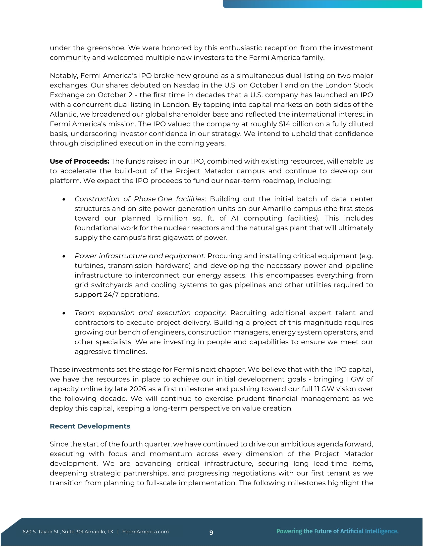 Taylor St., Suite 301 Amarillo, TX | FermiAmerica.com 8 under the greenshoe .投資コミュニティーからの熱烈な歓迎を光栄に思い、フェルミ・アメリカ・ファミリーに複数の新しい投資家を迎えることができました。特筆すべきは、フェルミ・アメリカのIPOが、2つの主要取引所への同時上場という新たな境地を開いたことである。当社の株式は、10月1日にアメリカのナスダックに、10月2日にロンドン証券取引所に上場されました。これは、アメリカ企業がロンドンに同時上場してIPOを行った数十年ぶりのことです。大西洋の両側の資本市場を利用することで、当社はグローバルな株主基盤を拡大し、フェルミ・アメリカの使命に対する国際的な関心を反映した。IPOは、完全希薄化ベースで約140億ドルという評価となり、当社の戦略に対する投資家の信頼を裏付けました。我々は、今後数年間、規律ある実行を通じてこの信頼を維持するつもりである。資金使途 : IPOで調達した資金と既存の資金を組み合わせることで、プロジェクト・マタドール・キャンパスの建設を加速し、プラットフォームの開発を継続することができます。IPO資金は、以下を含む当社の短期ロードマップに充当される予定です: フェーズ1施設の建設:アマリロ・キャンパスでのデータセンター構造および敷地内発電ユニットの初期ロットの構築(計画中の1500万平方フィートのAIコンピューティング施設への第一歩)。これには、最終的にキャンパスで最初のギガワット級の電力を供給する原子炉と天然ガスプラントの基礎工事も含まれる。 電力インフラと設備 :重要機器(タービン、送電ハードウェアなど)の調達と設置、エネルギー資産を相互接続するために必要な電力およびパイプライン・インフラの開発。これには、送電網の配電所や冷却システムからガスパイプライン、24時間365日の操業を支えるために必要なその他のユーティリティまで、あらゆるものが含まれる。 チームの拡大と実行能力:プロジェクト遂行のため、専門家や請負業者を増員する。このような大規模なプロジェクトの建設には、エンジニア、建設管理者、エネルギー・システム・オペレーター、その他の専門家を増やす必要があります。私たちは、積極的なスケジュールを確実に守るため、人材と能力に投資しています。これらの投資は、フェルミの次の章のための舞台を整えるものです。IPO資本により、最初のマイルストーンとして2026年後半までに1GWの発電容量をオンライン化し、その後10年間で11GWのビジョンを達成するという、初期の開発目標を達成するためのリソースが整ったと考えています。当社は、価値創造という長期的視野に立ちながら、この資本を投入する際にも慎重な財務管理を続けていく。最近の動向 第4四半期の開始以来、当社はプロジェクト・マタドール開発のあらゆる面で集中力と勢いをもって実行し、意欲的な計画を推進し続けてきました。重要なインフラ整備を進め、リードタイムの長い案件を確保し、戦略的パートナーシップを深め、最初のテナントとの交渉を進め、計画から本格的な実施へと移行している。以下のマイルストーンは、620 S. Taylor St., Suite 301 Amarillo, TX | FermiAmerica.com 9 フェルミ・アメリカを2026年の大規模建設と初期操業に向けて位置づけるにあたり、達成された具体的な進捗を強調したものです。