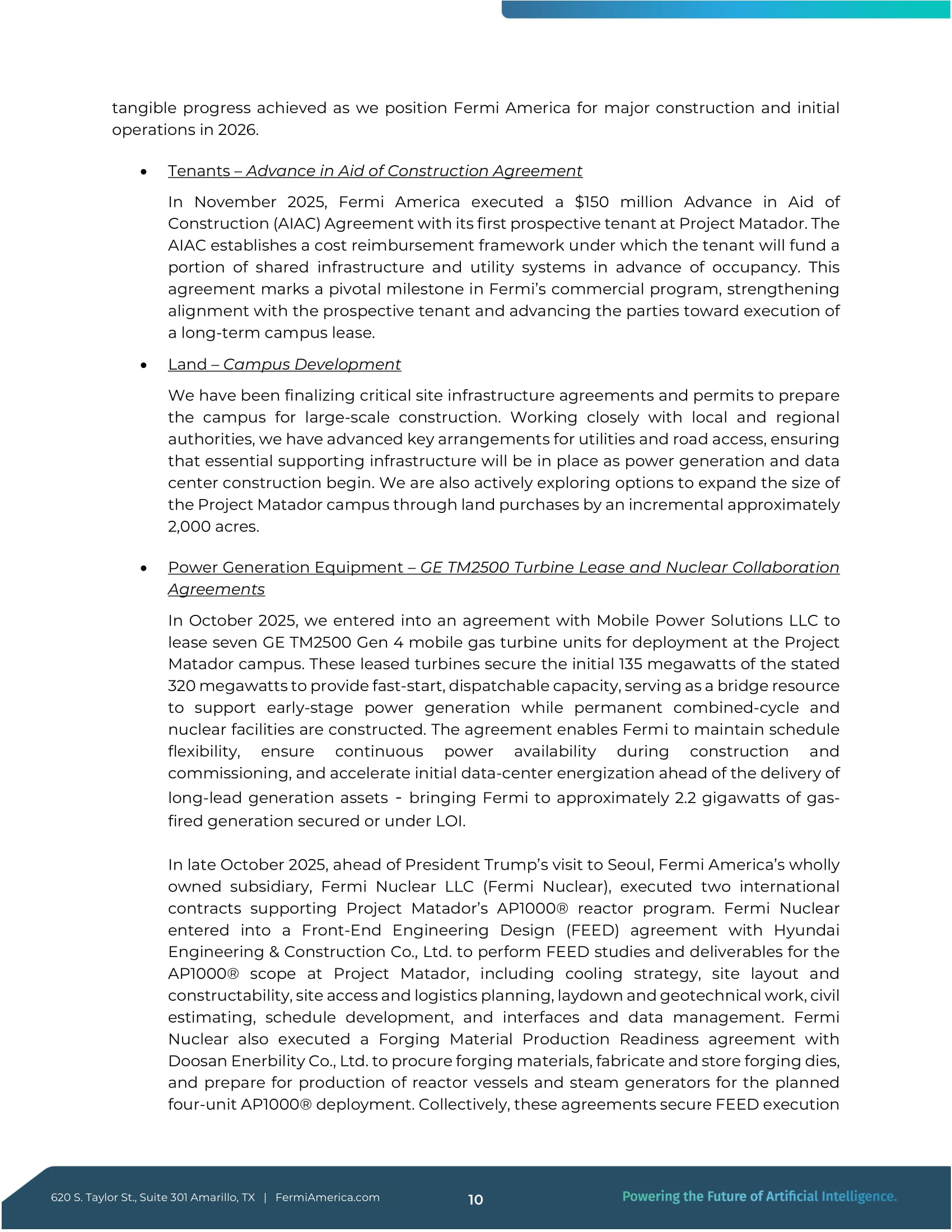 テナント - 建設費前払い契約 2025年11月、フェルミ・アメリカはプロジェクト・マタドールの最初のテナント候補と1億5,000万ドルの建設費前払い契約(AIAC)を締結した。AIACは、入居前にテナントが共有インフラとユーティリティ・システムの一部に資金を提供する費用償還の枠組みを確立するものである。この合意は、フェルミの商業プログラムにおける極めて重要なマイルストーンであり、テナント候補との連携を強化し、長期的なキャンパス賃貸契約の締結に向けて両当事者を前進させるものである。 土地 - キャンパス開発 我々は、大規模な建設に向けたキャンパスの準備のため、重要な用地インフラ契約と許認可の最終調整を行ってきた。地元自治体や地方公共団体と緊密に協力しながら、ユーティリティや道路アクセスに関する重要な取り決めを進め、発電やデータセンター建設開始時に必要不可欠なインフラが整うようにしています。また、土地購入を通じてProject Matadorキャンパスの規模をさらに約2,000エーカー拡大するオプションも積極的に検討しています。 発電設備 - GE TM 2500タービンリースと原子力協力契約 2025年10月、当社はMobile Power Solutions LLCと、プロジェクト・マタドール・キャンパスに配備するGE TM 2500第4世代移動式ガスタービン7基をリースする契約を締結した。これらのリースタービンは、320メガワットのうち最初の135メガワットを確保し、迅速な起動と発送電が可能な容量を提供するもので、恒久的な複合火力発電設備と原子力発電設備が建設されるまでの間、初期段階の発電をサポートする橋渡し的な役割を果たす。この契約により、フェルミはスケジュールの柔軟性を維持し、建設と試運転中の継続的な電力利用を確保し、長期リード発電資産の引き渡しに先駆けて初期のデータセンターへの通電を加速させることができる。トランプ大統領のソウル訪問に先立つ2025年10月下旬、フェルミ・アメリカの完全子会社であるフェルミ・ニュークリア・LLC(フェルミ・ニュークリア)は、プロジェクト・マタドールのAP 1000 ®原子炉プログラムを支援する2つの国際契約を締結した。フェルミ・ニュークリア社は、現代建設とフロントエンドエンジニアリング設計(FEED)契約を締結した。Ltd.と、冷却戦略、サイトレイアウトと建設可能性、サイトアクセスとロジスティクス計画、敷設と地盤工学作業、土木積算、スケジュール開発、インターフェースとデータ管理を含む、プロジェクト・マタドールのAP 1000 ®スコープのFEED研究と成果物を実施する契約を締結した。フェルミ・ニュークリア社はまた、斗山エナビリティ社(Doosan Enerbility Co.Ltd.とも鍛造材料生産準備契約を締結し、鍛造材料の調達、鍛造金型の製作と保管、4基のAP 1000®配備計画用の原子炉容器と蒸気発生器の生産準備を行った。これらの契約により、FEEDの実行は620S.