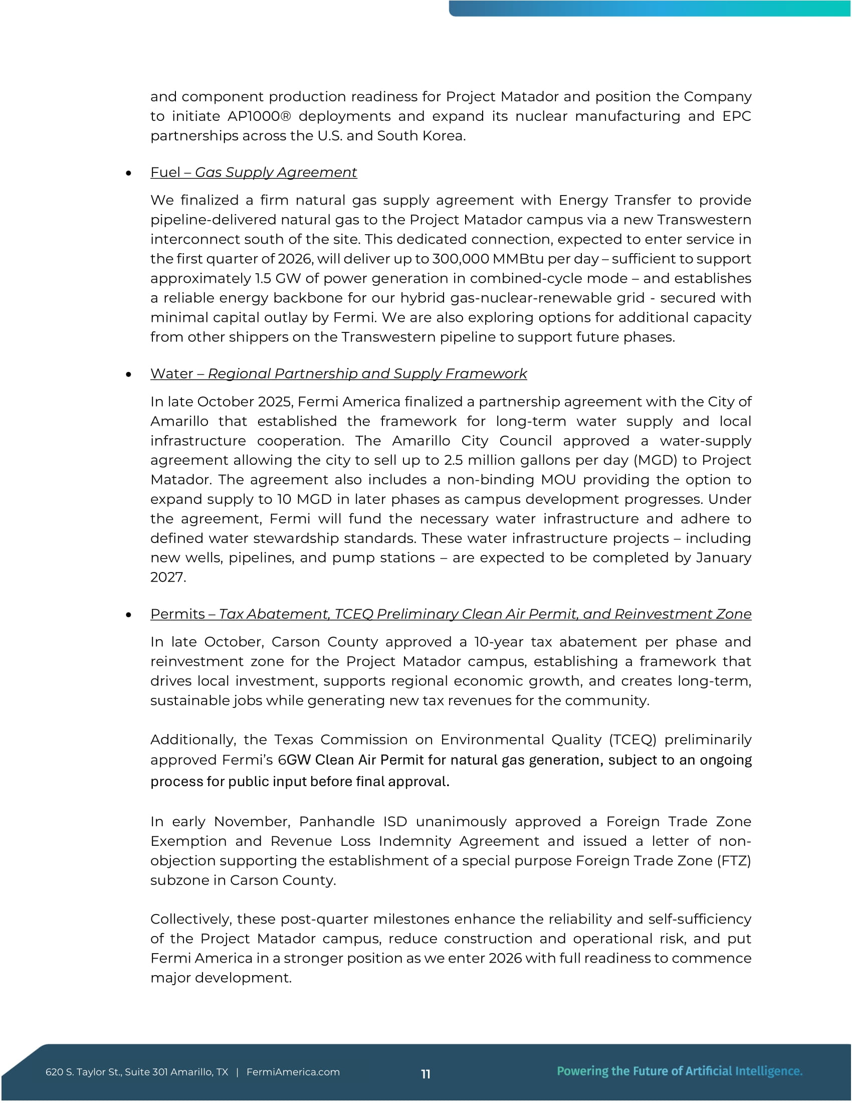 Taylor St., Suite 301 Amarillo, TX|FermiAmerica.comプロジェクト・マタドールのための10およびコンポーネントの生産準備態勢を整え、AP 1000 ®の配備を開始し、米国および韓国全域で原子力製造およびEPCパートナーシップを拡大する態勢を整える。 燃料 - ガス供給契約 当社は、プロジェクト・マタドールキャンパスにパイプライン供給される天然ガスを、同キャンパスの南側にある新しいトランスウェスタン社との相互接続を通じて供給するため、エナジートランスファー社との天然ガス供給契約を確定した。この専用接続は2026年第1四半期に開通予定で、1日あたり最大300,000MMBtuの天然ガスを供給する。この専用接続は、日量300,000 MMBtuを供給し、コンバインドサイクルモードで約1.5 GWの発電をサポートするのに十分であり、ガス・原子力・再生可能エネルギーのハイブリッド送電網のための信頼できるエネルギー基幹を確立します。また、将来の段階をサポートするために、トランスウェスタン・パイプラインの他の荷主からの追加容量のオプションも検討している。 水 - 地域パートナーシップと供給の枠組み 2025年10月下旬、フェルミ・アメリカはアマリロ市とのパートナーシップ協定を締結し、長期的な水供給と地域インフラ協力の枠組みを確立した。アマリロ市議会は、同市が日量250万ガロン(MG)を上限に水を販売することを認める水供給協定を承認した。アマリロ市議会は、同市がプロジェクト・マタドールに1日当たり500万ガロン(MGD)を販売することを認める水供給協定を承認した。この協定には、キャンパス開発が進むにつれて、後の段階で10MGDまで供給を拡大するオプションを提供する拘束力のない覚書も含まれている。この協定に基づき、フェルミは必要な水インフラに資金を提供し、定められたウォーター・スチュワードシップ基準を遵守する。これらの水インフラプロジェクト(新しい井戸、パイプライン、ポンプステーションを含む)は、2027年1月までに完了する予定である。 許認可 - 税減免、TCEQ予備的大気浄化許可、再投資ゾーン 10月下旬、カーソン郡はプロジェクト・マタドール・キャンパスの段階ごとの10年間の税減免と再投資ゾーンを承認し、地元投資を促進し、地域の経済成長を支援し、長期的で持続可能な雇用を創出すると同時に、地域社会に新たな税収を生み出す枠組みを確立した。さらに、テキサス州環境質委員会(TCEQ)は、フェルミ社の天然ガス発電に関する6GWの大気浄化許可を予備的に承認した。11月上旬、パンハンドルISDは、全会一致で外国貿易地区免除および収入損失補償協定を承認し、カーソン郡に特別目的の外国貿易地区(FTZ)サブゾーンを設立することを支持する異議不表明書を発行した。これらの四半期後のマイルストーンを総合すると、プロジェクト・マタドール・キャンパスの信頼性と自給自足が強化され、建設と操業のリスクが軽減され、主要な開発を開始する準備が完全に整った状態で2026年を迎えるにあたり、フェルミ・アメリカはより強固な立場に立つことになる。620 S.