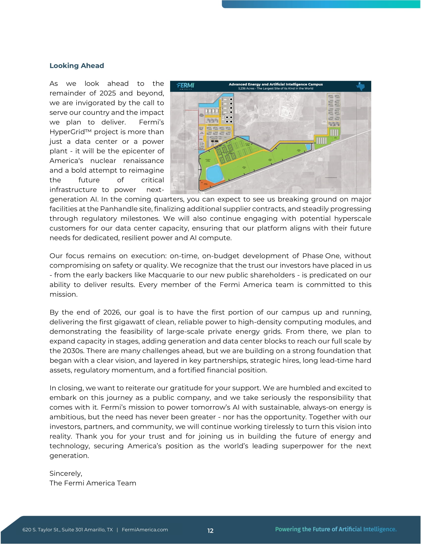 Taylor St., Suite 301 Amarillo, TX | FermiAmerica.com 11 今後の展望 2025年の残りとその先を見据えるとき、私たちは国に奉仕するという使命と、私たちが提供しようと計画している影響によって活力を得ています。フェルミのハイパーグリッドプロジェクトは、単なるデータセンターや発電所以上のものです。それはアメリカの原子力ルネッサンスの震源地であり、次世代AIに電力を供給するための重要なインフラの未来を再構築する大胆な試みです。今後数四半期で、私たちはパンハンドルサイトの主要施設の着工、サプライヤーとの追加契約の最終決定、規制上のマイルストーンの着実な進捗をご覧いただけると思います。また、当社のデータセンター容量について、潜在的なハイパースケール顧客との関係を継続し、当社のプラットフォームが、専用で弾力性のある電力とAIコンピュートに対する顧客の将来のニーズに合致するようにします。私たちの焦点は、安全性や品質に妥協することなく、時間通り、予算通りにフェーズ1を開発することです。私たちは、マッコーリーのような初期の支援者から新しい一般株主まで、投資家の皆様が私たちに寄せてくださった信頼は、私たちが結果を出す能力を前提としていることを認識しています。フェルミ・アメリカ・チームの全メンバーは、この使命に全力を尽くしています。2026年末までに、キャンパスの最初の部分を稼働させ、クリーンで信頼性の高い最初のギガワットの電力を高密度コンピューティング・モジュールに供給し、大規模なプライベート・エネルギー・グリッドの実現可能性を実証することを目標としています。そこから段階的に容量を拡大し、発電とデータセンター・ブロックを追加して、2030年代までにフルスケールに到達する計画です。 前途には多くの課題がありますが、明確なビジョンから始まり、重要なパートナーシップ、戦略的雇用、長いリードタイムのハード資産、規制の勢い、強化された財務体質など、強固な基盤を築いています。最後に、皆様のご支援に改めて感謝申し上げます。私たちは、上場企業としてこの旅に出ることに身の引き締まる思いと興奮を感じており、それに伴う責任を真摯に受け止めています。持続可能な常時稼働のエネルギーで明日のAIに電力を供給するというフェルミの使命は野心的なものですが、その必要性はかつてないほど大きく、またチャンスでもあります。投資家、パートナー、コミュニティとともに、私たちはこのビジョンを実現するためにたゆまぬ努力を続けていきます。エネルギーとテクノロジーの未来を築き、次世代に向けて世界をリードする超大国としてのアメリカの地位を確保するために、皆様の信頼とご参加に感謝いたします。敬具 フェルミ・アメリカ・チーム 620 S.