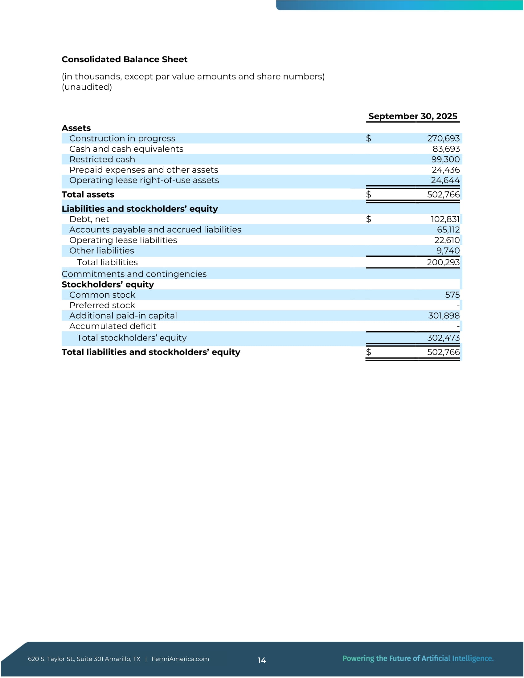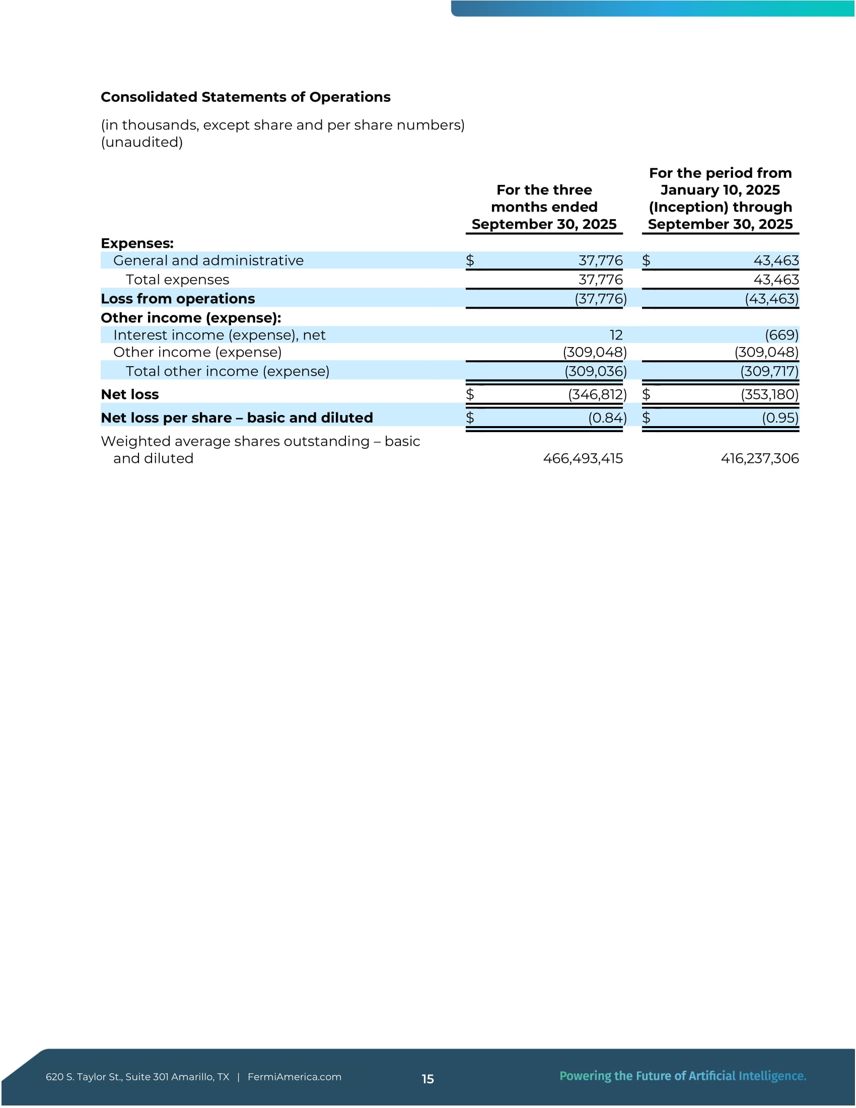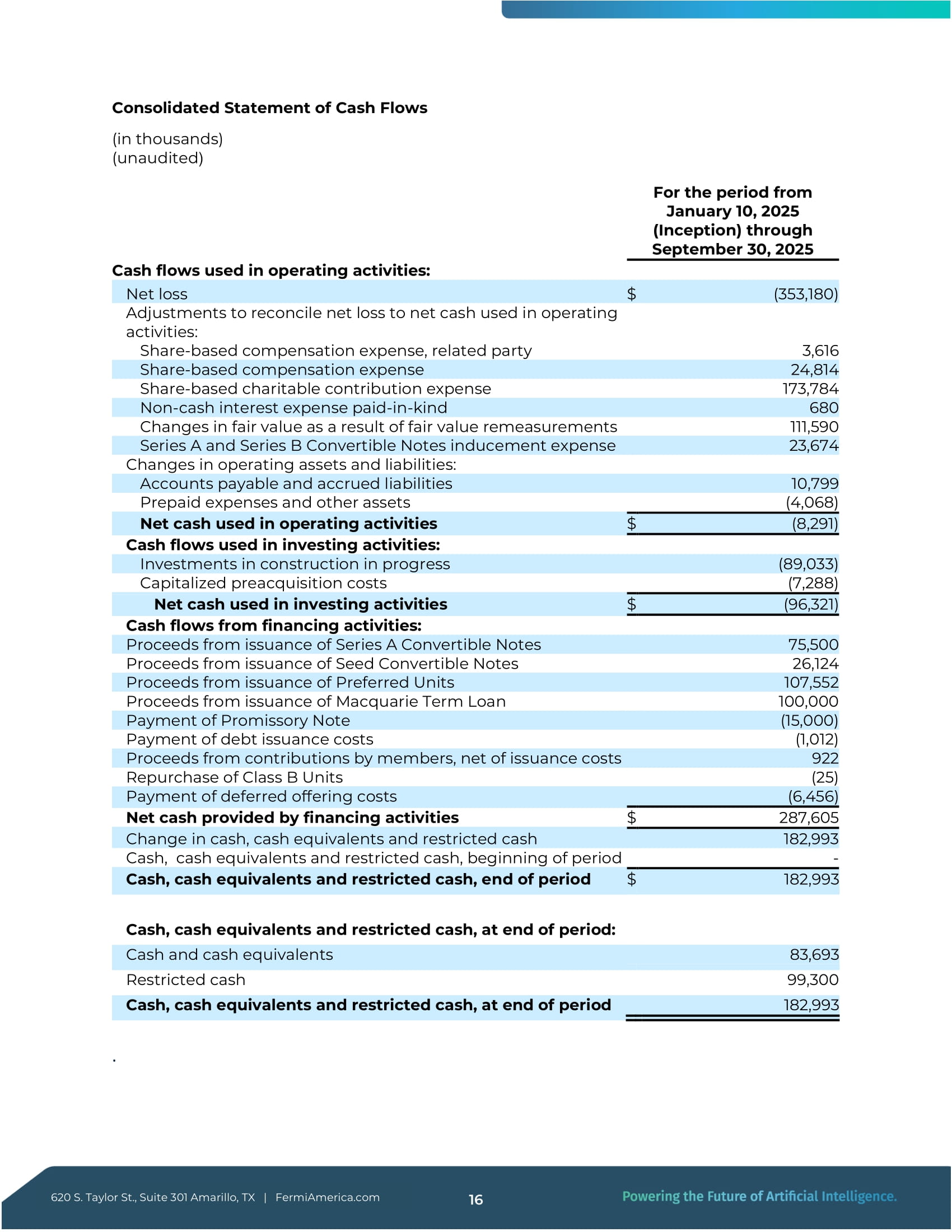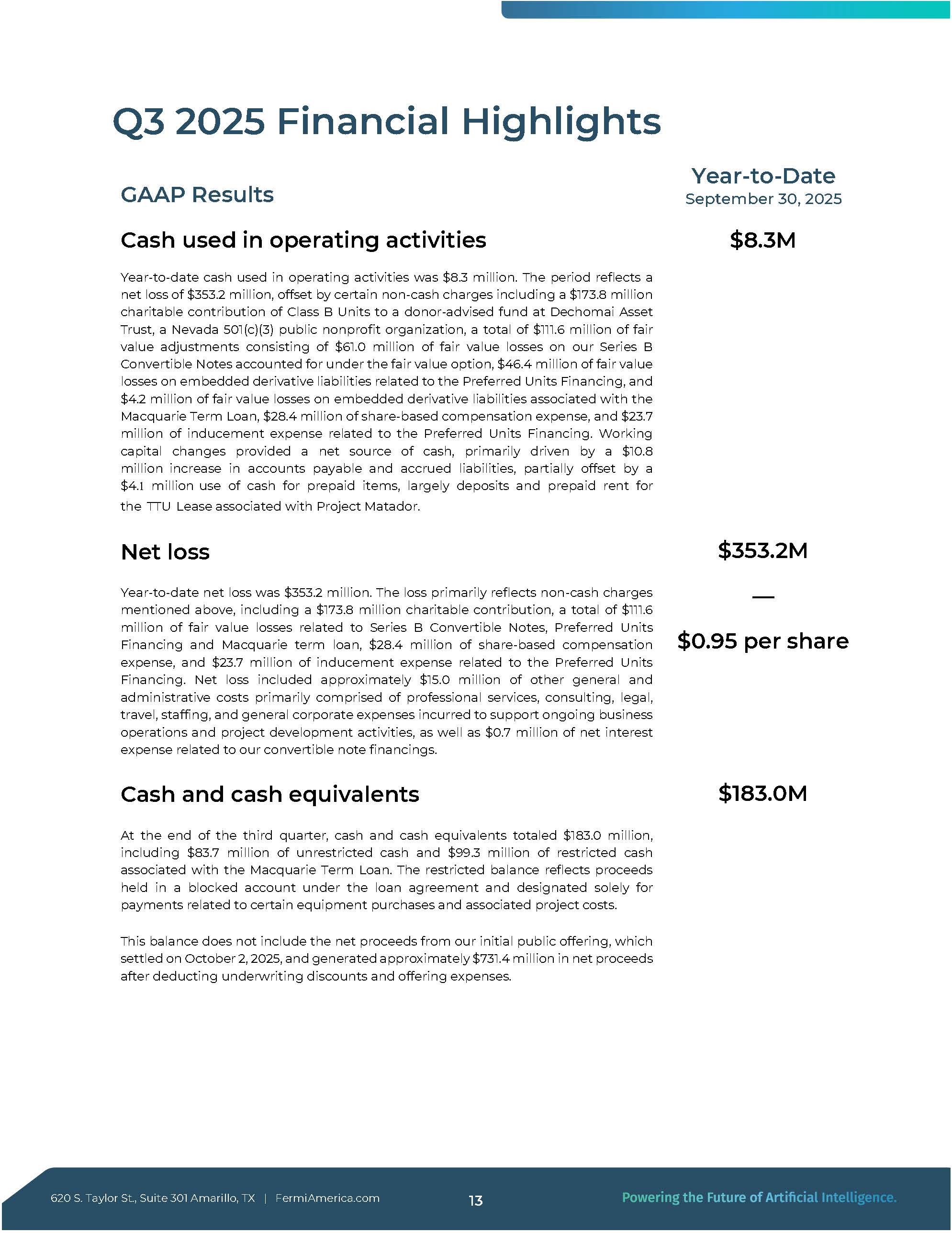 Taylor St., Suite 301 Amarillo, TX | FermiAmerica.com 12 2025年第3四半期財務ハイライト 620 S. Taylor St.300万ドルであった。この期間は3億5,300万ドルの純損失を反映している。2百万ドルの純損失を計上したが、173 .ネバダ州の501 (c)( 3 ) 公益非営利団体であるデコマイ・アセット・トラストの寄付者支援基金へのクラスBユニットの寄付金1億7,300万ドル、総額1億1,100 .6百万ドルの公正価値調整。その内訳は、公正価値オプションで会計処理されたシリーズB転換社債の公正価値損失が61百万ドル、組込債の公正価値損失が46百万ドルである。4百万ドル、マッコーリー・ターム・ローンに関連する組込デリバティブ負債の公正価値損失4百万ドル、株式報酬費用28 .400万ドルの株式報酬費用、および23 .7百万ドル、優先株の資金調達に関連した誘導費用である。運転資本の変動は、主に10 .800万ドルの買掛金および未払金の増加により一部相殺された。500万米ドルの前払い項目(主にプロジェクト・マタドールに関連するTTUリースの保証金および前払い賃料)の現金支出。3億5,320万ドル - - 1株当たり0.95ドル 当期純損失 当期純損失は3億5,320 .2百万ドル。この損失は主に、1億7,300 .8 百万ドルの慈善寄付、合計 111 .6百万ドルのシリーズB転換社債、優先ユニット・ファイナンスおよびマッコーリー・タームローンに関する公正価値損失、28 .400万ドルの株式報酬費用、および23 .7百万ドルの優先株式資金調達に関連する誘導費用。当期純損失には、約15 .その他の一般管理費は、主に専門サービス、コンサルティング、法務、出張、人材派遣、および継続的な事業運営とプロジェクト開発活動を支援するために発生した一般的な会社経費で構成されており、転換社債型新株予約権付社債の資金調達に関連した純金利費用は0.7百万ドルであった。 現金および現金同等物 第3四半期末現在の現金および現金同等物は、総額183.0百万ドル(うち使途不明金83 .7百万ドルの使途不指定の現金と99 .7百万ドル、マッコーリー・ターム・ローンに関連した制限付き現金が99百万ドルである。使途制限残高は、ローン契約に基づきブロック口座に保管され、特定の設備購入および関連プロジェクト費用に関連する支払いのみに指定された収入を反映している。この残高には、2025年10月2日に決済され、約7億3,100万ドルの純収入を得た新規株式公開からの純収入は含まれていない。4百万ドルの引受割引および募集経費控除後の純収入がある。