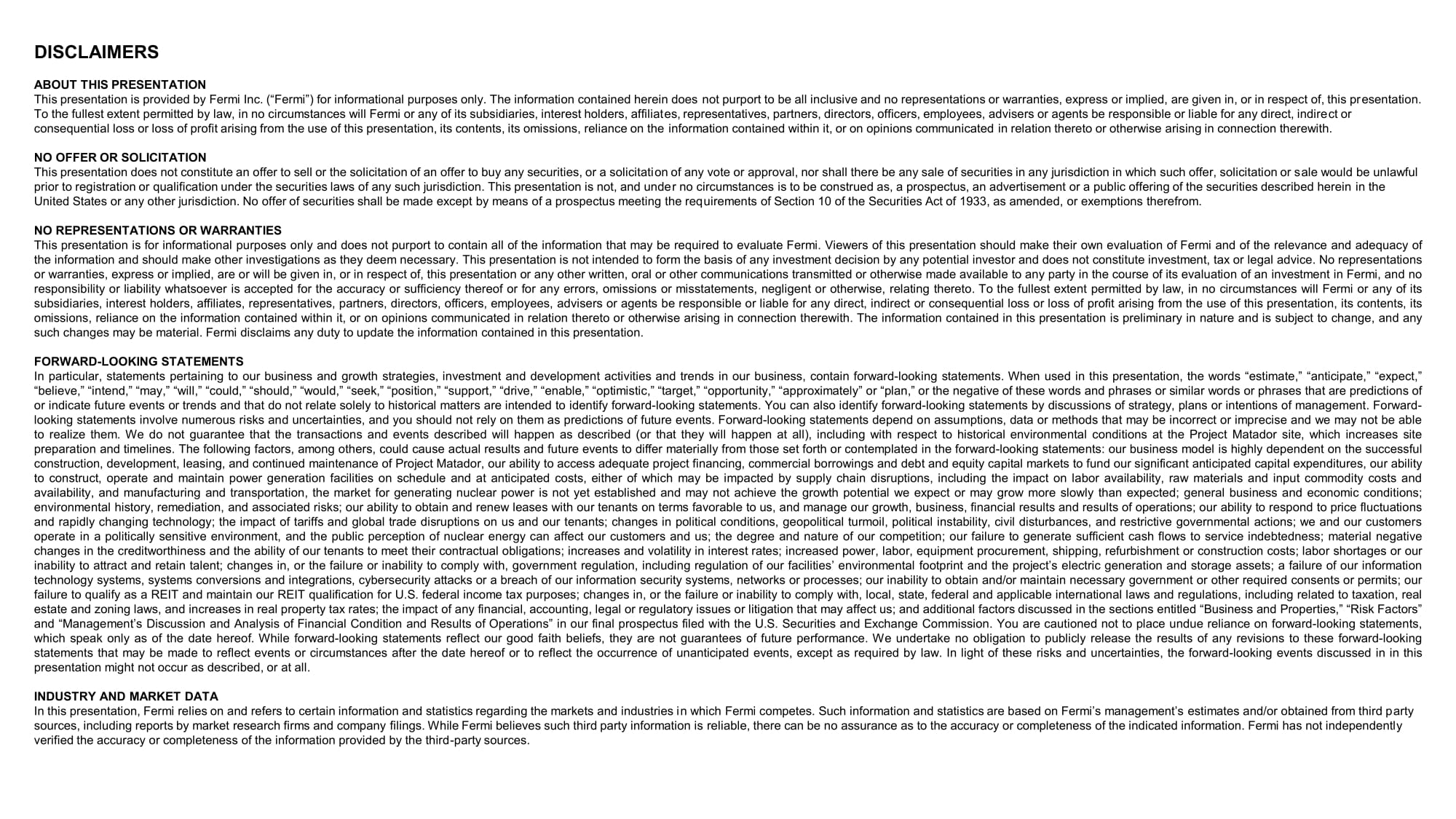 本プレスリリースに関連して、当社は投資家向けプレゼンテーション(以下、「投資家向けプレゼンテーション」)も公開しました。投資家向けプレゼンテーションは、当社ウェブサイト(investor.fermiamerica.com)の「投資家向け情報」セクションから入手可能であり、本フォーム 8-K の別紙99.2として提出され、参照により本書に組み込まれています。当社のコーポレート・ウェブサイト上の情報は、本Form 8-Kの一部ではなく、また、当社が米国証券取引委員会に提出するその他の書類に組み込まれるものでもありません。