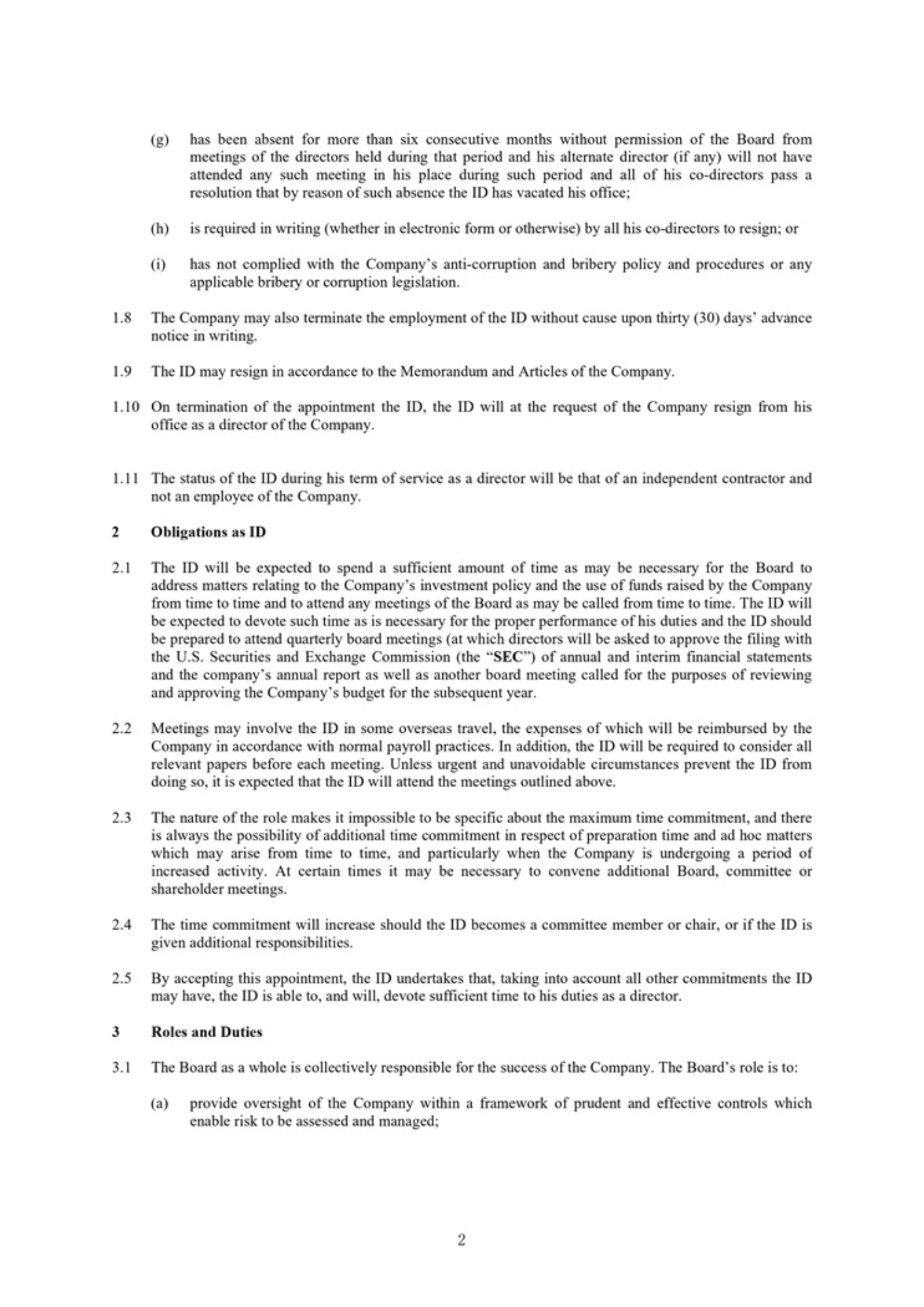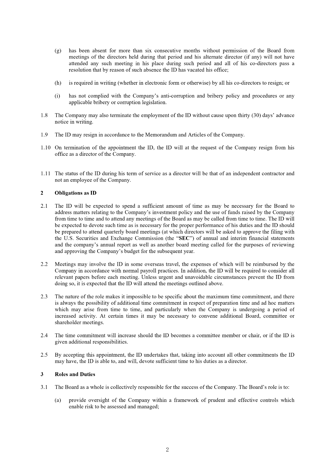 2 (g) has been absent for more than six consecutive months without permission of the Board from meetings of the directors held during that period and his alternate director (if any) will not have attended any such meeting in his place during such period and all of his co - directors pass a resolution that by reason of such absence the ID has vacated his office ; (h) is required in writing (whether in electronic form or otherwise) by all his co - directors to resign; or (i) has not complied with the Company’s anti - corruption and bribery policy and procedures or any applicable bribery or corruption legislation . 8. The Company may also terminate the employment of the ID without cause upon thirty (30) days’ advance notice in writing. 9. The ID may resign in accordance to the Memorandum and Articles of the Company. 10. On termination of the appointment the ID, the ID will at the request of the Company resign from his office as a director of the Company. 11. The status of the ID during his term of service as a director will be that of an independent contractor and not an employee of the Company. 2 Obligations as ID 1. The ID will be expected to spend a sufficient amount of time as may be necessary for the Board to address matters relating to the Company’s investment policy and the use of funds raised by the Company from time to time and to attend any meetings of the Board as may be called from time to time . The ID will be expected to devote such time as is necessary for the proper performance of his duties and the ID should be prepared to attend quarterly board meetings (at which directors will be asked to approve the filing with the U . S . Securities and Exchange Commission (the “ SEC ”) of annual and interim financial statements and the company’s annual report as well as another board meeting called for the purposes of reviewing and approving the Company’s budget for the subsequent year . 2. Meetings may involve the ID in some overseas travel, the expenses of which will be reimbursed by the Company in accordance with normal payroll practices . In addition, the ID will be required to consider all relevant papers before each meeting . Unless urgent and unavoidable circumstances prevent the ID from doing so, it is expected that the ID will attend the meetings outlined above . 3. The nature of the role makes it impossible to be specific about the maximum time commitment, and there is always the possibility of additional time commitment in respect of preparation time and ad hoc matters which may arise from time to time, and particularly when the Company is undergoing a period of increased activity . At certain times it may be necessary to convene additional Board, committee or shareholder meetings . 4. The time commitment will increase should the ID becomes a committee member or chair, or if the ID is given additional responsibilities . 5. By accepting this appointment, the ID undertakes that, taking into account all other commitments the ID may have, the ID is able to, and will, devote sufficient time to his duties as a director . 3 Roles and Duties 1. The Board as a whole is collectively responsible for the success of the Company. The Board’s role is to: (a) provide oversight of the Company within a framework of prudent and effective controls which enable risk to be assessed and managed;