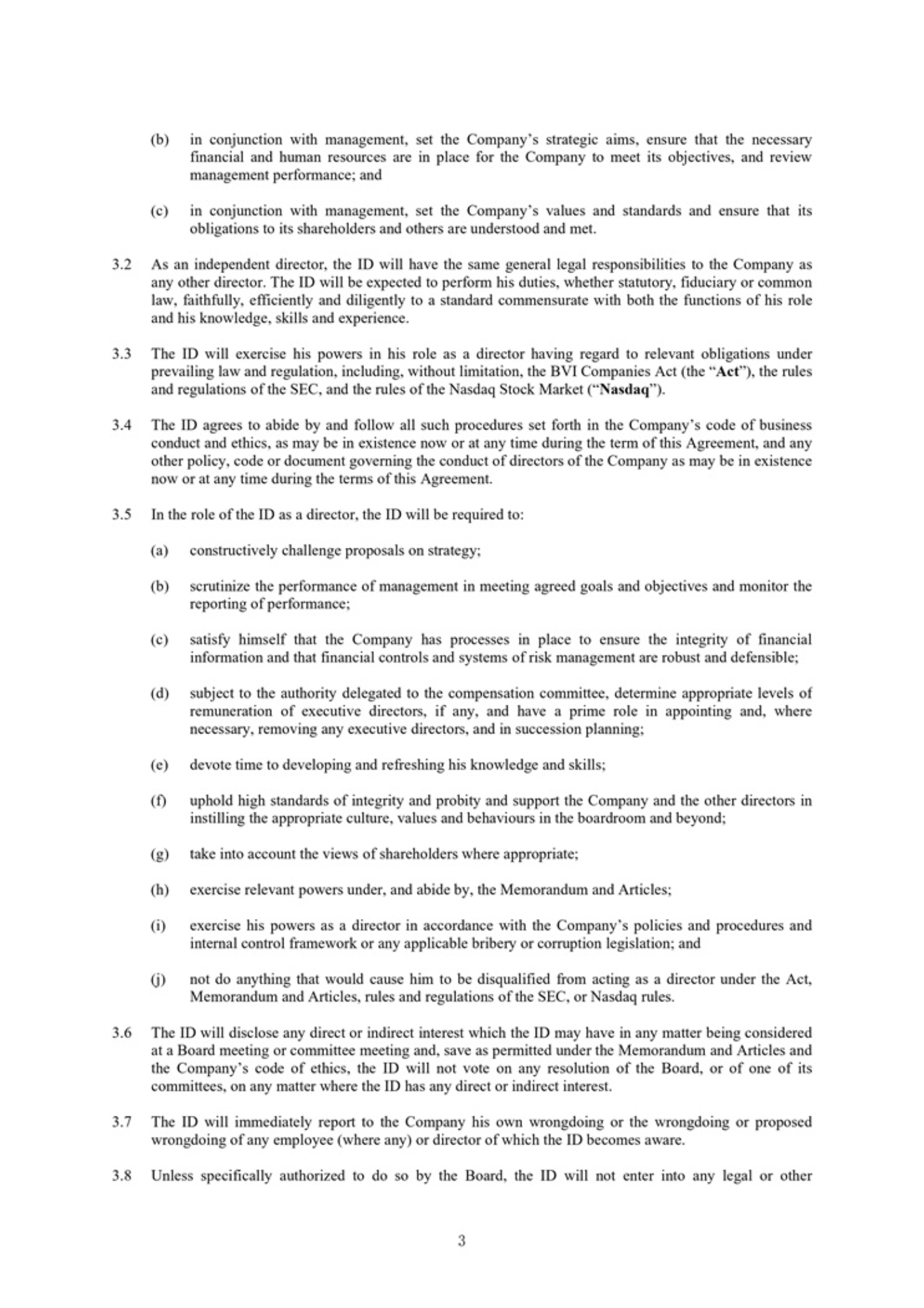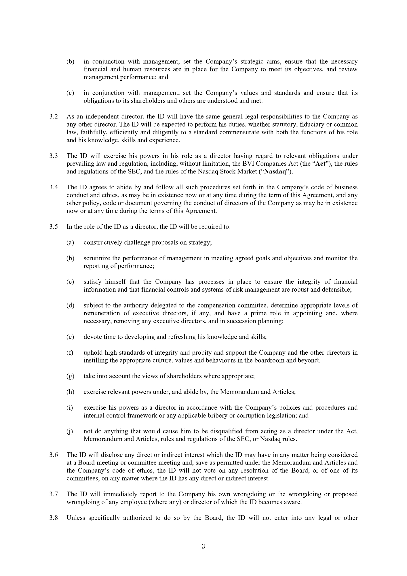3 (b) in conjunction with management, set the Company’s strategic aims, ensure that the necessary financial and human resources are in place for the Company to meet its objectives, and review management performance ; and (c) in conjunction with management, set the Company’s values and standards and ensure that its obligations to its shareholders and others are understood and met. 2. As an independent director, the ID will have the same general legal responsibilities to the Company as any other director . The ID will be expected to perform his duties, whether statutory, fiduciary or common law, faithfully, efficiently and diligently to a standard commensurate with both the functions of his role and his knowledge, skills and experience . 3. The ID will exercise his powers in his role as a director having regard to relevant obligations under prevailing law and regulation, including, without limitation, the BVI Companies Act (the “ Act ”), the rules and regulations of the SEC, and the rules of the Nasdaq Stock Market (“ Nasdaq ”) . 4. The ID agrees to abide by and follow all such procedures set forth in the Company’s code of business conduct and ethics, as may be in existence now or at any time during the term of this Agreement, and any other policy, code or document governing the conduct of directors of the Company as may be in existence now or at any time during the terms of this Agreement . 5. In the role of the ID as a director, the ID will be required to: (a) constructively challenge proposals on strategy; (b) scrutinize the performance of management in meeting agreed goals and objectives and monitor the reporting of performance; (c) satisfy himself that the Company has processes in place to ensure the integrity of financial information and that financial controls and systems of risk management are robust and defensible; (d) subject to the authority delegated to the compensation committee, determine appropriate levels of remuneration of executive directors, if any, and have a prime role in appointing and, where necessary, removing any executive directors, and in succession planning ; (e) devote time to developing and refreshing his knowledge and skills; (f) uphold high standards of integrity and probity and support the Company and the other directors in instilling the appropriate culture, values and behaviours in the boardroom and beyond; (g) take into account the views of shareholders where appropriate; (h) exercise relevant powers under, and abide by, the Memorandum and Articles; (i) exercise his powers as a director in accordance with the Company’s policies and procedures and internal control framework or any applicable bribery or corruption legislation; and (j) not do anything that would cause him to be disqualified from acting as a director under the Act, Memorandum and Articles, rules and regulations of the SEC, or Nasdaq rules. 6. The ID will disclose any direct or indirect interest which the ID may have in any matter being considered at a Board meeting or committee meeting and, save as permitted under the Memorandum and Articles and the Company’s code of ethics, the ID will not vote on any resolution of the Board, or of one of its committees, on any matter where the ID has any direct or indirect interest . 7. The ID will immediately report to the Company his own wrongdoing or the wrongdoing or proposed wrongdoing of any employee (where any) or director of which the ID becomes aware . 8. Unless specifically authorized to do so by the Board, the ID will not enter into any legal or other