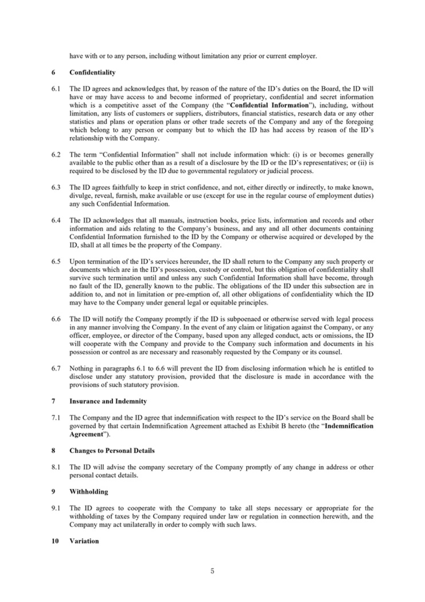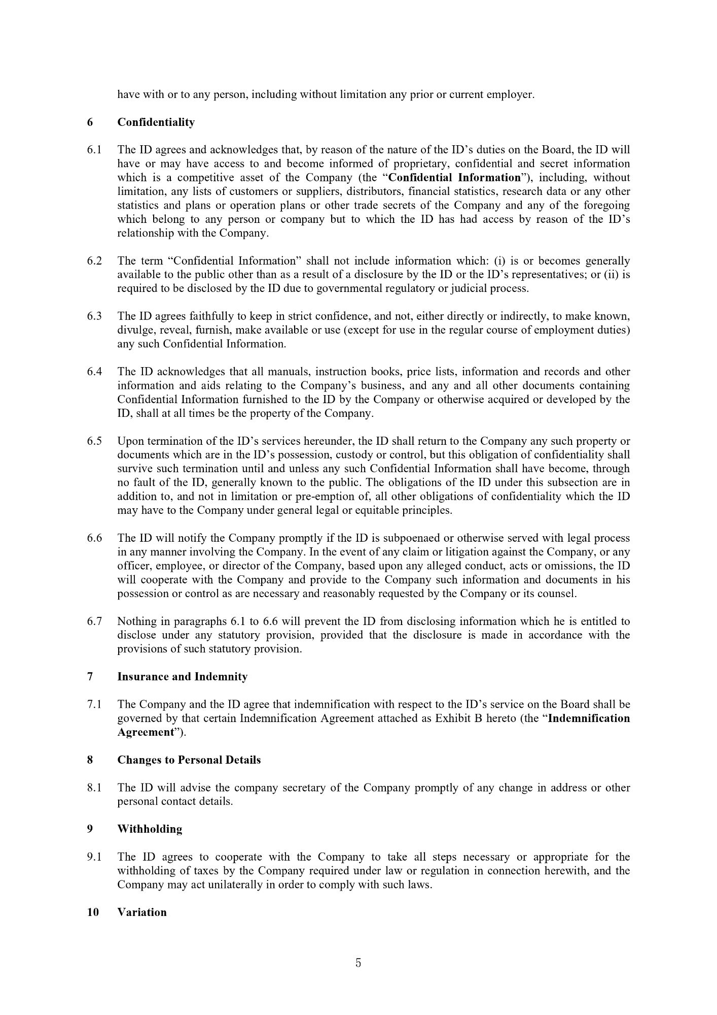 5 have with or to any person, including without limitation any prior or current employer. 6 Confidentiality 1. The ID agrees and acknowledges that, by reason of the nature of the ID’s duties on the Board, the ID will have or may have access to and become informed of proprietary, confidential and secret information which is a competitive asset of the Company (the “ Confidential Information ”), including, without limitation, any lists of customers or suppliers, distributors, financial statistics, research data or any other statistics and plans or operation plans or other trade secrets of the Company and any of the foregoing which belong to any person or company but to which the ID has had access by reason of the ID’s relationship with the Company . 2. The term “Confidential Information” shall not include information which : (i) is or becomes generally available to the public other than as a result of a disclosure by the ID or the ID’s representatives ; or (ii) is required to be disclosed by the ID due to governmental regulatory or judicial process . 3. The ID agrees faithfully to keep in strict confidence, and not, either directly or indirectly, to make known, divulge, reveal, furnish, make available or use (except for use in the regular course of employment duties) any such Confidential Information . 4. The ID acknowledges that all manuals, instruction books, price lists, information and records and other information and aids relating to the Company’s business, and any and all other documents containing Confidential Information furnished to the ID by the Company or otherwise acquired or developed by the ID, shall at all times be the property of the Company . 5. Upon termination of the ID’s services hereunder, the ID shall return to the Company any such property or documents which are in the ID’s possession, custody or control, but this obligation of confidentiality shall survive such termination until and unless any such Confidential Information shall have become, through no fault of the ID, generally known to the public . The obligations of the ID under this subsection are in addition to, and not in limitation or pre - emption of, all other obligations of confidentiality which the ID may have to the Company under general legal or equitable principles . 6. The ID will notify the Company promptly if the ID is subpoenaed or otherwise served with legal process in any manner involving the Company . In the event of any claim or litigation against the Company, or any officer, employee, or director of the Company, based upon any alleged conduct, acts or omissions, the ID will cooperate with the Company and provide to the Company such information and documents in his possession or control as are necessary and reasonably requested by the Company or its counsel . 7. Nothing in paragraphs 6 . 1 to 6 . 6 will prevent the ID from disclosing information which he is entitled to disclose under any statutory provision, provided that the disclosure is made in accordance with the provisions of such statutory provision . 7 Insurance and Indemnity 7 . 1 The Company and the ID agree that indemnification with respect to the ID’s service on the Board shall be governed by that certain Indemnification Agreement attached as Exhibit B hereto (the “ Indemnification Agreement ”) . 8 Changes to Personal Details 8.1 The ID will advise the company secretary of the Company promptly of any change in address or other personal contact details. 9 Withholding 9 . 1 The ID agrees to cooperate with the Company to take all steps necessary or appropriate for the withholding of taxes by the Company required under law or regulation in connection herewith, and the Company may act unilaterally in order to comply with such laws . 10 Variation