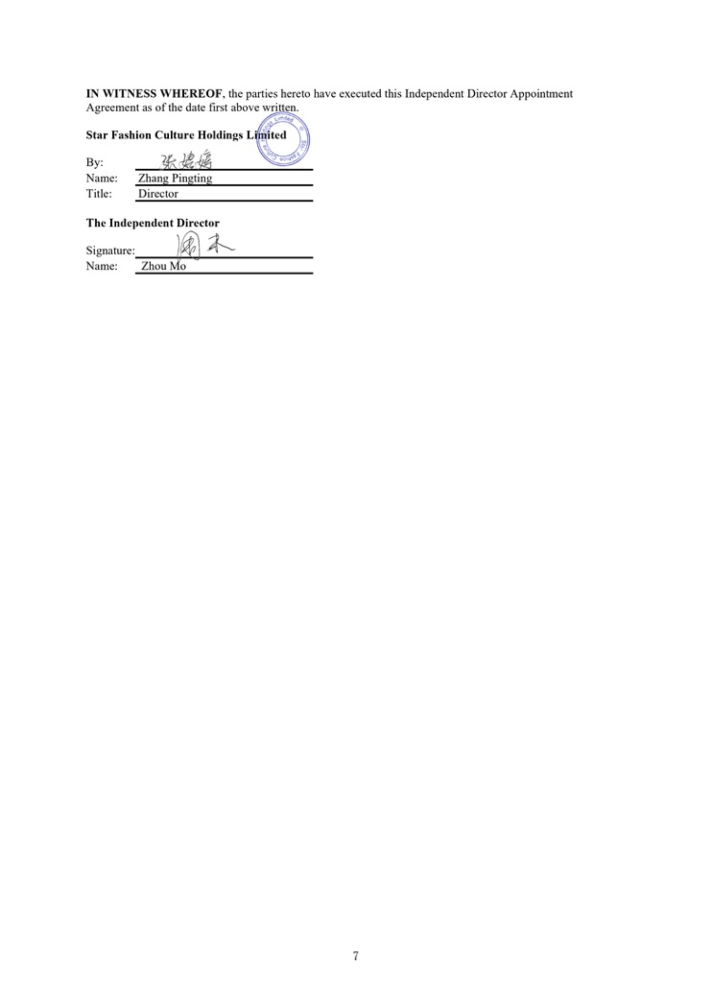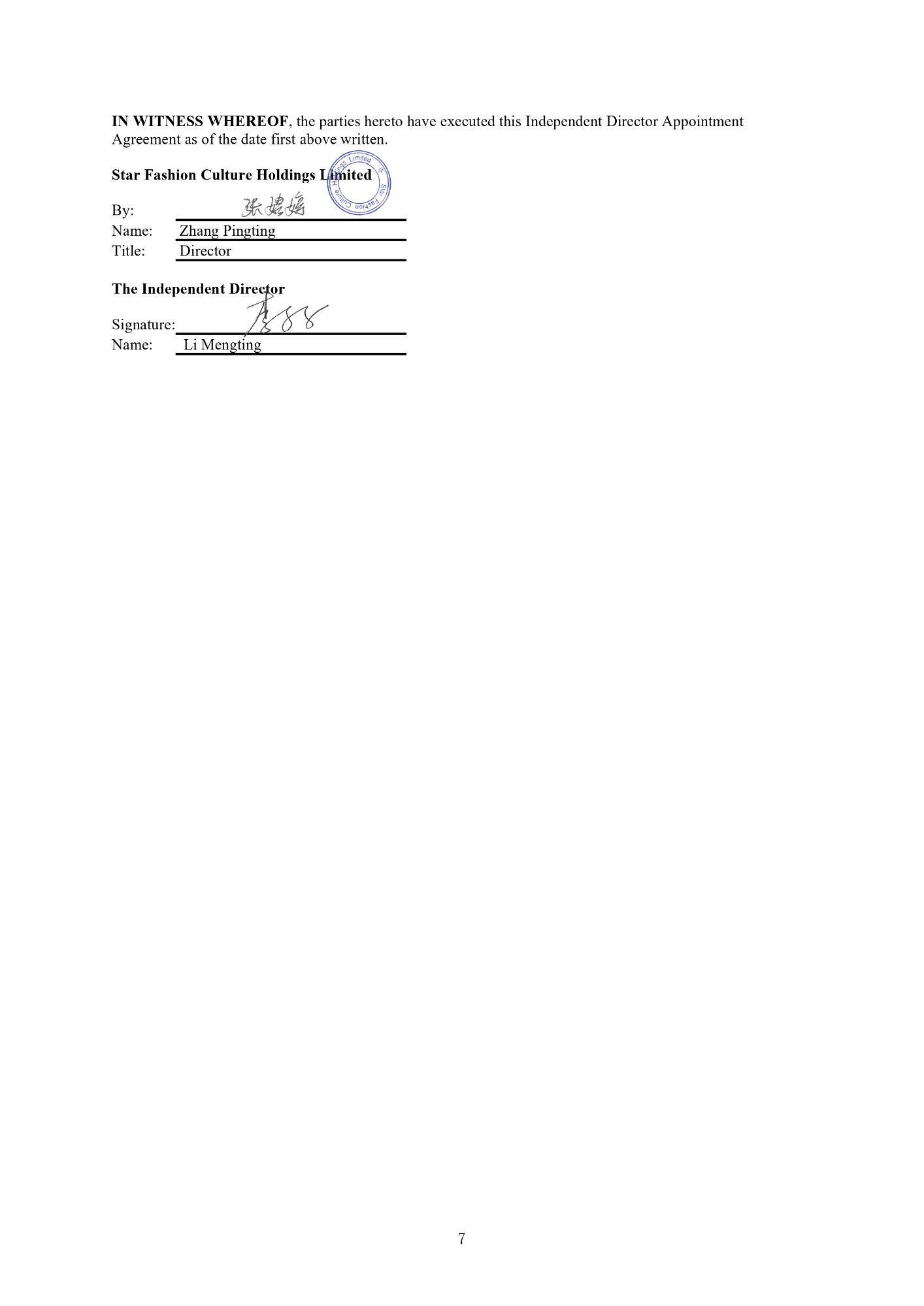 IN WITNESS WHEREOF , the parties hereto have executed this Independent Director Appointment Agreement as of the date first above written. Star Fashion Culture Holdings Limited By: Name: Title: Zhang Pingting Director The Independent Director Signature: Name: Li Mengting 7