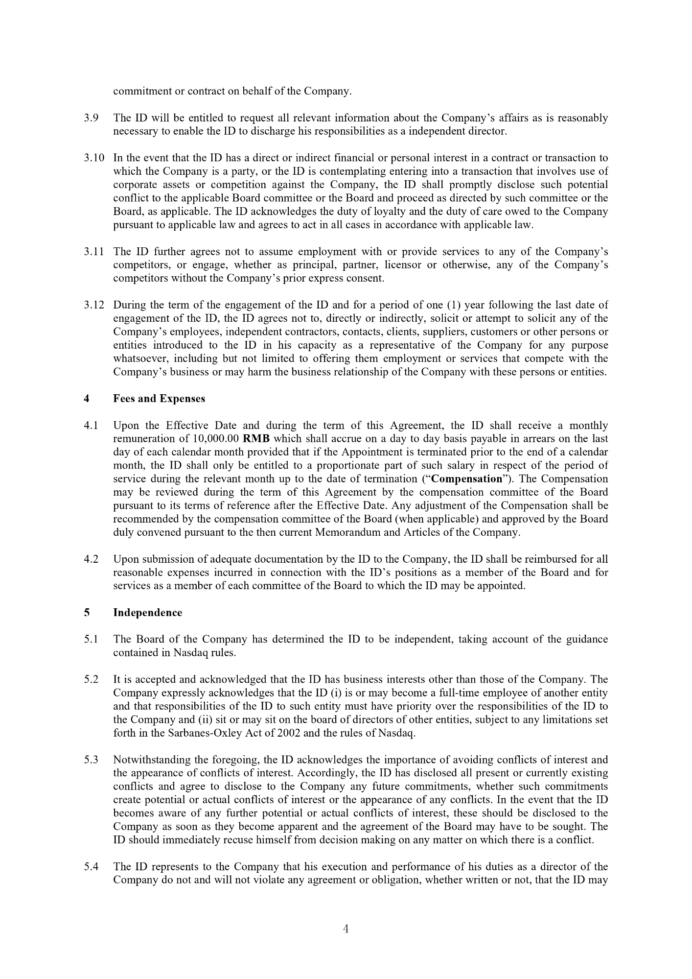 4 commitment or contract on behalf of the Company. 9. The ID will be entitled to request all relevant information about the Company’s affairs as is reasonably necessary to enable the ID to discharge his responsibilities as a independent director . 10. In the event that the ID has a direct or indirect financial or personal interest in a contract or transaction to which the Company is a party, or the ID is contemplating entering into a transaction that involves use of corporate assets or competition against the Company, the ID shall promptly disclose such potential conflict to the applicable Board committee or the Board and proceed as directed by such committee or the Board, as applicable . The ID acknowledges the duty of loyalty and the duty of care owed to the Company pursuant to applicable law and agrees to act in all cases in accordance with applicable law . 11. The ID further agrees not to assume employment with or provide services to any of the Company’s competitors, or engage, whether as principal, partner, licensor or otherwise, any of the Company’s competitors without the Company’s prior express consent . 12. During the term of the engagement of the ID and for a period of one ( 1 ) year following the last date of engagement of the ID, the ID agrees not to, directly or indirectly, solicit or attempt to solicit any of the Company’s employees, independent contractors, contacts, clients, suppliers, customers or other persons or entities introduced to the ID in his capacity as a representative of the Company for any purpose whatsoever, including but not limited to offering them employment or services that compete with the Company’s business or may harm the business relationship of the Company with these persons or entities . 4 Fees and Expenses 1. Upon the Effective Date and during the term of this Agreement, the ID shall receive a monthly remuneration of 10 , 000 . 00 RMB which shall accrue on a day to day basis payable in arrears on the last day of each calendar month provided that if the Appointment is terminated prior to the end of a calendar month, the ID shall only be entitled to a proportionate part of such salary in respect of the period of service during the relevant month up to the date of termination (“ Compensation ”) . The Compensation may be reviewed during the term of this Agreement by the compensation committee of the Board pursuant to its terms of reference after the Effective Date . Any adjustment of the Compensation shall be recommended by the compensation committee of the Board (when applicable) and approved by the Board duly convened pursuant to the then current Memorandum and Articles of the Company . 2. Upon submission of adequate documentation by the ID to the Company, the ID shall be reimbursed for all reasonable expenses incurred in connection with the ID’s positions as a member of the Board and for services as a member of each committee of the Board to which the ID may be appointed . 5 Independence 1. The Board of the Company has determined the ID to be independent, taking account of the guidance contained in Nasdaq rules . 2. It is accepted and acknowledged that the ID has business interests other than those of the Company . The Company expressly acknowledges that the ID (i) is or may become a full - time employee of another entity and that responsibilities of the ID to such entity must have priority over the responsibilities of the ID to the Company and (ii) sit or may sit on the board of directors of other entities, subject to any limitations set forth in the Sarbanes - Oxley Act of 2002 and the rules of Nasdaq . 3. Notwithstanding the foregoing, the ID acknowledges the importance of avoiding conflicts of interest and the appearance of conflicts of interest . Accordingly, the ID has disclosed all present or currently existing conflicts and agree to disclose to the Company any future commitments, whether such commitments create potential or actual conflicts of interest or the appearance of any conflicts . In the event that the ID becomes aware of any further potential or actual conflicts of interest, these should be disclosed to the Company as soon as they become apparent and the agreement of the Board may have to be sought . The ID should immediately recuse himself from decision making on any matter on which there is a conflict . 4. The ID represents to the Company that his execution and performance of his duties as a director of the Company do not and will not violate any agreement or obligation, whether written or not, that the ID may