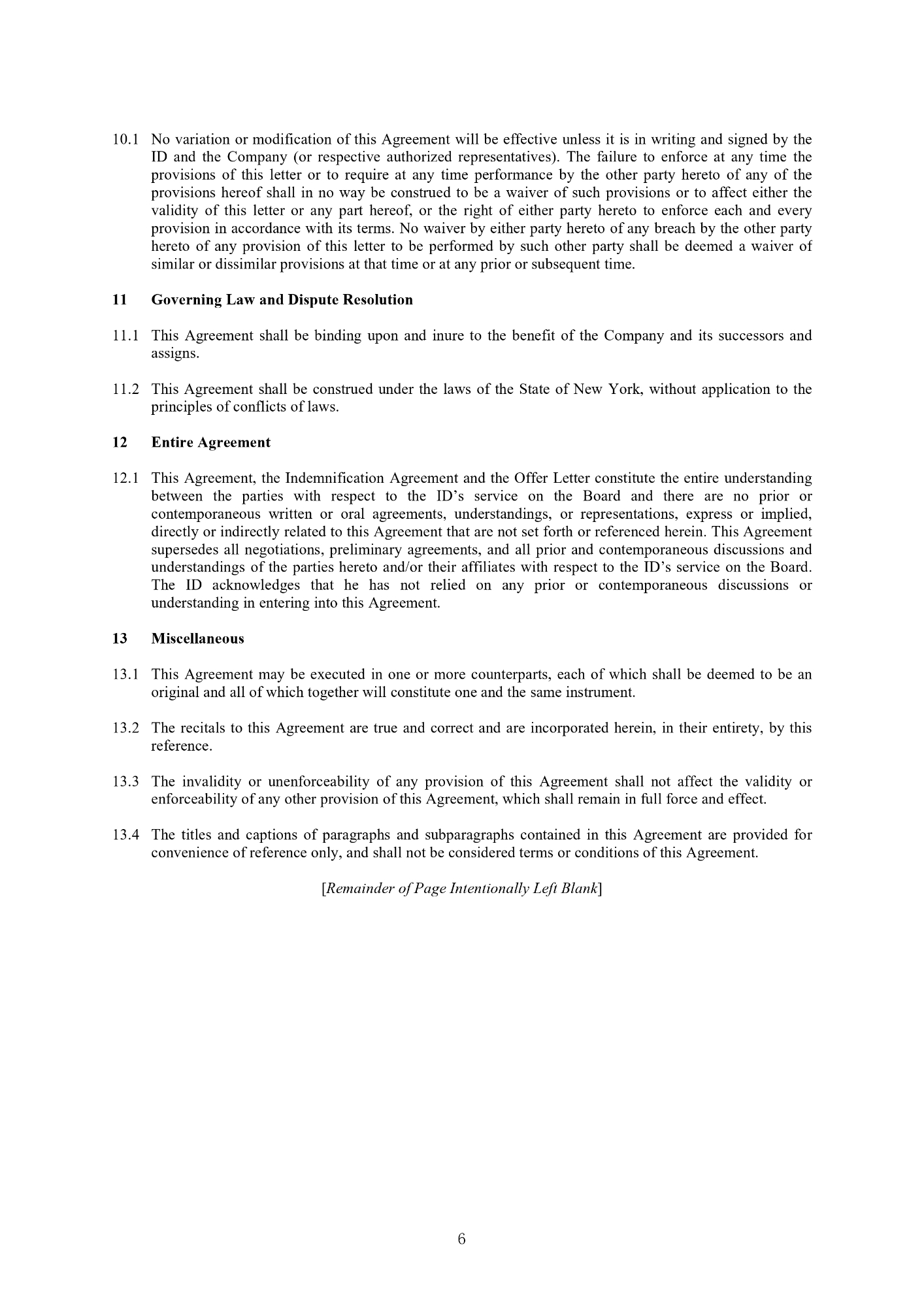 6 10 . 1 No variation or modification of this Agreement will be effective unless it is in writing and signed by the ID and the Company (or respective authorized representatives) . The failure to enforce at any time the provisions of this letter or to require at any time performance by the other party hereto of any of the provisions hereof shall in no way be construed to be a waiver of such provisions or to affect either the validity of this letter or any part hereof, or the right of either party hereto to enforce each and every provision in accordance with its terms . No waiver by either party hereto of any breach by the other party hereto of any provision of this letter to be performed by such other party shall be deemed a waiver of similar or dissimilar provisions at that time or at any prior or subsequent time . 11 Governing Law and Dispute Resolution 1. This Agreement shall be binding upon and inure to the benefit of the Company and its successors and assigns. 2. This Agreement shall be construed under the laws of the State of New York, without application to the principles of conflicts of laws. 12 Entire Agreement 1. This Agreement, the Indemnification Agreement and the Offer Letter constitute the entire understanding between the parties with respect to the ID’s service on the Board and there are no prior or contemporaneous written or oral agreements, understandings, or representations, express or implied, directly or indirectly related to this Agreement that are not set forth or referenced herein . This Agreement supersedes all negotiations, preliminary agreements, and all prior and contemporaneous discussions and understandings of the parties hereto and/or their affiliates with respect to the ID’s service on the Board . The ID acknowledges that he has not relied on any prior or contemporaneous discussions or understanding in entering into this Agreement . 13 Miscellaneous 1. This Agreement may be executed in one or more counterparts, each of which shall be deemed to be an original and all of which together will constitute one and the same instrument. 2. The recitals to this Agreement are true and correct and are incorporated herein, in their entirety, by this reference. 3. The invalidity or unenforceability of any provision of this Agreement shall not affect the validity or enforceability of any other provision of this Agreement, which shall remain in full force and effect. 4. The titles and captions of paragraphs and subparagraphs contained in this Agreement are provided for convenience of reference only, and shall not be considered terms or conditions of this Agreement. [ Remainder of Page Intentionally Left Blank ]