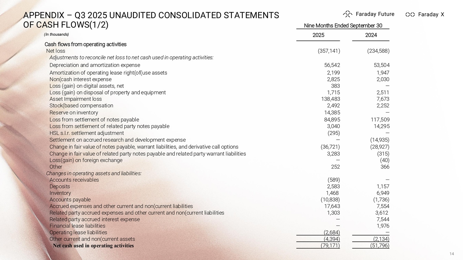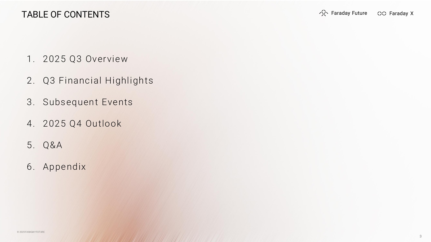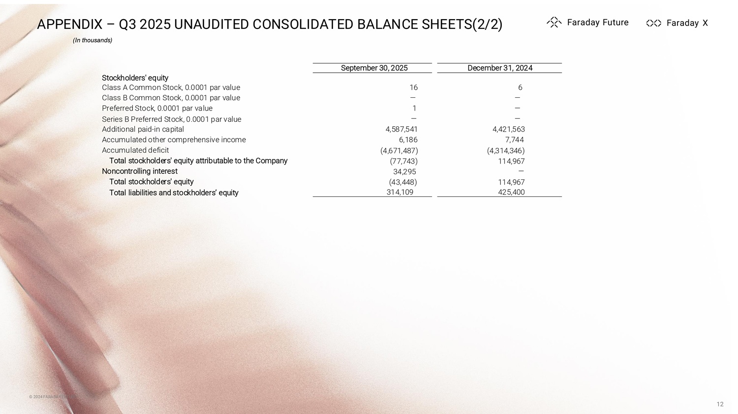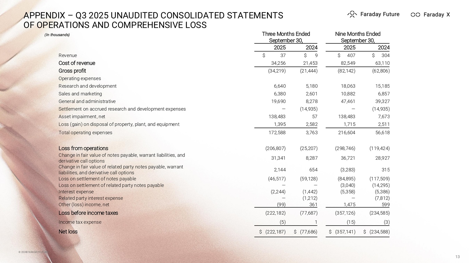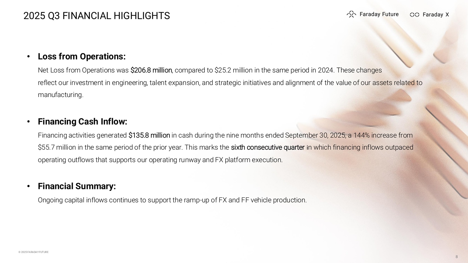 2025年第3四半期は、FF91プログラム活動からFF92へのアップグレードとFXスーパーワンの商業生産に向けた再編成と再調整にシフトするため、更新された事業計画に基づき、資産価値の保守的な1回限りの再調整を実施した。当社は、バランスシートを強化するため、営業効率の継続的改善、一部の負債の削減、より良い資金調達の選択肢の検討など、いくつかの措置を講じる予定である。