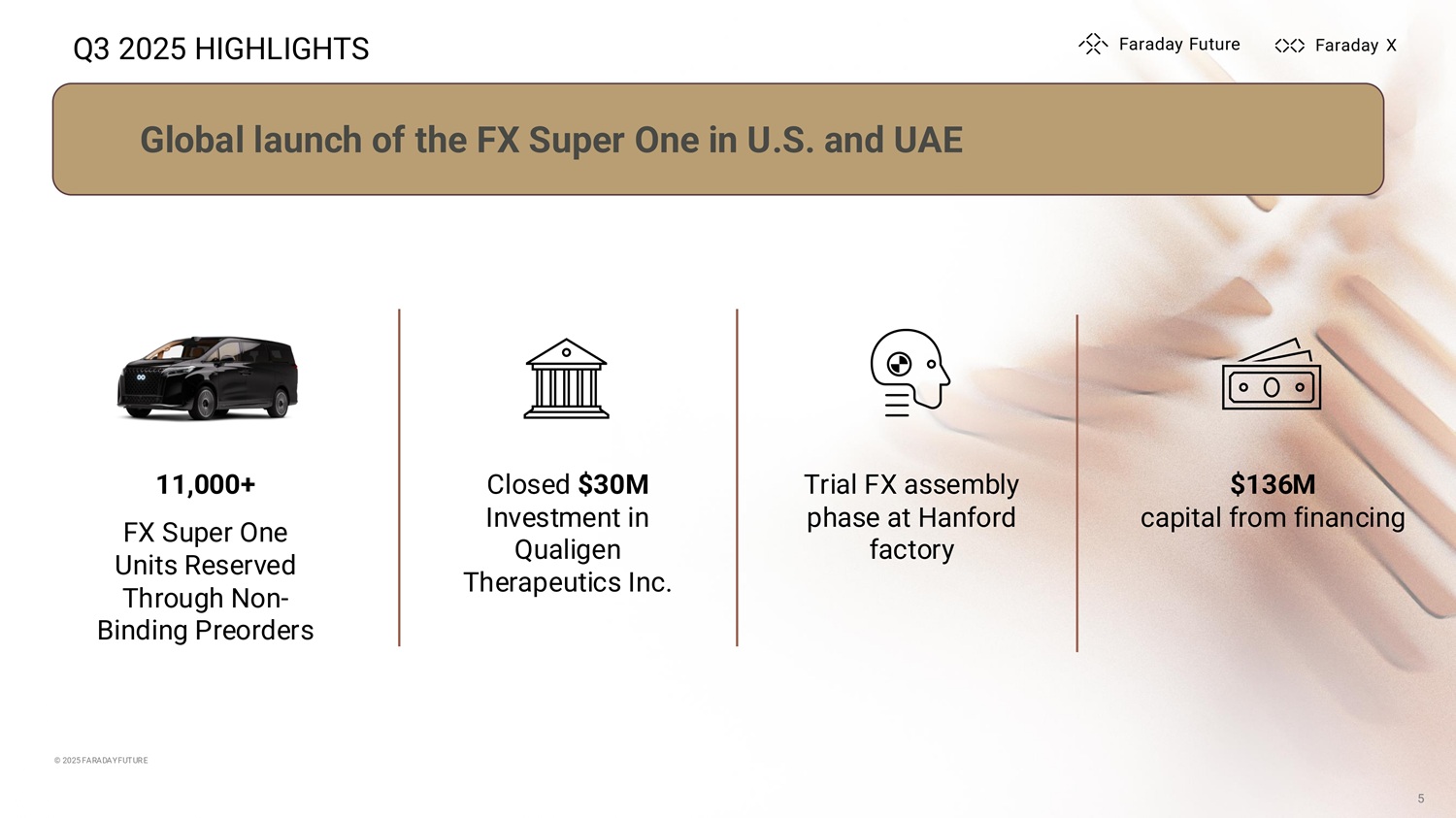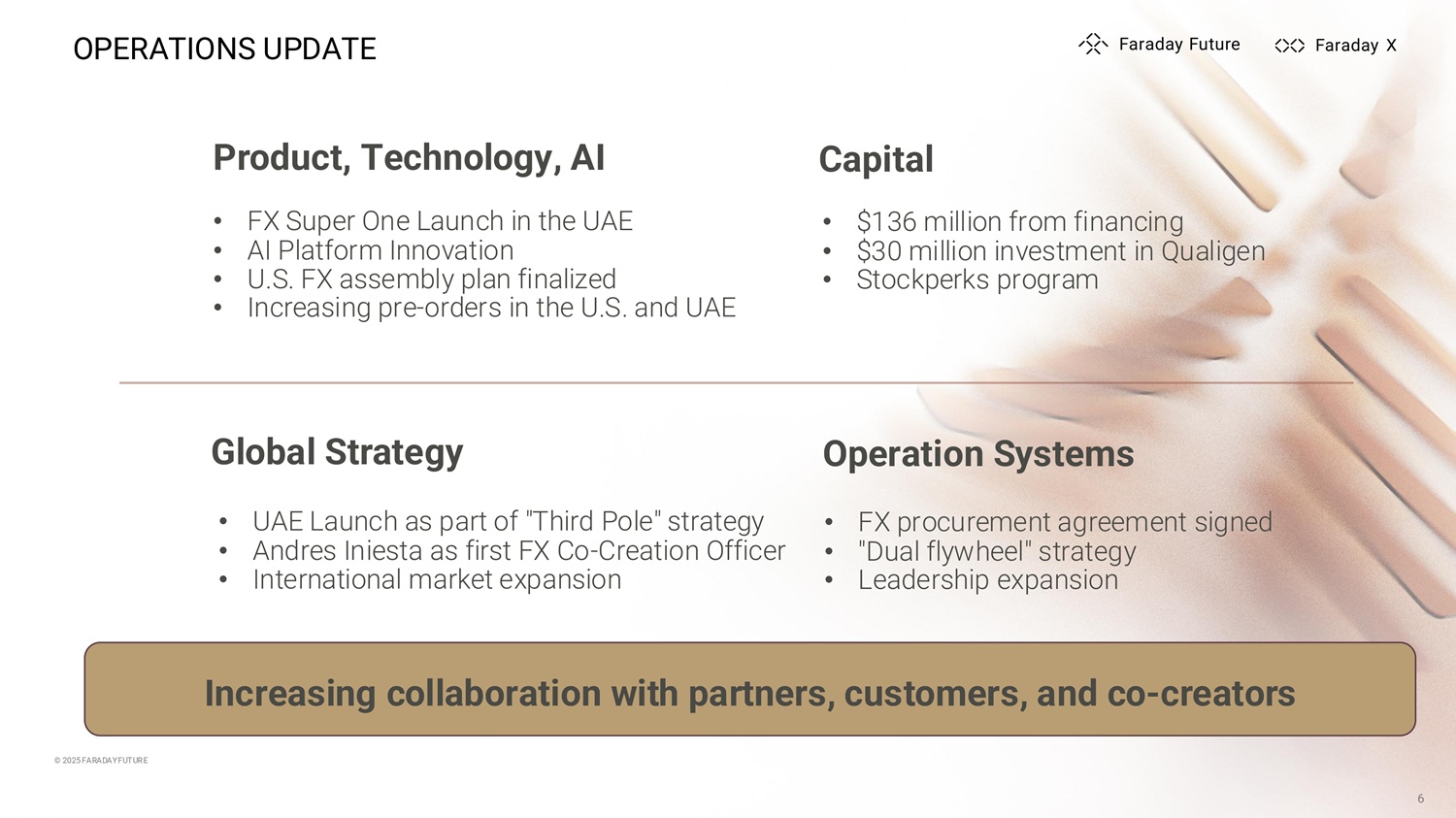 FXはまた、ニューヨーク、ボストン、ロサンゼルスで熱狂的な反響を受け、全米8つの主要州で共創・販売イベントを展開しました。FXスーパーワンは、当社の共創エコシステム・オンライン直販モデルの成功の高まりを反映し、力強い勢いを維持し続けています。予約注文の増加とブランド認知度の向上により、FX Super Oneは、当社の共創エコシステムを通じてユーザーとブランドエクイティの両方を促進しながら、AI主導の超高級モビリティブランドとしての地位を強化しています。
