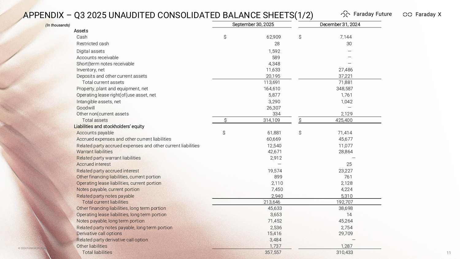 流動性と資金調達について、FFは以前、成長戦略、FXスーパーワンの発売準備、AIEV市場におけるFFのポジションを支援するため、約1億3,600万ドルの資金調達コミットメントを発表した。第3四半期末現在、FFは約82百万ドルを受領しており、残りの金額はクロージング条件とタイミング次第である。当社は引き続き慎重に資金調達を管理し、必要に応じて追加の資金調達機会を評価することで、商業化とエコシステムの実行を慎重に支援していく。