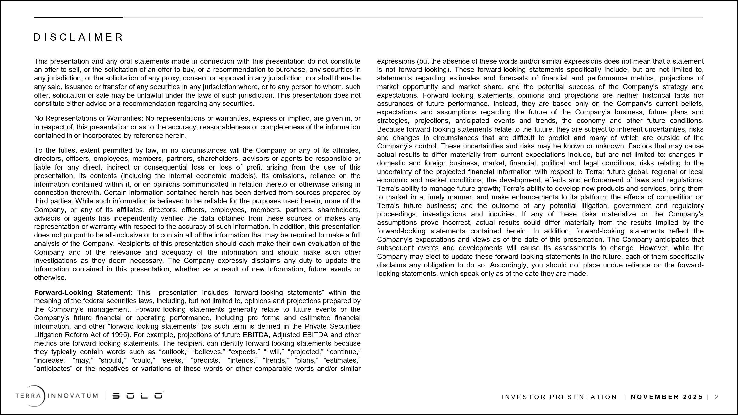 本プレスリリースには、テラ・イノベイタム社の経営陣が作成した意見や予測を含むがこれに限定されない、連邦証券法で定義される「将来の見通しに関する記述」が含まれています。将来予想に関する記述は、一般的に、将来の出来事、または将来の財務または営業業績に関するものであり、プロフォーマおよび推定財務情報、その他の「将来予想に関する記述」(この用語は1995年私募証券訴訟改革法で定義されています。)例えば、将来の売上高、EBITDA、調整後EBITDA、その他の指標の予測は、将来予想に関する記述です。将来見通しに関する記述は、通常、「見通し」、「確信」、「期待」、「予定」、「予測」、「継続」、「増加」、「可能性」、「はず」、「可能性」、「追求」、「予測」、「意図」、「傾向」、「計画」、「見積もり」、「予想」、またはこれらの否定語もしくは変形語、またはその他の類似語および/もしくは類似表現を含むため、受領者は将来見通しに関する記述を特定することができます(ただし、これらの語および/または類似表現がないからといって、その記述が将来見通しに関する記述ではないことを意味するものではありません)。これらの将来見通しに関する記述には、特に、財務および業績指標の見積もりおよび予測、市場機会および市場シェアの予測、Terra Innovatumの戦略および期待の潜在的成功に関する記述が含まれますが、これらに限定されるものではありません。将来の見通しに関する記述、意見および予測は、過去の事実でも将来の業績を保証するものでもありません。その代わりに、それらは、テラ・イノベイタム社の事業の将来、将来の計画や戦略、予測、予想される出来事や傾向、経済やその他の将来の状況に関する現在の信念、期待、仮定にのみ基づいています。将来予想に関する記述は、将来に関するものであるため、固有の不確実性、リスク、および予測困難な状況の変化の影響を受け、その多くはTerra Innovatumのコントロールの及ばないものです。これらの不確実性およびリスクは、既知または未知のものである可能性があります。実際の結果が現在の予想と大きく異なる可能性のある要因には、以下のものが含まれますが、これらに限定されるものではありません:国内外の事業、市場、金融、政治及び法的状況の変化、提案された企業結合の期待された利益を実現できないこと、Terra Innovatumに関する予測される財務情報の不確実性に関するリスク、将来の世界的、地域的又は地方的な経済及び市場の状況、法律及び規制の策定、影響及び施行;テラ・イノベイタム社の将来の成長を管理する能力、テラ・イノベイタム社が新製品やサービスを開発し、タイムリーに市場に投入し、そのプラットフォームを強化する能力、テラ・イノベイタム社の将来のビジネスに対する競争の影響、潜在的な訴訟、政府及び規制当局の手続き、調査及び問い合わせの結果。これらのリスクのいずれかが現実化した場合、またはTerra Innovatumの仮定が正しくないことが判明した場合、実際の結果は、ここに含まれる将来の見通しに関する記述によって暗示される結果とは大きく異なる可能性があります。また、将来の見通しに関する記述は、本プレゼンテーションの日付現在におけるTerra Innovatumの予想および見解を反映したものです。テラ・イノベイタムは、その後の出来事や進展により、その評価が変わることを予想しています。しかしながら、テラ・イノベイタムは、将来、これらの将来見通しに関する記述を更新することを選択する可能性がありますが、テラ・イノベイタムの各社は、そのような義務を明確に否認します。従って、あなたは、それらが作成された日現在においてのみ語られる将来の見通しに関する記述を過度に信頼すべきではありません。