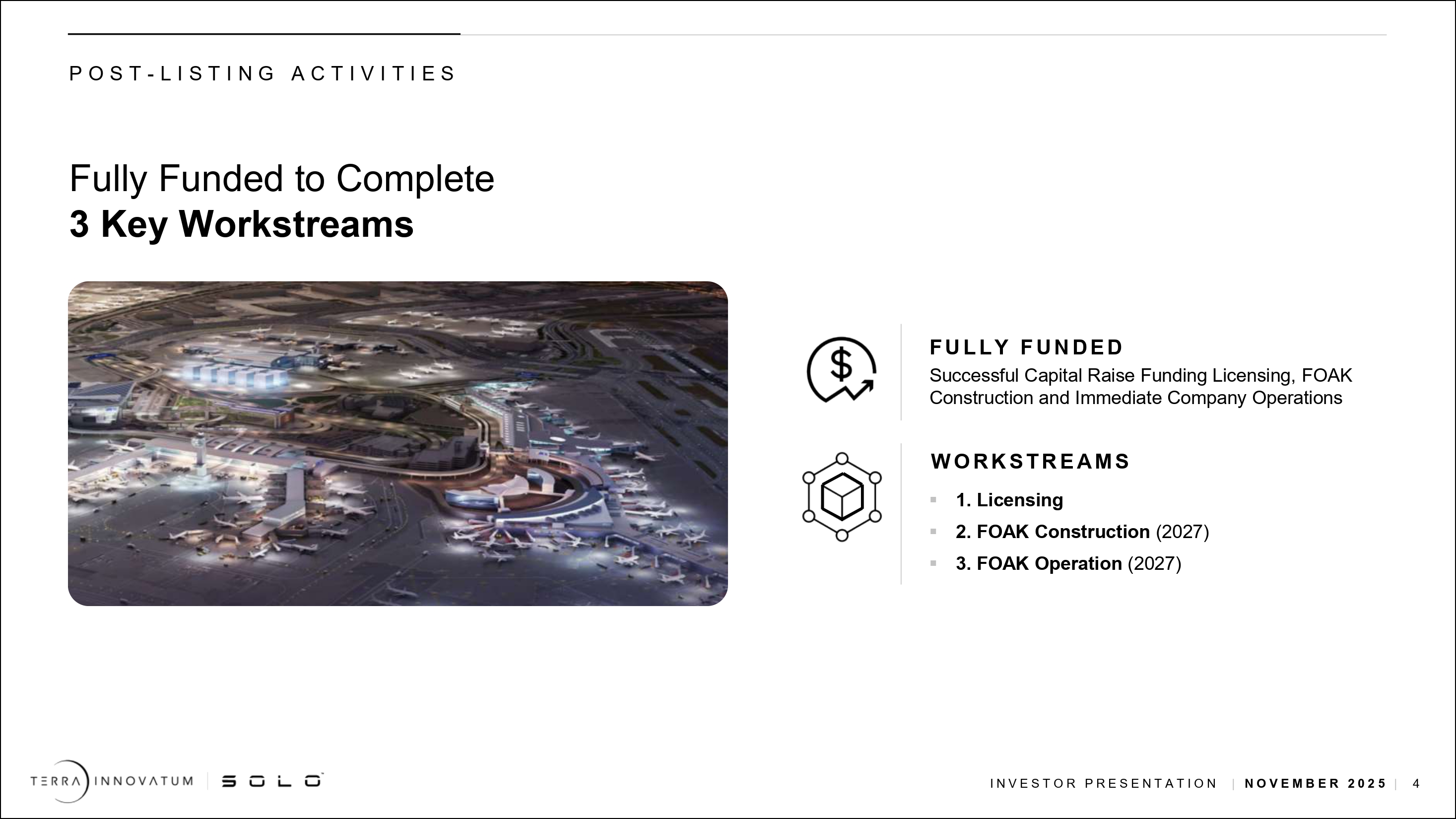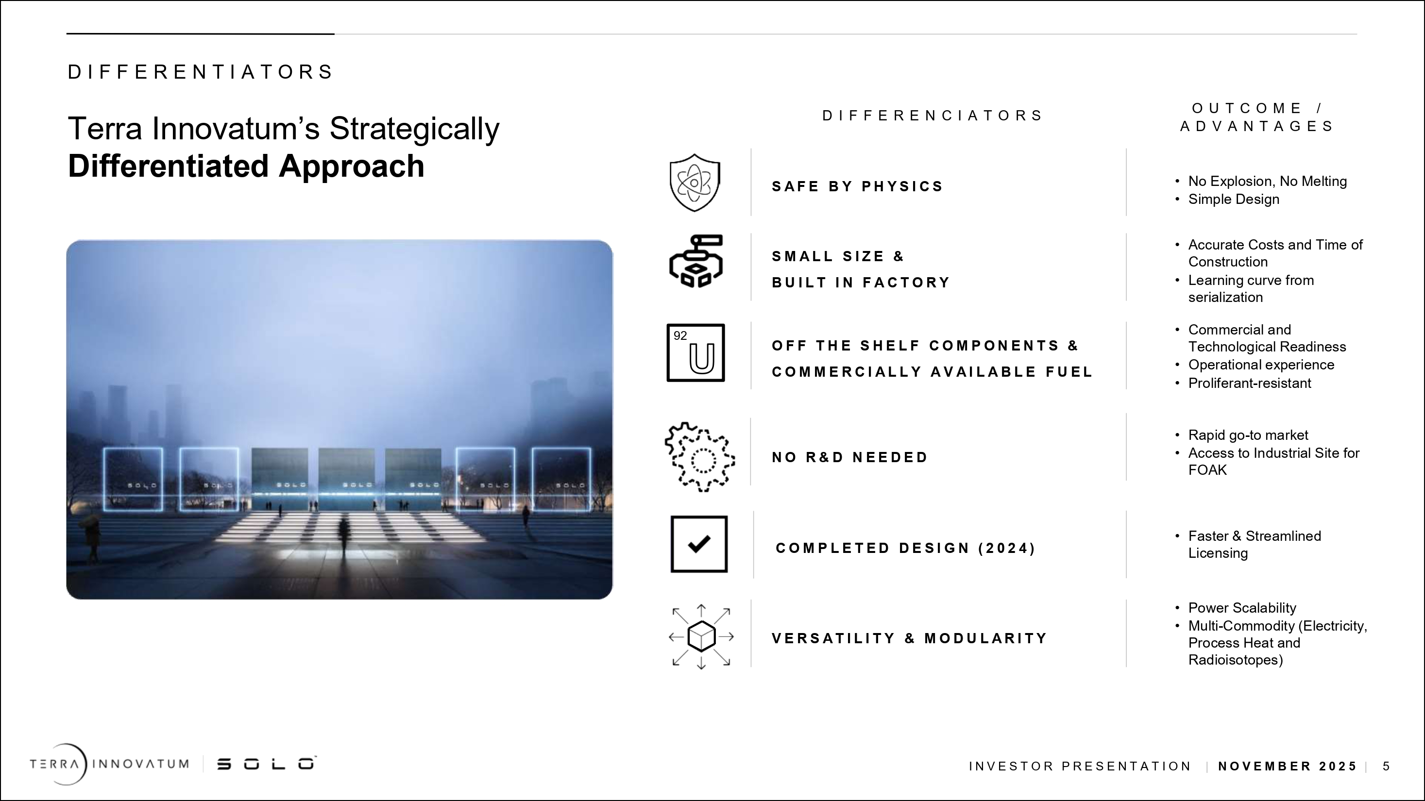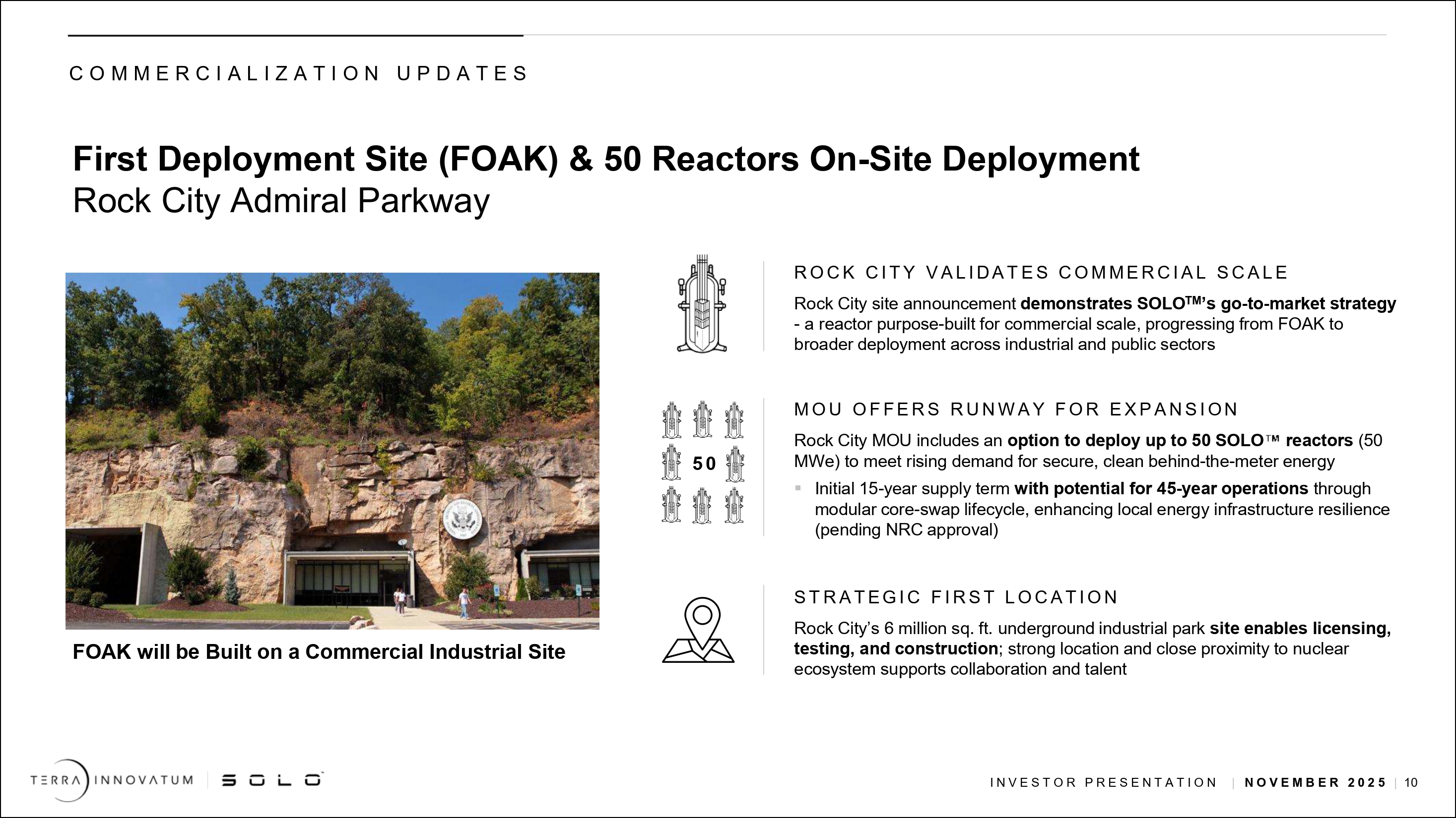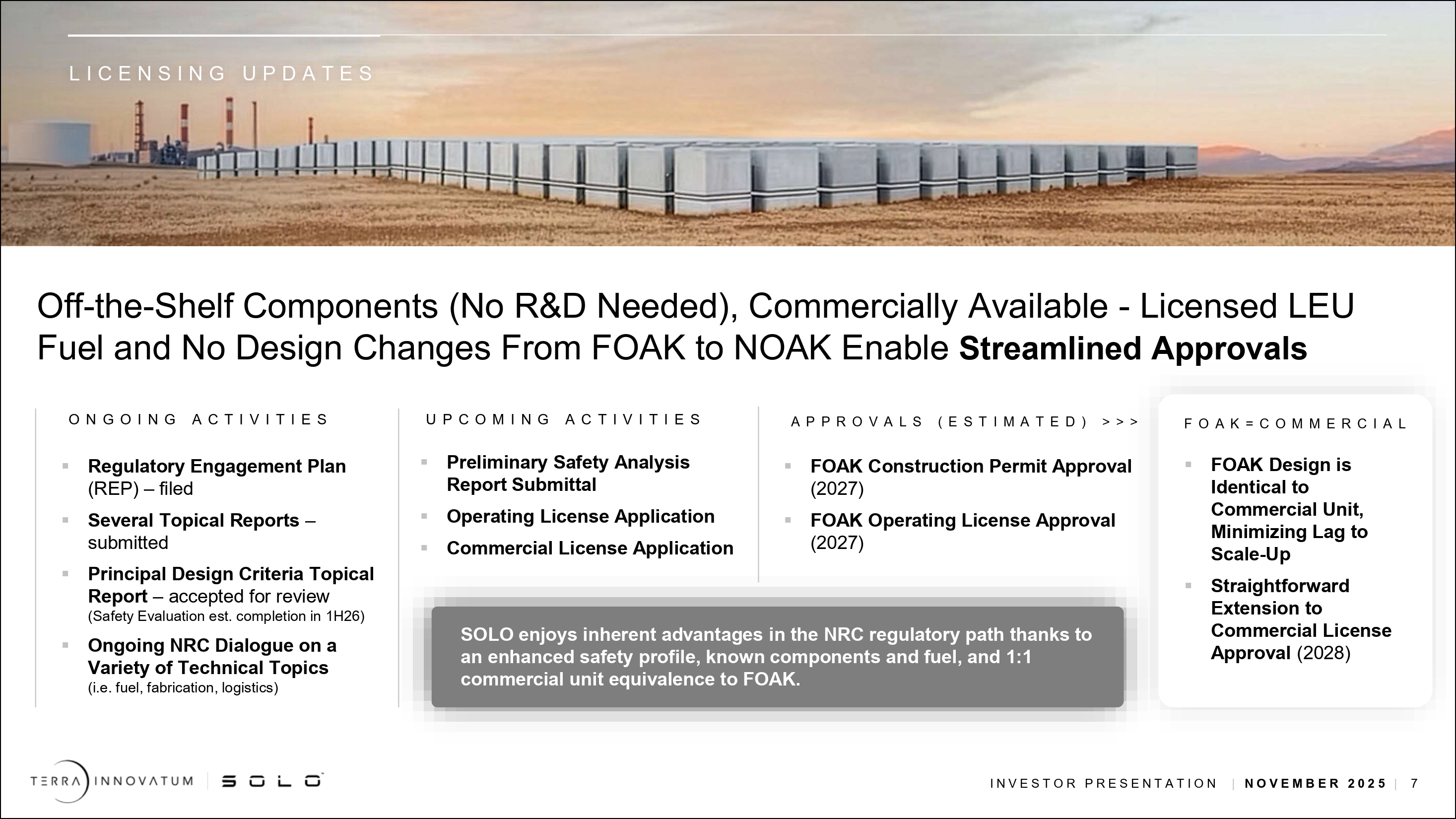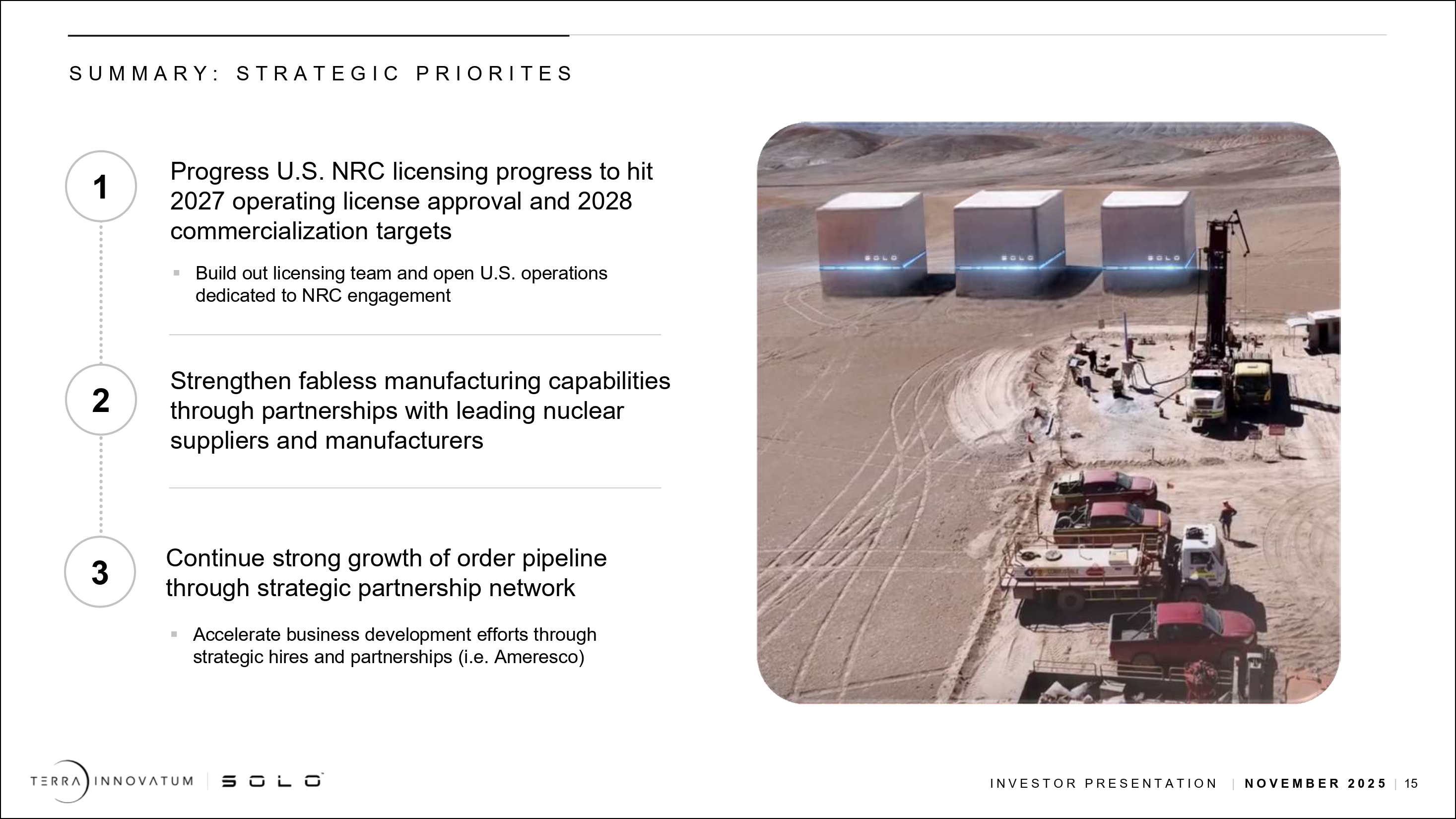 「2027年までにマイクロモジュール・ソリューションを配備し、2028年までに商業化するという明確な道筋があります。設計は完了し、米国NRCとの許認可プロセスも明確で、サプライチェーンも完全に整っており、FOAK配備に必要な資金もあります。今後1年間の主な焦点は、1)2026年半ばまでに安全性分析報告書を提出し、2026年初頭に運転許可を取得する予定で米国NRCの手続きを進めること、2)サードパーティのサプライヤー工場で製造活動を開始すること、3)SOLOTMソリューションの受注を確定することです。私たちは、これらの優先事項を実行する能力に自信を持っており、将来が楽しみです」。