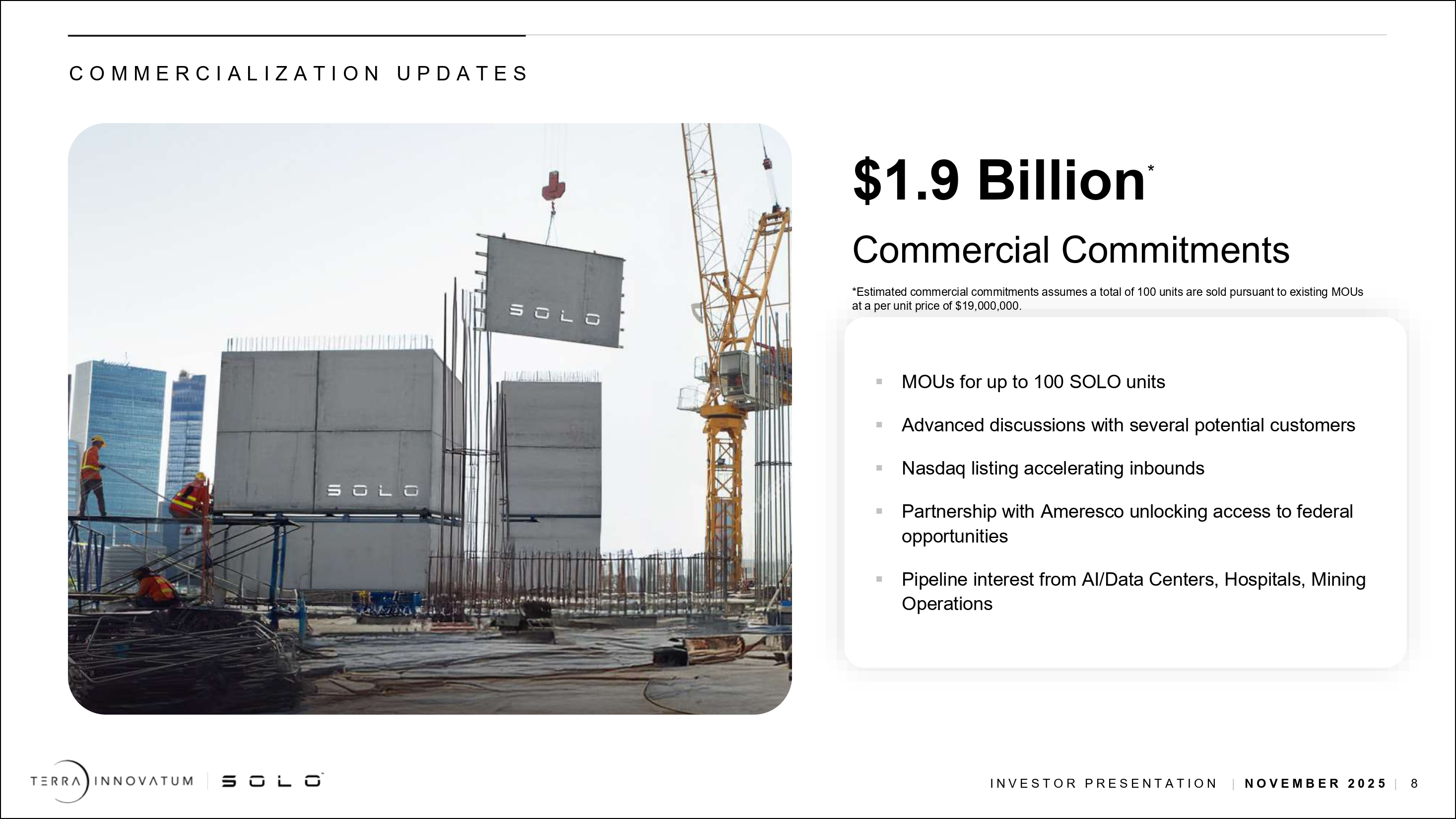 | ● | 拘束力のないMOUの下で、合計100台のSOLOユニットの商業的コミットメントを獲得し、世界の主要セクターにおける市場需要の高まりと初期段階での採用が強化された。 |