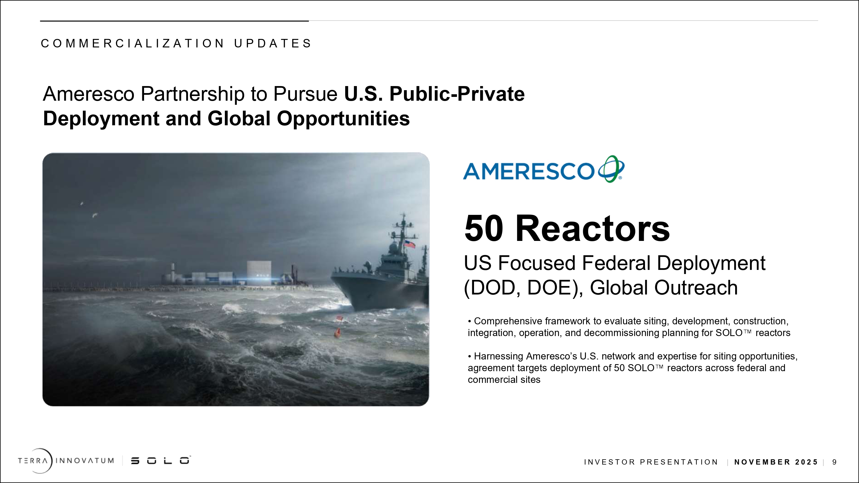 | ● | アメレスコ社と商業パートナーシップを締結し、米国および世界市場で最大50基のSOLO炉を展開する官民共同の機会を追求するとともに、Rait 88社および官民のその他の戦略的パートナーとの商業展開イニシアティブを拡大する。 |