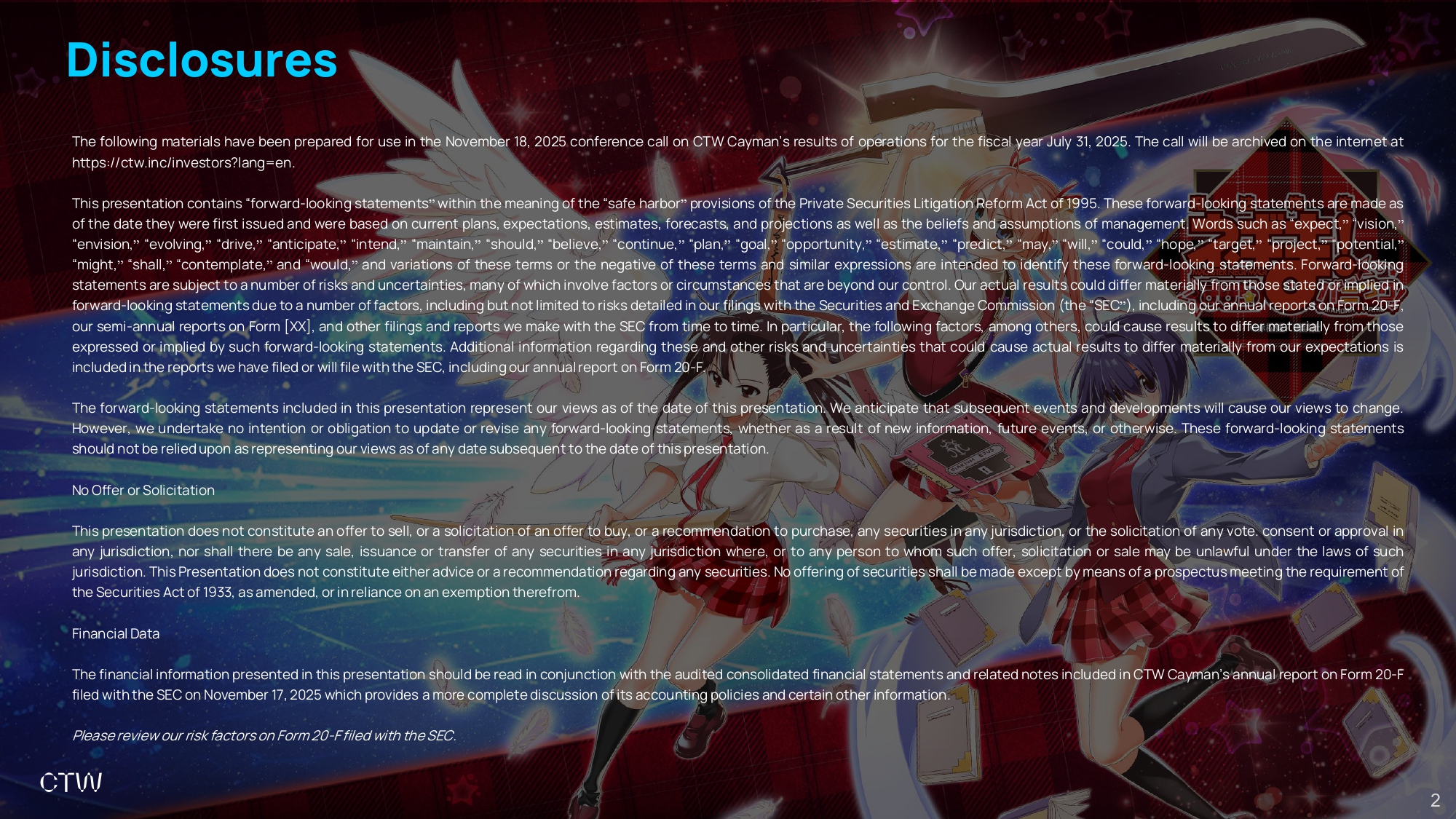 Disclosures 2 The following materials have been prepared for use in the November 18 , 2025 conference call on CTW Cayman’s results of operations for the fiscal year July 31 , 2025 . The call will be archived on the internet at https : //ctw . inc/investors?lang=en . This presentation contains “forward - looking statements ˮ within the meaning of the “safe harbor ˮ provisions of the Private Securities Litigation Reform Act of 1995 . These forward - looking statements are made as of the date they were first issued and were based on current plans, expectations, estimates, forecasts, and projections as well as the beliefs and assumptions of management . Words such as “expect, ˮ “vision, ˮ “envision, ˮ “evolving, ˮ “drive, ˮ “anticipate, ˮ “intend, ˮ “maintain, ˮ “should, ˮ “believe, ˮ “continue, ˮ “plan, ˮ “goal, ˮ “opportunity, ˮ “estimate, ˮ “predict, ˮ “may, ˮ “will, ˮ “could, ˮ “hope, ˮ “target, ˮ “project, ˮ “potential, ˮ “might, ˮ “shall, ˮ “contemplate, ˮ and “would, ˮ and variations of these terms or the negative of these terms and similar expressions are intended to identify these forward - looking statements . Forward - looking statements are subject to a number of risks and uncertainties, many of which involve factors or circumstances that are beyond our control . Our actual results could differ materially from those stated or implied in forward - looking statements due to a number of factors, including but not limited to risks detailed in our filings with the Securities and Exchange Commission (the “SEC ˮ ), including our annual reports on Form 20 - F, our semi - annual reports on Form [XX], and other filings and reports we make with the SEC from time to time . In particular, the following factors, among others, could cause results to differ materially from those expressed or implied by such forward - looking statements . Additional information regarding these and other risks and uncertainties that could cause actual results to differ materially from our expectations is included in the reports we have filed or will file with the SEC, including our annual report on Form 20 - F . The forward - looking statements included in this presentation represent our views as of the date of this presentation . We anticipate that subsequent events and developments will cause our views to change . However, we undertake no intention or obligation to update or revise any forward - looking statements, whether as a result of new information, future events, or otherwise . These forward - looking statements should not be relied upon as representing our views as of any date subsequent to the date of this presentation . No Offer or Solicitation This presentation does not constitute an offer to sell, or a solicitation of an offer to buy, or a recommendation to purchase, any securities in any jurisdiction, or the solicitation of any vote . consent or approval in any jurisdiction, nor shall there be any sale, issuance or transfer of any securities in any jurisdiction where, or to any person to whom such offer, solicitation or sale may be unlawful under the laws of such jurisdiction . This Presentation does not constitute either advice or a recommendation regarding any securities . No offering of securities shall be made except by means of a prospectus meeting the requirement of the Securities Act of 1933 , as amended, or in reliance on an exemption therefrom . Financial Data The financial information presented in this presentation should be read in conjunction with the audited consolidated financial statements and related notes included in CTW Cayman’s annual report on Form 20 - F filed with the SEC on November 17 , 2025 which provides a more complete discussion of its accounting policies and certain other information . Please review our risk factors on Form 20 - F filed with the SEC .