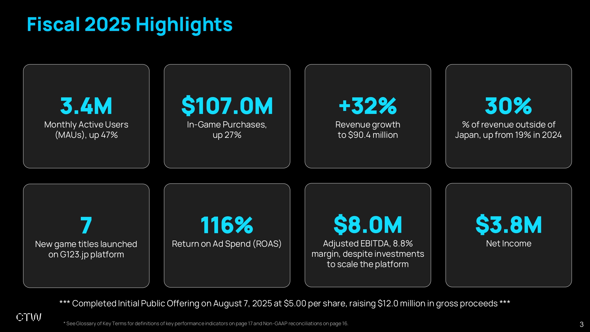 “Revenue of $90.4 million in fiscal 2025 grew 32%, with accelerated growth of 41% YoY in the second half of the year as compared to the second half of fiscal 2024, reflecting high engagement with our platform and the success of our recently launched games. Encouragingly, revenue increased in all of our major geographic markets in 2025, confirming global interest in anime and in our ability to source and launch games based on compelling IP. This performance is in line with our strategic focus to expand our user base beyond Japan, our historically largest market, and into other regions, especially North America. Users outside of Japan accounted for 30% of revenue in fiscal 2025, up from 19% in the previous year, and we believe we can expand even further into other markets as anime increasingly goes mainstream around the world.”
