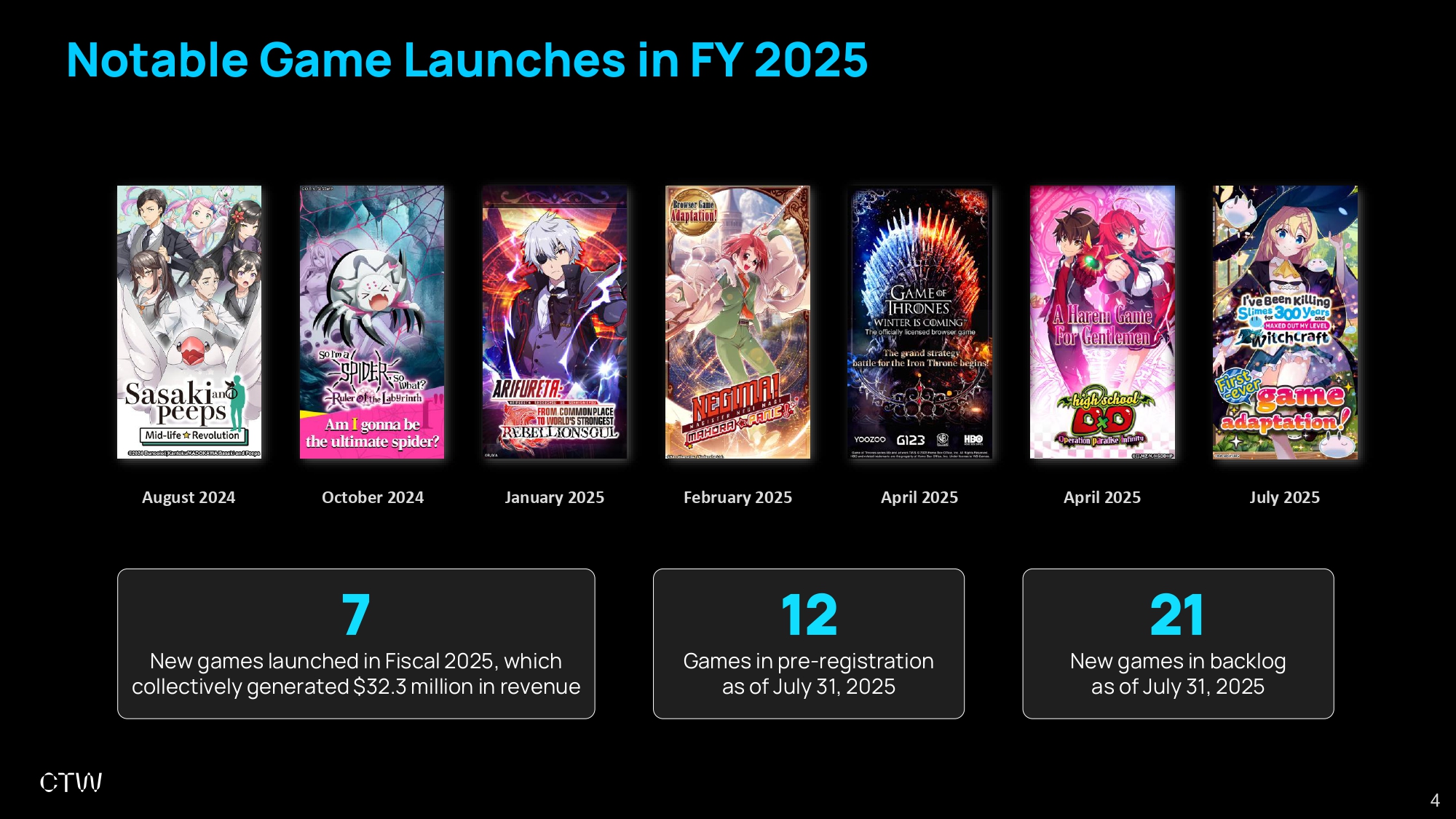 Fiscal 2025 Highlights 3.4M Monthly Active Users (MAUs), up 47% 7 New game titles launched on G123.jp platform $107.0M In - Game Purchases, up 27% 116% Return on Ad Spend (ROAS) +32% Revenue growth to $90.4 million $8.0M Adjusted EBITDA, 8.8% margin, despite investments to scale the platform 30% % of revenue outside of Japan, up from 19% in 2024 $3.8M Net Income * See Glossary of Key Terms for definitions of key performance indicators on page 17 and Non - GAAP reconciliations on page 16. 3 *** Completed Initial Public Offering on August 7, 2025 at $5.00 per share, raising $12.0 million in gross proceeds ***