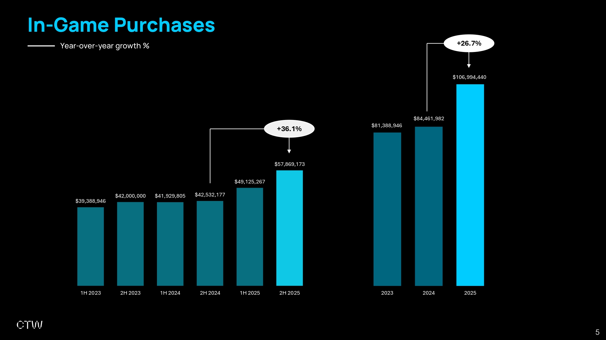 In - Game Purchases Year - over - year growth % $81,388,946 $84,461,982 $106,994,440 2023 2024 2025 $39,388,946 $42,000,000 $41,929,805 $42,532,177 $57,869,173 $49,125,267 1H 2023 2H 2023 1H 2024 2H 2024 1H 2025 2H 2025 +36.1% +26.7% 5