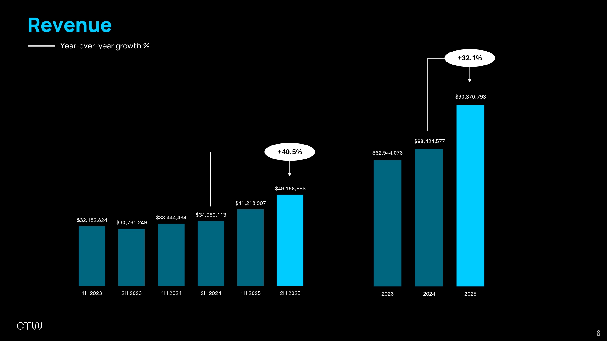 Revenue Year - over - year growth % $32,182,824 $30,761,249 $33,444,464 $34,980,113 $49,156,886 $41,213,907 1H 2023 2H 2023 1H 2024 2H 2024 1H 2025 2H 2025 $62,944,073 $68,424,577 $90,370,793 2023 2024 2025 +40.5% +32.1% 6