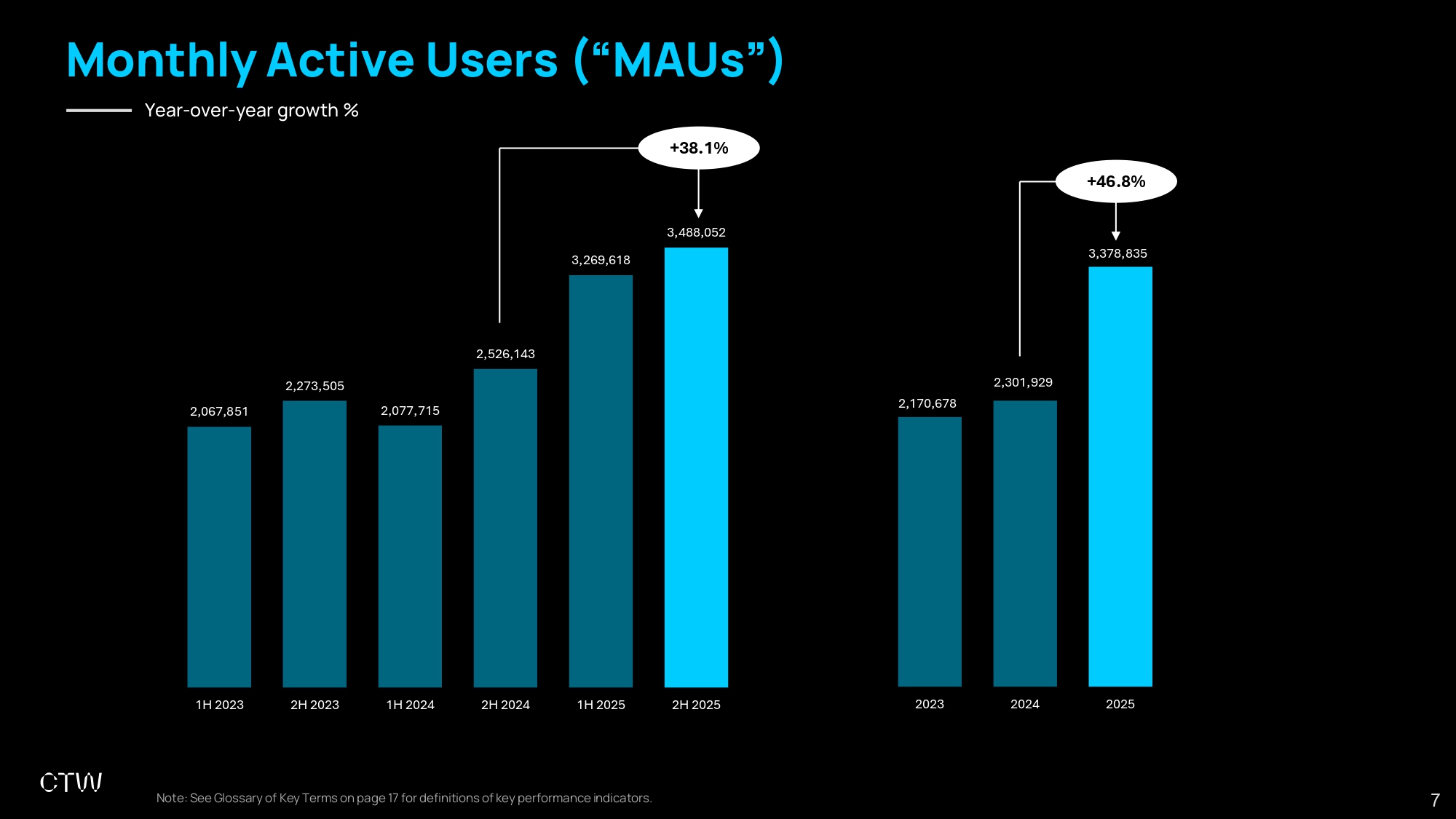 | Monthly active users (“MAUs”)(3) | 3,378,835 | 2,301,929 | 2,170,678 | |||||||||