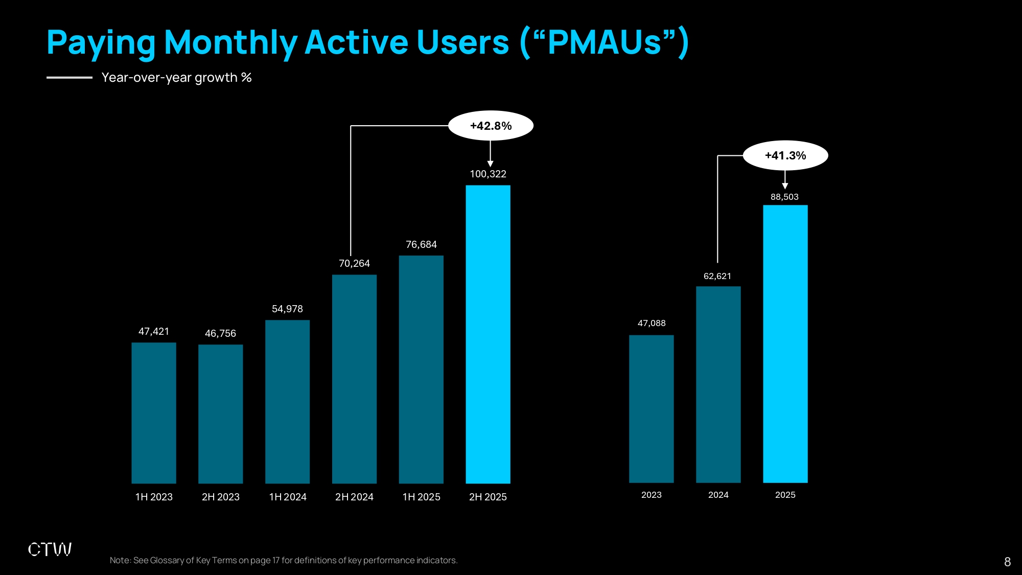 Monthly Active Users (“MAUs”) Year - over - year growth % 2,170,678 2,301,929 3,378,835 2023 2024 2025 +46.8% 2,067,851 2,273,505 2,077,715 2,526,143 3,269,618 3,488,052 1H 2023 2H 2023 1H 2024 2H 2024 1H 2025 2H 2025 +38.1% Note: See Glossary of Key Terms on page 17 for definitions of key performance indicators. 7