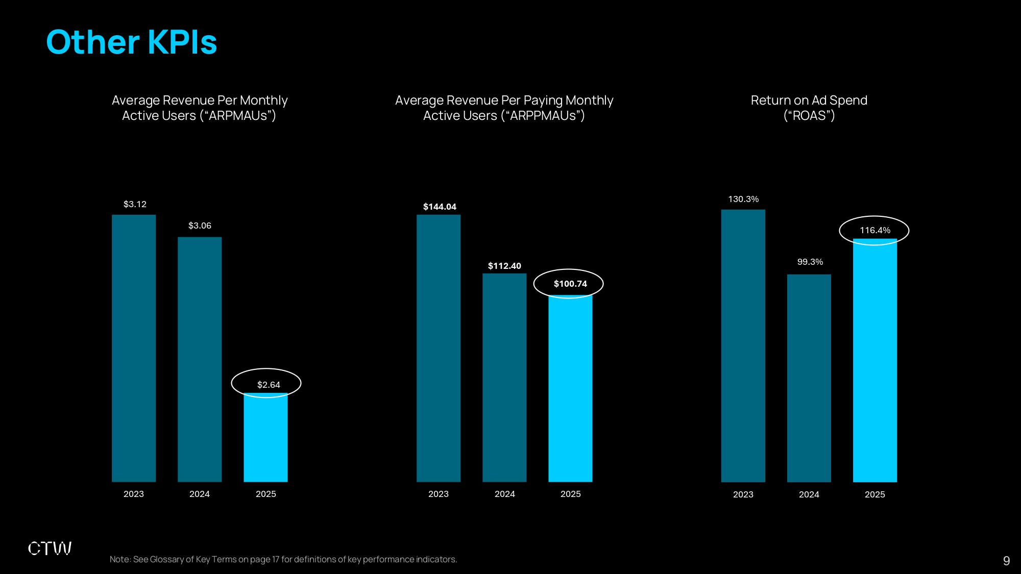 Other KPIs $144.04 $112.40 $100.74 2023 2024 2025 $3.12 $3.06 $2.64 2023 2024 2025 Average Revenue Per Monthly Active Users (“ARPMAUs”) Average Revenue Per Paying Monthly Active Users (“ARPPMAUs”) Return on Ad Spend (“ROAS”) 130.3% 99.3% 116.4% 2023 2024 2025 Note: See Glossary of Key Terms on page 17 for definitions of key performance indicators. 9