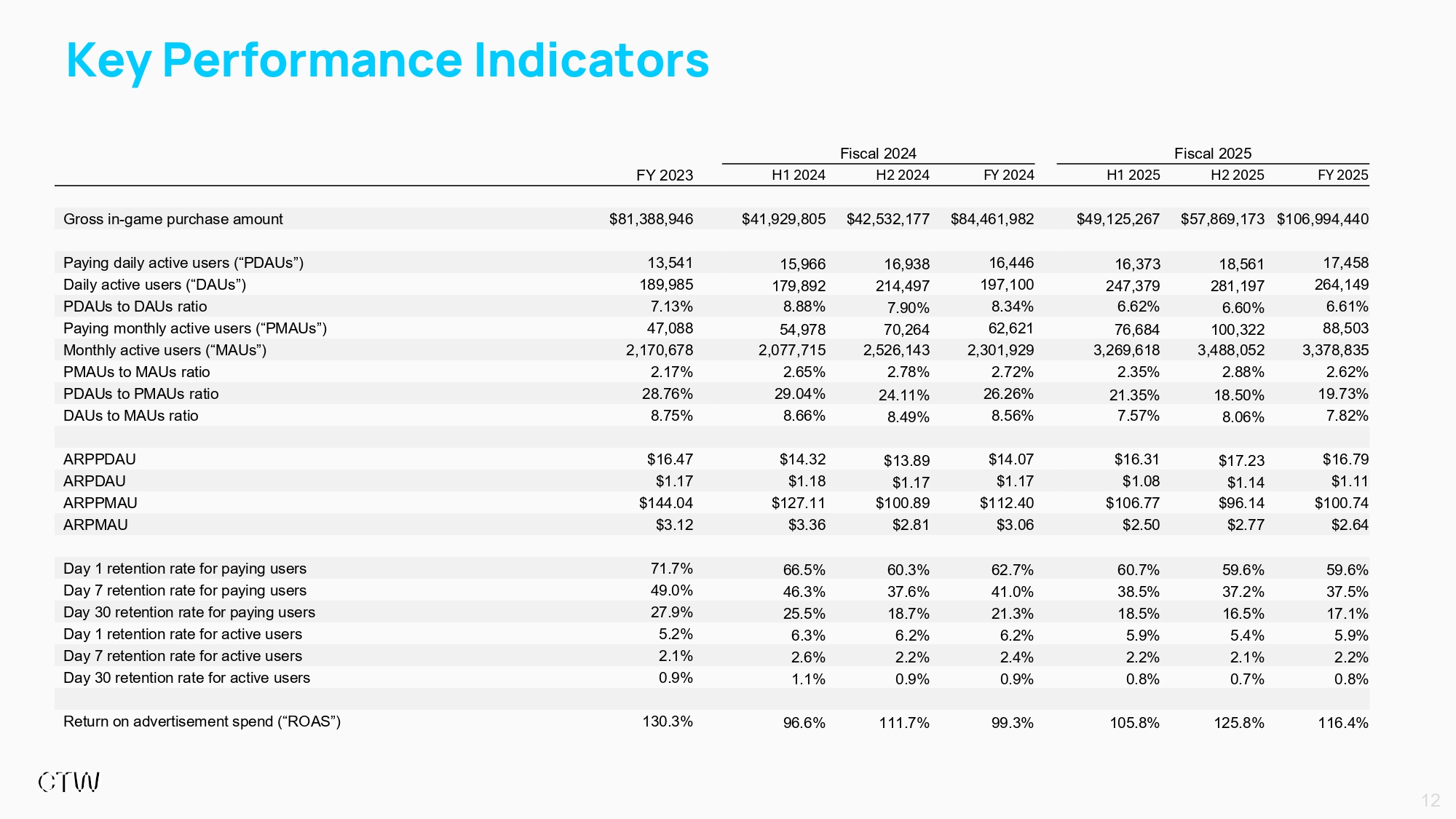 Key Performance Indicators Fiscal 2025 Fiscal 2024 FY 2025 H2 2025 H1 2025 FY 2024 H2 2024 H1 2024 FY 2023 $106,994,440 $57,869,173 $49,125,267 $84,461,982 $42,532,177 $41,929,805 $81,388,946 Gross in - game purchase amount 17,458 18,561 16,373 16,446 16,938 15,966 13,541 Paying daily active users (“PDAUs”) 264,149 281,197 247,379 197,100 214,497 179,892 189,985 Daily active users (“DAUs”) 6.61% 6.60% 6.62% 8.34% 7.90% 8.88% 7.13% PDAUs to DAUs ratio 88,503 100,322 76,684 62,621 70,264 54,978 47,088 Paying monthly active users (“PMAUs”) 3,378,835 3,488,052 3,269,618 2,301,929 2,526,143 2,077,715 2,170,678 Monthly active users (“MAUs”) 2.62% 2.88% 2.35% 2.72% 2.78% 2.65% 2.17% PMAUs to MAUs ratio 19.73% 18.50% 21.35% 26.26% 24.11% 29.04% 28.76% PDAUs to PMAUs ratio 7.82% 8.06% 7.57% 8.56% 8.49% 8.66% 8.75% DAUs to MAUs ratio $16.79 $17.23 $16.31 $14.07 $13.89 $14.32 $16.47 ARPPDAU $1.11 $1.14 $1.08 $1.17 $1.17 $1.18 $1.17 ARPDAU $100.74 $96.14 $106.77 $112.40 $100.89 $127.11 $144.04 ARPPMAU $2.64 $2.77 $2.50 $3.06 $2.81 $3.36 $3.12 ARPMAU 59.6% 59.6% 60.7% 62.7% 60.3% 66.5% 71.7% Day 1 retention rate for paying users 37.5% 37.2% 38.5% 41.0% 37.6% 46.3% 49.0% Day 7 retention rate for paying users 17.1% 16.5% 18.5% 21.3% 18.7% 25.5% 27.9% Day 30 retention rate for paying users 5.9% 5.4% 5.9% 6.2% 6.2% 6.3% 5.2% Day 1 retention rate for active users 2.2% 2.1% 2.2% 2.4% 2.2% 2.6% 2.1% Day 7 retention rate for active users 0.8% 0.7% 0.8% 0.9% 0.9% 1.1% 0.9% Day 30 retention rate for active users 116.4% 125.8% 105.8% 99.3% 111.7% 96.6% 130.3% Return on advertisement spend (“ROAS”) 12