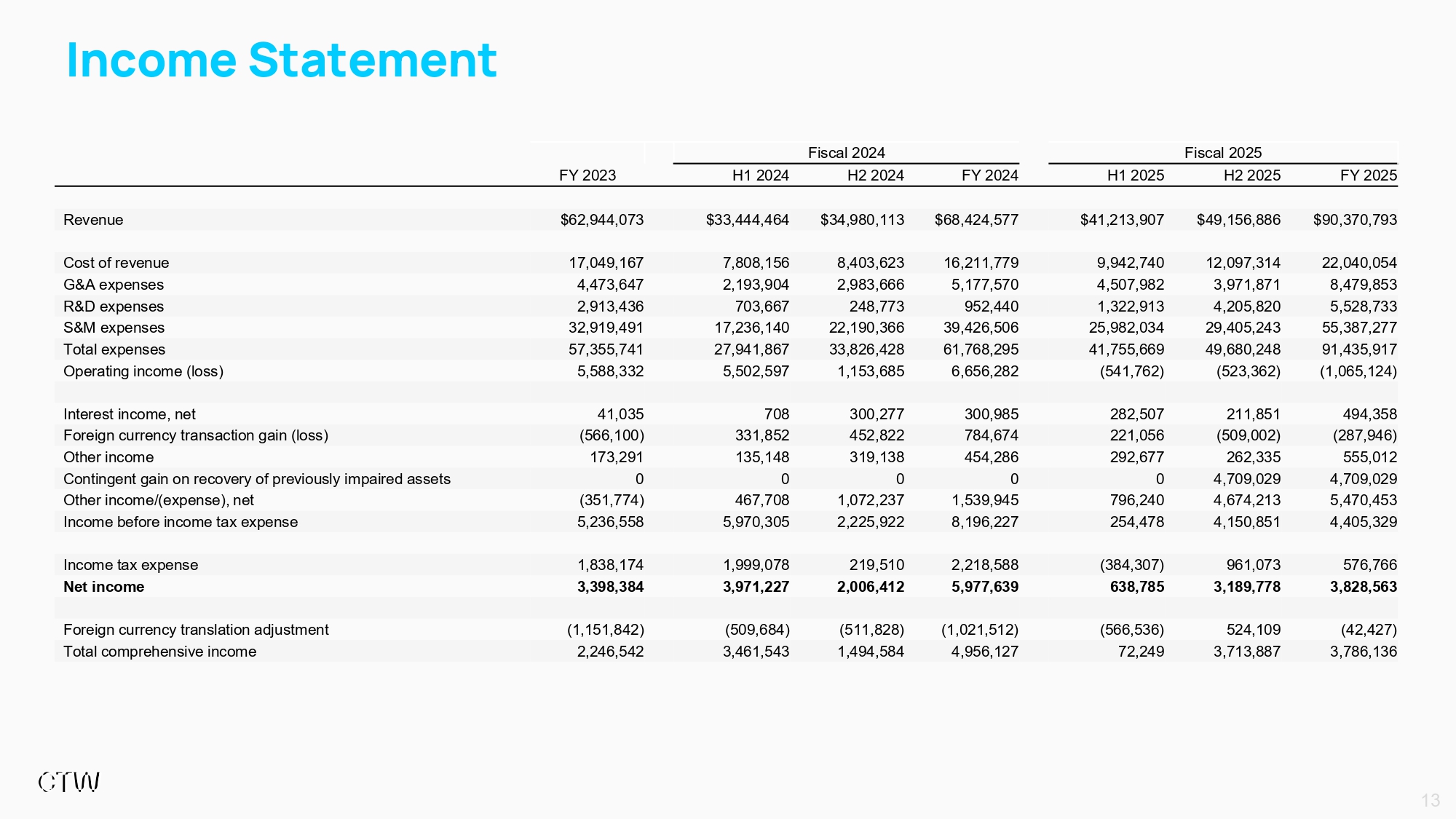 Income Statement Fiscal 2025 Fiscal 2024 FY 2025 H2 2025 H1 2025 FY 2024 H2 2024 H1 2024 FY 2023 $90,370,793 $49,156,886 $41,213,907 $68,424,577 $34,980,113 $33,444,464 $62,944,073 Revenue 22,040,054 12,097,314 9,942,740 16,211,779 8,403,623 7,808,156 17,049,167 Cost of revenue 8,479,853 3,971,871 4,507,982 5,177,570 2,983,666 2,193,904 4,473,647 G&A expenses 5,528,733 4,205,820 1,322,913 952,440 248,773 703,667 2,913,436 R&D expenses 55,387,277 29,405,243 25,982,034 39,426,506 22,190,366 17,236,140 32,919,491 S&M expenses 91,435,917 49,680,248 41,755,669 61,768,295 33,826,428 27,941,867 57,355,741 Total expenses (1,065,124) (523,362) (541,762) 6,656,282 1,153,685 5,502,597 5,588,332 Operating income (loss) 494,358 211,851 282,507 300,985 300,277 708 41,035 Interest income, net (287,946) (509,002) 221,056 784,674 452,822 331,852 (566,100) Foreign currency transaction gain (loss) 555,012 262,335 292,677 454,286 319,138 135,148 173,291 Other income 4,709,029 4,709,029 0 0 0 0 0 Contingent gain on recovery of previously impaired assets 5,470,453 4,674,213 796,240 1,539,945 1,072,237 467,708 (351,774) Other income/(expense), net 4,405,329 4,150,851 254,478 8,196,227 2,225,922 5,970,305 5,236,558 Income before income tax expense 576,766 961,073 (384,307) 2,218,588 219,510 1,999,078 1,838,174 Income tax expense 3,828,563 3,189,778 638,785 5,977,639 2,006,412 3,971,227 3,398,384 Net income (42,427) 524,109 (566,536) (1,021,512) (511,828) (509,684) (1,151,842) Foreign currency translation adjustment 3,786,136 3,713,887 72,249 4,956,127 1,494,584 3,461,543 2,246,542 Total comprehensive income 13