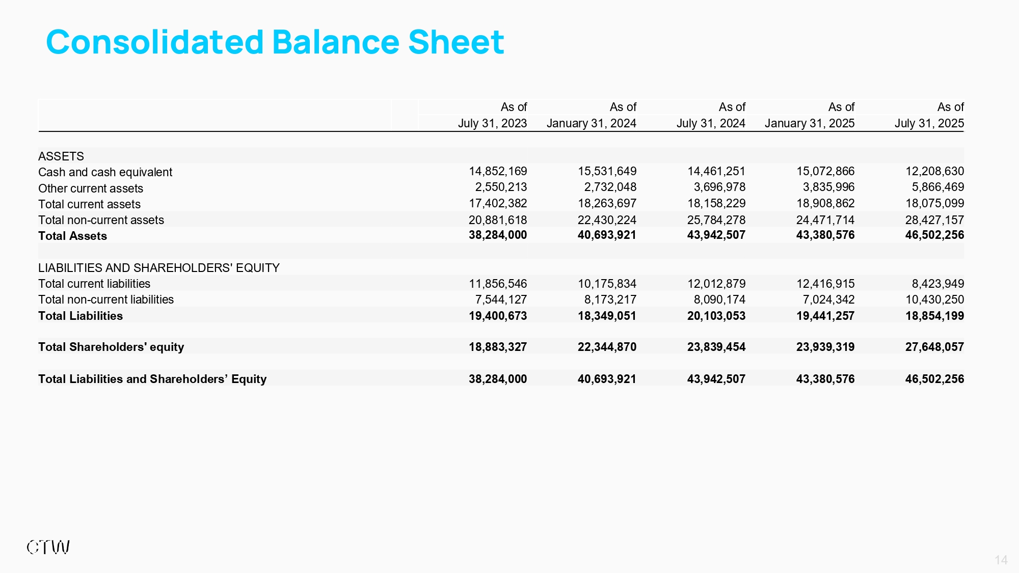 Consolidated Balance Sheet As of As of As of As of As of July 31, 2025 January 31, 2025 July 31, 2024 January 31, 2024 July 31, 2023 ASSETS 12,208,630 15,072,866 14,461,251 15,531,649 14,852,169 Cash and cash equivalent 5,866,469 3,835,996 3,696,978 2,732,048 2,550,213 Other current assets 18,075,099 18,908,862 18,158,229 18,263,697 17,402,382 Total current assets 28,427,157 24,471,714 25,784,278 22,430,224 20,881,618 Total non - current assets 46,502,256 43,380,576 43,942,507 40,693,921 38,284,000 Total Assets LIABILITIES AND SHAREHOLDERS' EQUITY 8,423,949 12,416,915 12,012,879 10,175,834 11,856,546 Total current liabilities 10,430,250 7,024,342 8,090,174 8,173,217 7,544,127 Total non - current liabilities 18,854,199 19,441,257 20,103,053 18,349,051 19,400,673 Total Liabilities 27,648,057 23,939,319 23,839,454 22,344,870 18,883,327 Total Shareholders' equity 46,502,256 43,380,576 43,942,507 40,693,921 38,284,000 Total Liabilities and Shareholders’ Equity 14