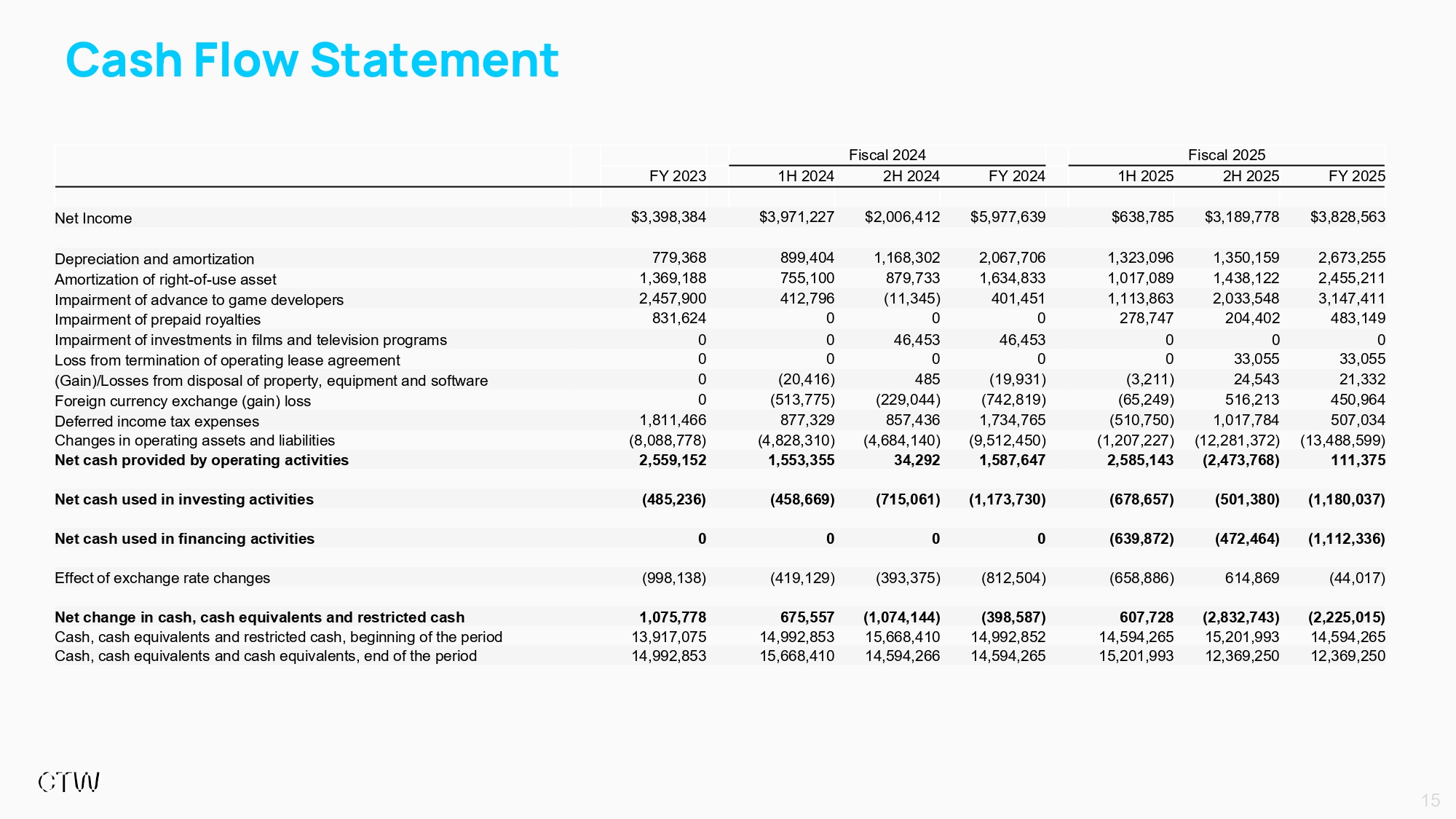 Cash Flow Statement Fiscal 2025 Fiscal 2024 FY 2025 2H 2025 1H 2025 FY 2024 2H 2024 1H 2024 FY 2023 $3,828,563 $3,189,778 $638,785 $5,977,639 $2,006,412 $3,971,227 $3,398,384 Net Income 2,673,255 1,350,159 1,323,096 2,067,706 1,168,302 899,404 779,368 Depreciation and amortization 2,455,211 1,438,122 1,017,089 1,634,833 879,733 755,100 1,369,188 Amortization of right - of - use asset 3,147,411 2,033,548 1,113,863 401,451 (11,345) 412,796 2,457,900 Impairment of advance to game developers 483,149 204,402 278,747 0 0 0 831,624 Impairment of prepaid royalties 0 0 0 46,453 46,453 0 0 Impairment of investments in films and television programs 33,055 33,055 0 0 0 0 0 Loss from termination of operating lease agreement 21,332 24,543 (3,211) (19,931) 485 (20,416) 0 (Gain)/Losses from disposal of property, equipment and software 450,964 516,213 (65,249) (742,819) (229,044) (513,775) 0 Foreign currency exchange (gain) loss 507,034 1,017,784 (510,750) 1,734,765 857,436 877,329 1,811,466 Deferred income tax expenses (13,488,599) (12,281,372) (1,207,227) (9,512,450) (4,684,140) (4,828,310) (8,088,778) Changes in operating assets and liabilities 111,375 (2,473,768) 2,585,143 1,587,647 34,292 1,553,355 2,559,152 Net cash provided by operating activities (1,180,037) (501,380) (678,657) (1,173,730) (715,061) (458,669) (485,236) Net cash used in investing activities (1,112,336) (472,464) (639,872) 0 0 0 0 Net cash used in financing activities (44,017) 614,869 (658,886) (812,504) (393,375) (419,129) (998,138) Effect of exchange rate changes (2,225,015) (2,832,743) 607,728 (398,587) (1,074,144) 675,557 1,075,778 Net change in cash, cash equivalents and restricted cash 14,594,265 15,201,993 14,594,265 14,992,852 15,668,410 14,992,853 13,917,075 Cash, cash equivalents and restricted cash, beginning of the period 12,369,250 12,369,250 15,201,993 14,594,265 14,594,266 15,668,410 14,992,853 Cash, cash equivalents and cash equivalents, end of the period 15