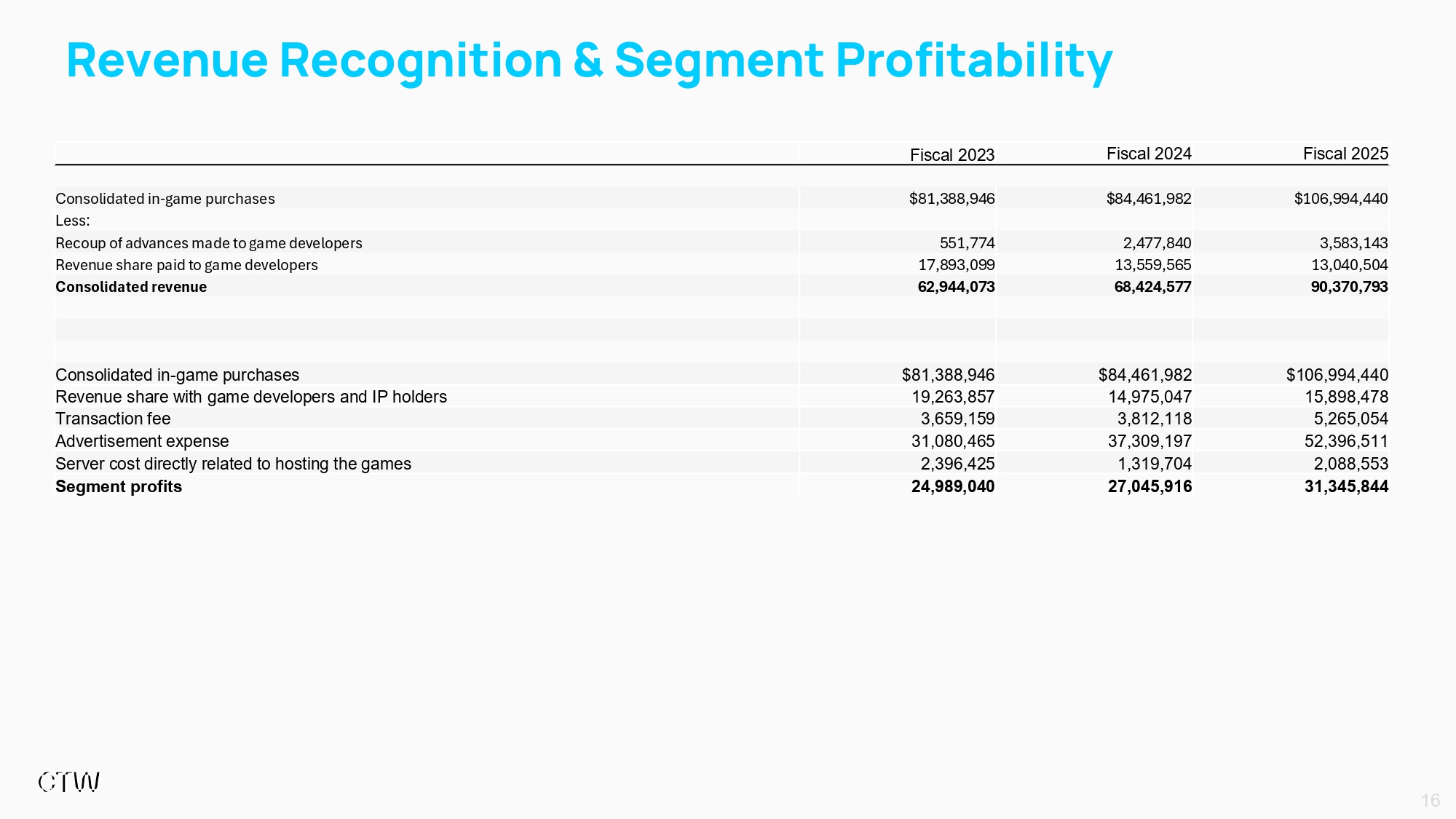 Revenue Recognition & Segment Profitability Fiscal 2025 Fiscal 2024 Fiscal 2023 $106,994,440 $84,461,982 $81,388,946 Consolidated in - game purchases Less: 3,583,143 2,477,840 551,774 Recoup of advances made to game developers 13,040,504 13,559,565 17,893,099 Revenue share paid to game developers G0,370,7G3 68,424,577 62,G44,073 Consolidated revenue $106,994,440 $84,461,982 $81,388,946 Consolidated in - game purchases 15,898,478 14,975,047 19,263,857 Revenue share with game developers and IP holders 5,265,054 3,812,118 3,659,159 Transaction fee 52,396,511 37,309,197 31,080,465 Advertisement expense 2,088,553 1,319,704 2,396,425 Server cost directly related to hosting the games 31,345,844 27,045,916 24,989,040 Segment profits 16