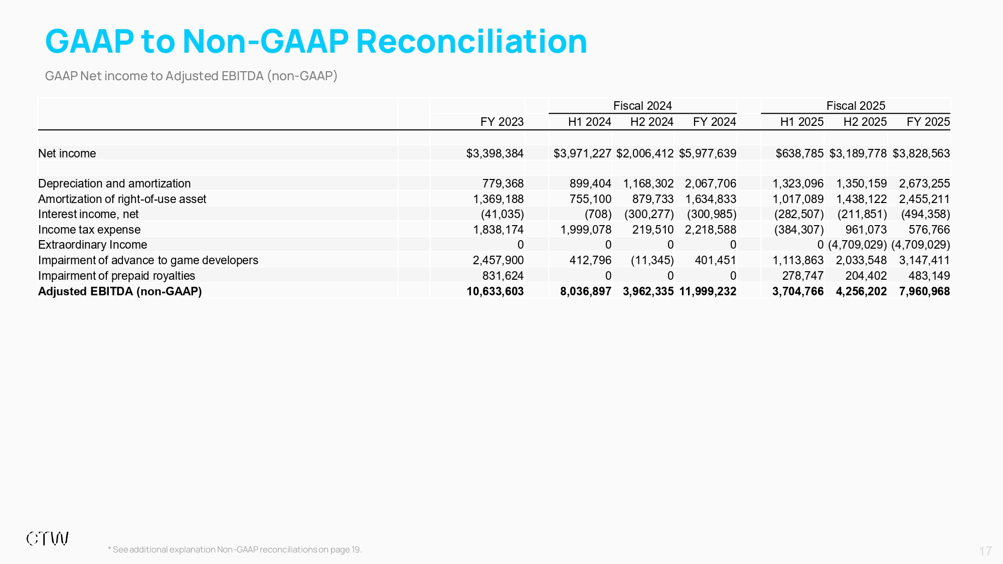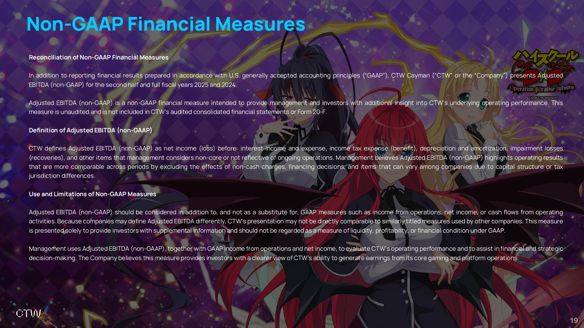 Non - GAAP Financial Measures 19 Reconciliation of Non - GAAP Financial Measures In addition to reporting financial results prepared in accordance with U.S. generally accepted accounting principles (“GAAP”), CTW Cayman (“CTW” or the “Company”) presents Adjusted EBITDA (non - GAAP) for the second half and full fiscal years 2025 and 2024. Adjusted EBITDA (non - GAAP) is a non - GAAP financial measure intended to provide management and investors with additional insight into CTW’s underlying operating performance . This measure is unaudited and is not included in CTW’s audited consolidated financial statements or Form 20 - F . Definition of Adjusted EBITDA (non - GAAP) CTW defines Adjusted EBITDA (non - GAAP) as net income (loss) before : interest income and expense, income tax expense (benefit), depreciation and amortization, impairment losses (recoveries), and other items that management considers non - core or not reflective of ongoing operations . Management believes Adjusted EBITDA (non - GAAP) highlights operating results that are more comparable across periods by excluding the effects of non - cash charges, financing decisions, and items that can vary among companies due to capital structure or tax jurisdiction differences . Use and Limitations of Non - GAAP Measures Adjusted EBITDA (non - GAAP) should be considered in addition to, and not as a substitute for, GAAP measures such as income from operations, net income, or cash flows from operating activities . Because companies may define Adjusted EBITDA differently, CTW’s presentation may not be directly comparable to similarly titled measures used by other companies . This measure is presented solely to provide investors with supplemental information and should not be regarded as a measure of liquidity, profitability, or financial condition under GAAP . Management uses Adjusted EBITDA (non - GAAP), together with GAAP income from operations and net income, to evaluate CTW’s operating performance and to assist in financial and strategic decision - making . The Company believes this measure provides investors with a clearer view of CTW’s ability to generate earnings from its core gaming and platform operations .