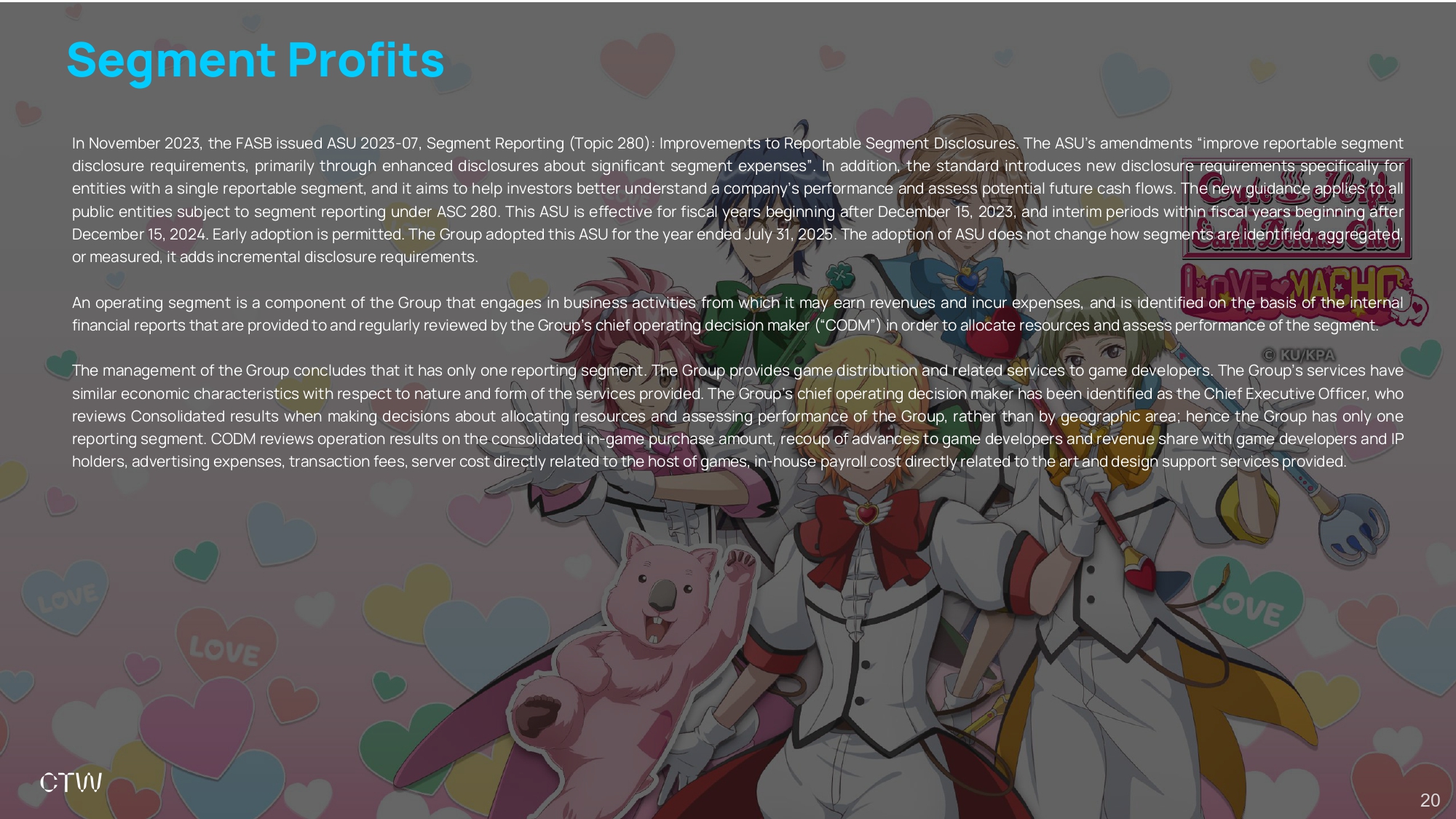 Segment Profits 20 In November 2023 , the FASB issued ASU 2023 - 07 , Segment Reporting (Topic 280 ) : Improvements to Reportable Segment Disclosures . The ASU’s amendments “improve reportable segment disclosure requirements, primarily through enhanced disclosures about significant segment expenses” . In addition, the standard introduces new disclosure requirements specifically for entities with a single reportable segment, and it aims to help investors better understand a company’s performance and assess potential future cash flows . The new guidance applies to all public entities subject to segment reporting under ASC 280 . This ASU is effective for fiscal years beginning after December 15 , 2023 , and interim periods within fiscal years beginning after December 15 , 2024 . Early adoption is permitted . The Group adopted this ASU for the year ended July 31 , 2025 . The adoption of ASU does not change how segments are identified, aggregated, or measured, it adds incremental disclosure requirements . An operating segment is a component of the Group that engages in business activities from which it may earn revenues and incur expenses, and is identified on the basis of the internal financial reports that are provided to and regularly reviewed by the Group’s chief operating decision maker (“CODM”) in order to allocate resources and assess performance of the segment . The management of the Group concludes that it has only one reporting segment . The Group provides game distribution and related services to game developers . The Group’s services have similar economic characteristics with respect to nature and form of the services provided . The Group’s chief operating decision maker has been identified as the Chief Executive Officer, who reviews Consolidated results when making decisions about allocating resources and assessing performance of the Group, rather than by geographic area ; hence the Group has only one reporting segment . CODM reviews operation results on the consolidated in - game purchase amount, recoup of advances to game developers and revenue share with game developers and IP holders, advertising expenses, transaction fees, server cost directly related to the host of games, in - house payroll cost directly related to the art and design support services provided .