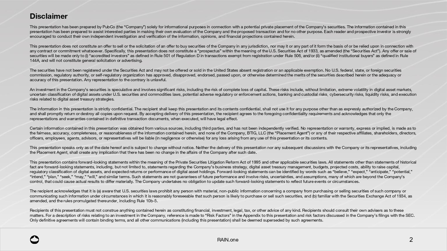 RAIN Treasury Strategy PubCo BUILT ON Disclaimer This presentation has been prepared by PubCo (the “Company”) solely for informational purposes in connection with a potential private placement of the Company’s securities.