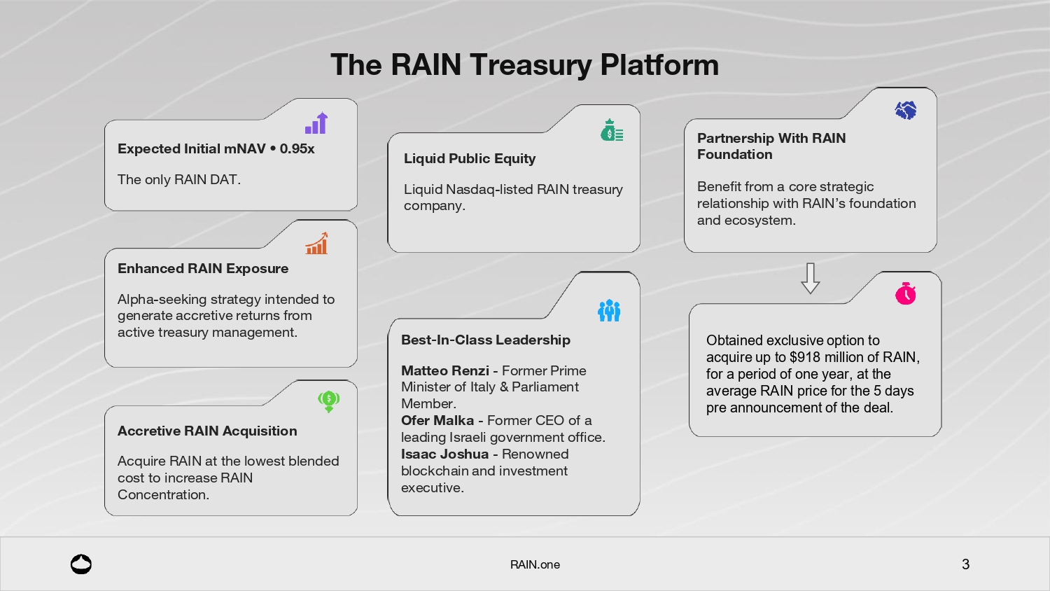 RAIN.one 2 The RAIN Treasury Platform Expected Initial mNAV • 0.95x The only RAIN DAT. Accretive RAIN Acquisition Acquire RAIN at the lowest blended cost to increase RAIN Concentration. Best - In - Class Leadership Matteo Renzi - Former Prime Minister of Italy & Parliament Member. Ofer Malka - Former CEO of a leading Israeli government office. Isaac Joshua - Renowned blockchain and investment executive. Enhanced RAIN Exposure Alpha - seeking strategy intended to generate accretive returns from active treasury management. Liquid Public Equity Liquid Nasdaq - listed RAIN treasury company. Partnership With RAIN Foundation Benefit from a core strategic relationship with RAIN’s foundation and ecosystem. Obtained exclusive option to acquire up to $918 million of RAIN, for a period of one year, at the average RAIN price for the 5 days pre announcement of the deal.
