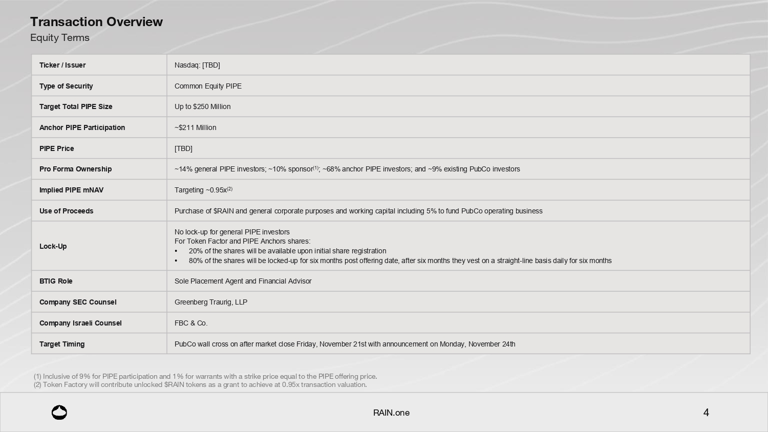 RAIN.one 3 Nasdaq: [TBD] Ticker / Issuer Common Equity PIPE Type of Security Up to $250 Million Target Total PIPE Size ~$211 Million Anchor PIPE Participation [TBD] PIPE Price ~14% general PIPE investors; ~10% sponsor (1) ; ~68% anchor PIPE investors; and ~9% existing PubCo investors Pro Forma Ownership Targeting ~0.95x (2) Implied PIPE mNAV Purchase of $RAIN and general corporate purposes and working capital including 5% to fund PubCo operating business Use of Proceeds No lock - up for general PIPE investors For Token Factor and PIPE Anchors shares: • 20% of the shares will be available upon initial share registration • 80% of the shares will be locked - up for six months post offering date, after six months they vest on a straight - line basis daily for six months Lock - Up Sole Placement Agent and Financial Advisor BTIG Role Greenberg Traurig, LLP Company SEC Counsel FBC & Co. Company Israeli Counsel PubCo wall cross on after market close Friday, November 21st with announcement on Monday, November 24th Target Timing Transaction Overview Equity Terms (1) Inclusive of 9% for PIPE participation and 1% for warrants with a strike price equal to the PIPE offering price. (2) Token Factory will contribute unlocked $RAIN tokens as a grant to achieve at 0.95x transaction valuation. RAIN.one 4 Our Advisors Matteo advises PubCo on engaging sovereign wealth funds and governments to develop national crypto treasury strategies, including the adoption of the PubCo strategy.