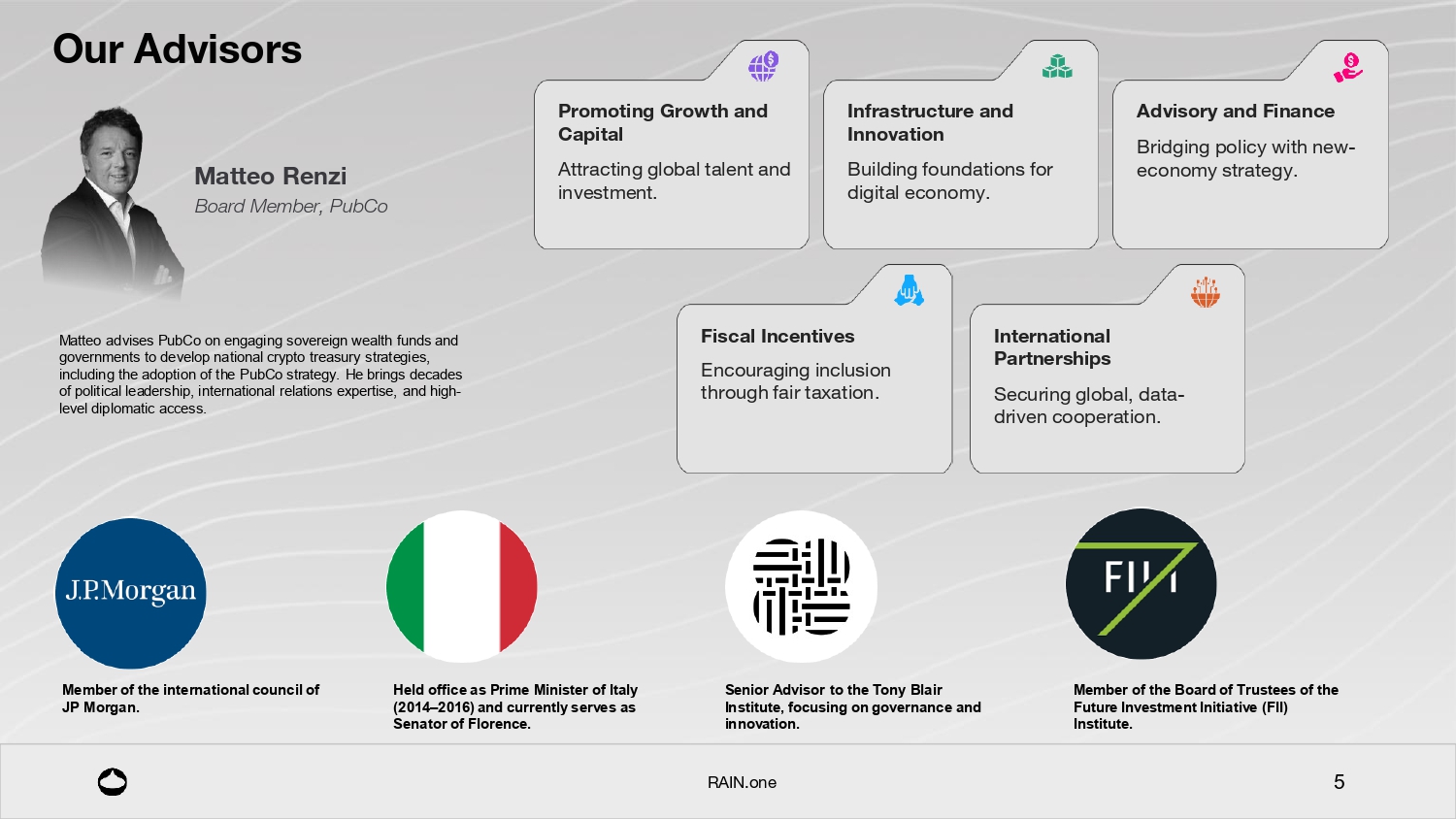 He brings decades of political leadership, international relations expertise, and high - level diplomatic access. Matteo Renzi Board Member, PubCo Member of the international council of JP Morgan. Promoting Growth and Capital Attracting global talent and investment. Infrastructure and Innovation Building foundations for digital economy. Fiscal Incentives Encouraging inclusion through fair taxation. International Partnerships Securing global, data - driven cooperation. Advisory and Finance Bridging policy with new - economy strategy. Held office as Prime Minister of Italy ( 2014 – 2016 ) and currently serves as Senator of Florence . RAIN.one 5 Senior Advisor to the Tony Blair Institute, focusing on governance and innovation. Member of the Board of Trustees of the Future Investment Initiative (FII) Institute.