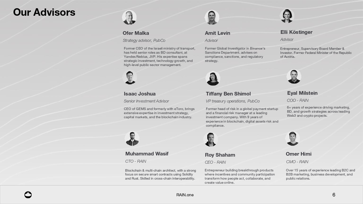 Our Advisors Entrepreneur, Supervisory Board Member & Investor. Former Federal Minister of the Republic of Austria. Ofer Malka Strategy advisor, PubCo Former CEO of the Israeli ministry of transport, has held senior roles as BD consultant, at Yandex/Nebius, JVP. His expertise spans strategic investment, technology growth, and high - level public sector management. Amit Levin Advisor Former Global Investigator in Binance’s Sanctions Department. advises on compliance, sanctions, and regulatory strategy. Elli Köstinger Advisor Omer Himi CMO - RAIN Over 15 years of experience leading B2C and B2B marketing, business development, and public relations. Eyal Milstein COO - RAIN 6 + years of experience driving marketing, BD, and growth strategies across leading Web 3 and crypto projects . Muhammad Wasif CTO - RAIN Blockchain & multi - chain architect, with a strong focus on secure smart contracts using Solidity and Rust. Skilled in cross - chain interoperability. Isaac Joshua Senior Investment Advisor CEO of GEMS and formerly with eToro, brings extensive expertise in investment strategy, capital markets, and the blockchain industry. Roy Shaham CEO - RAIN Entrepreneur building breakthrough products where incentives and community participation transform how people act, collaborate, and create value online. RAIN.one 6 Tiffany Ben Shimol VP treasury operations, PubCo Former head of risk in a global payment startup and a financial risk manager at a leading investment company. With 9 years of experience in blockchain, digital assets risk and compliance.