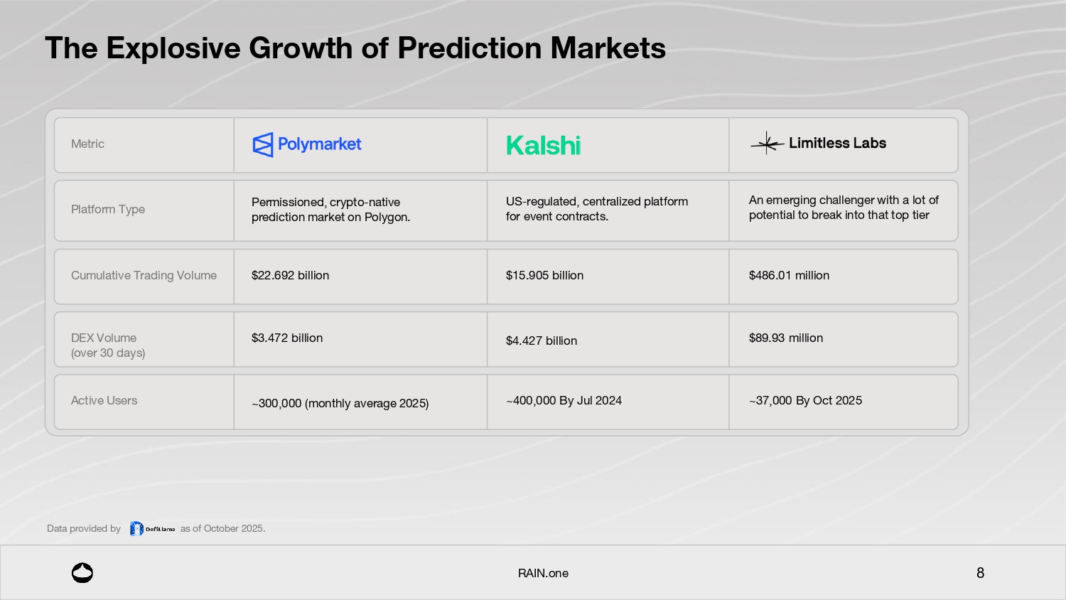 Permissioned, crypto - native prediction market on Polygon. Platform Type $486.01 million $15.905 billion $22.692 billion Cumulative Trading Volume $89.93 million $4.427 billion $3.472 billion DEX Volume (over 30 days) ~37,000 By Oct 2025 ~400,000 By Jul 2024 ~300,000 (monthly average 2025) Active Users The Explosive Growth of Prediction Markets Data provided by RAIN.one 8 as of October 2025.