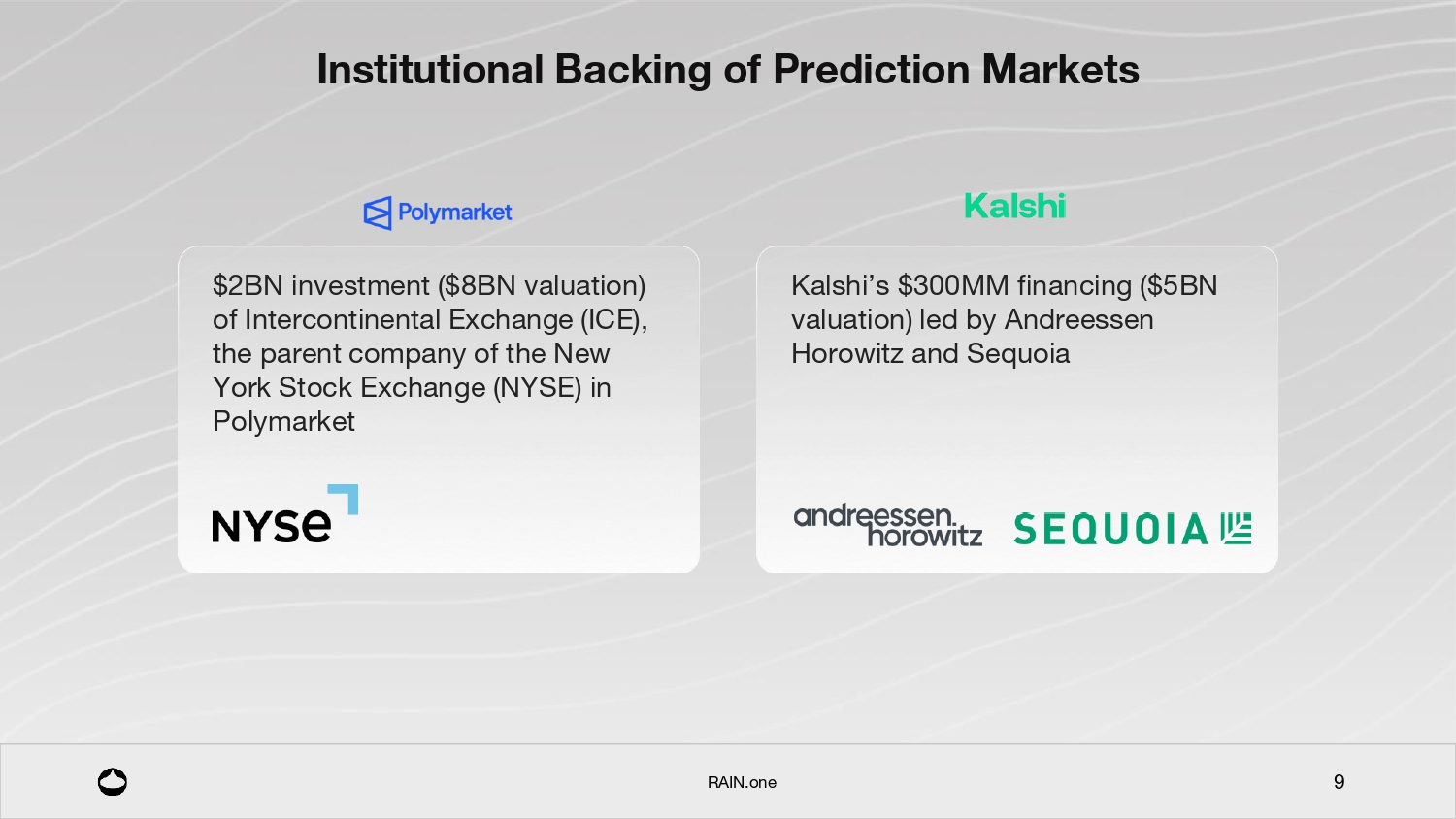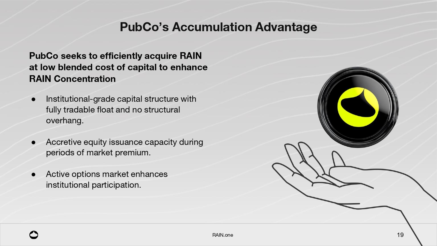 RAIN.one 18 PubCo’s Accumulation Advantage PubCo seeks to efficiently acquire RAIN at low blended cost of capital to enhance RAIN Concentration ● Institutional - grade capital structure with fully tradable float and no structural overhang. ● Accretive equity issuance capacity during periods of market premium. ● Active options market enhances institutional participation. RAIN.one 19 CONCLUSION Prediction markets are expected to mature into a legitimate asset class.