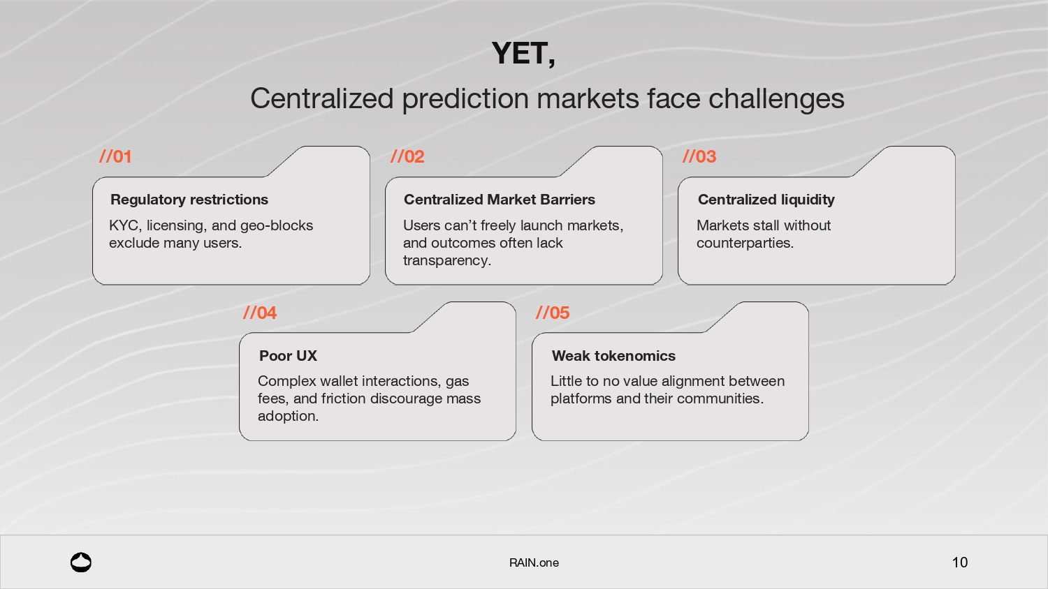 Institutional Backing of Prediction Markets $2BN investment ($8BN valuation) of Intercontinental Exchange (ICE), the parent company of the New York Stock Exchange (NYSE) in Polymarket Kalshi’s $300MM financing ($5BN valuation) led by Andreessen Horowitz and Sequoia RAIN.one 9 YET, //01 Centralized prediction markets face challenges //02 //03 //05 //04 Regulatory restrictions KYC, licensing, and geo - blocks exclude many users.