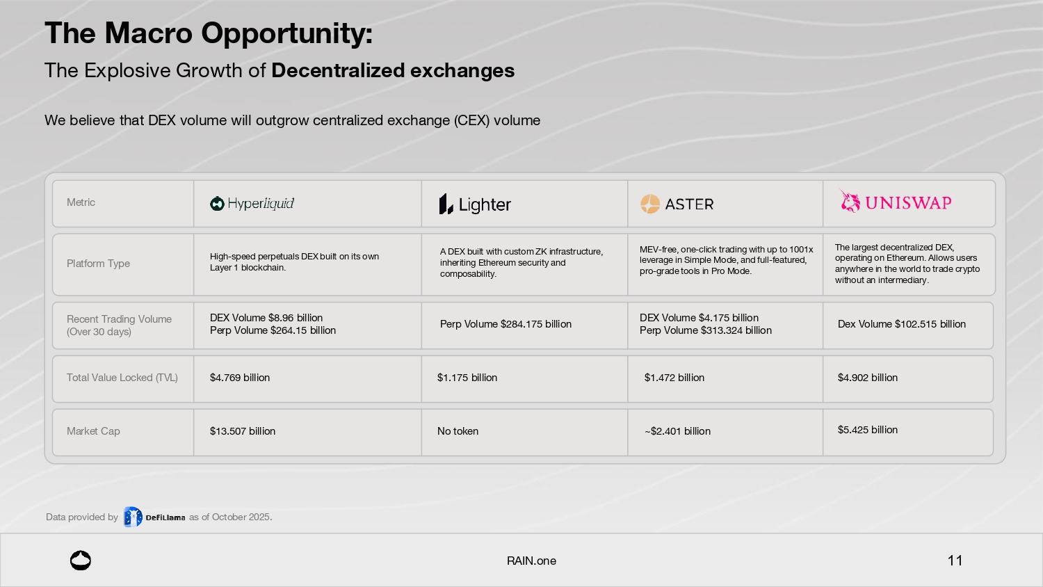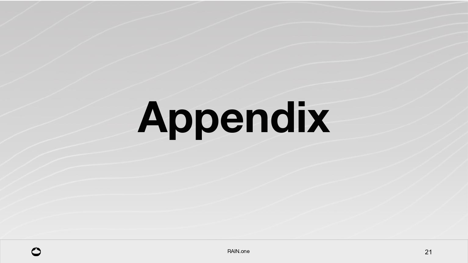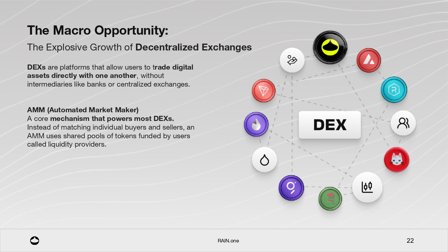RAIN.one 20 The Macro Opportunity: The Explosive Growth of Decentralized Exchanges DEXs are platforms that allow users to t rade digital assets directly with one another , without intermediaries like banks or centralized exchanges. AMM (Automated Market Maker) A core mechanism that powers most DEXs. Instead of matching individual buyers and sellers, an AMM uses shared pools of tokens funded by users called liquidity providers. RAIN.one 22 $3.337B Polymarket’s 30 day volume î 2.5% $83,425,000 buyback & burn of $RAIN Deflationary mechanism impact on $RAIN - simulation: Data provided by as of October 2025.