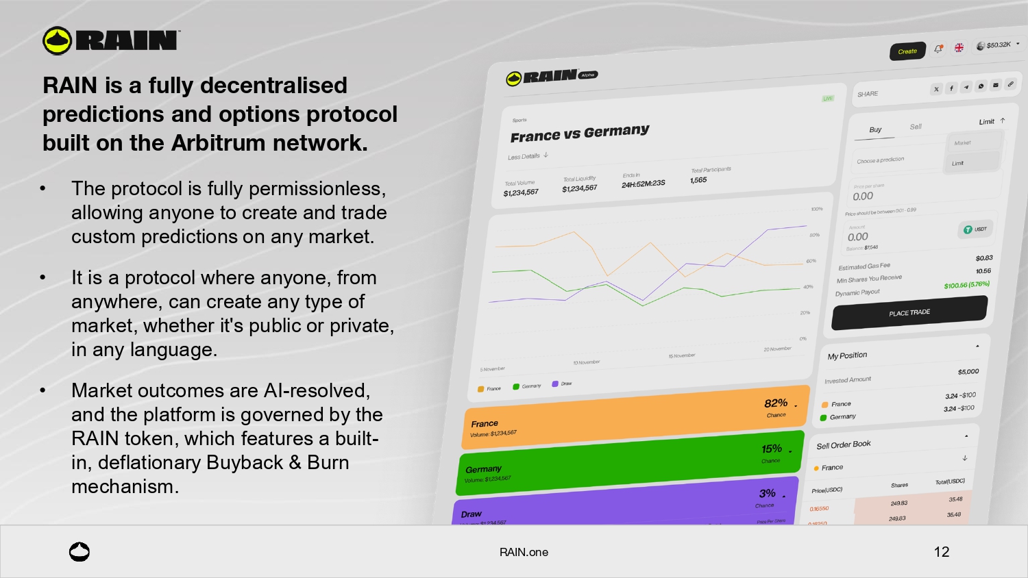 RAIN is a fully decentralized predictions and options protocol built on the Arbitrum network. The protocol is fully permissionless, allowing anyone to create and trade custom options on any market. Market outcomes can be AI-resolved, and the platform is governed by the RAIN token, which features a built-in, deflationary Buyback & Burn mechanism. Designed to be the “Uniswap” of prediction markets, RAIN is a protocol where anyone, from anywhere, can create any type of market, whether it's public or private, in any language.