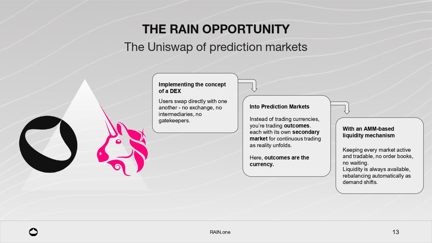 • The protocol is fully permissionless, allowing anyone to create and trade custom predictions on any market . • It is a protocol where anyone, from anywhere, can create any type of market, whether it's public or private, in any language. • Market outcomes are AI - resolved, and the platform is governed by the RAIN token, which features a built - in, deflationary Buyback & Burn mechanism. RAIN.one 12 THE RAIN OPPORTUNITY The Uniswap of prediction markets Implementing the concept of a DEX Users swap directly with one another - no exchange, no intermediaries, no gatekeepers.