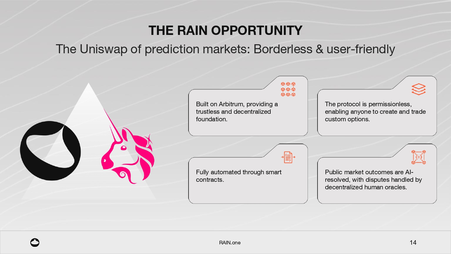 With an AMM - based liquidity mechanism Keeping every market active and tradable, no order books, no waiting. Liquidity is always available, rebalancing automatically as demand shifts . Into Prediction Markets Instead of trading currencies, you’re trading outcomes . each with its own secondary market for continuous trading as reality unfolds. Here, outcomes are the currency. RAIN.one 13 THE RAIN OPPORTUNITY The Uniswap of prediction markets: Borderless & user - friendly Built on Arbitrum, providing a trustless and decentralized foundation.